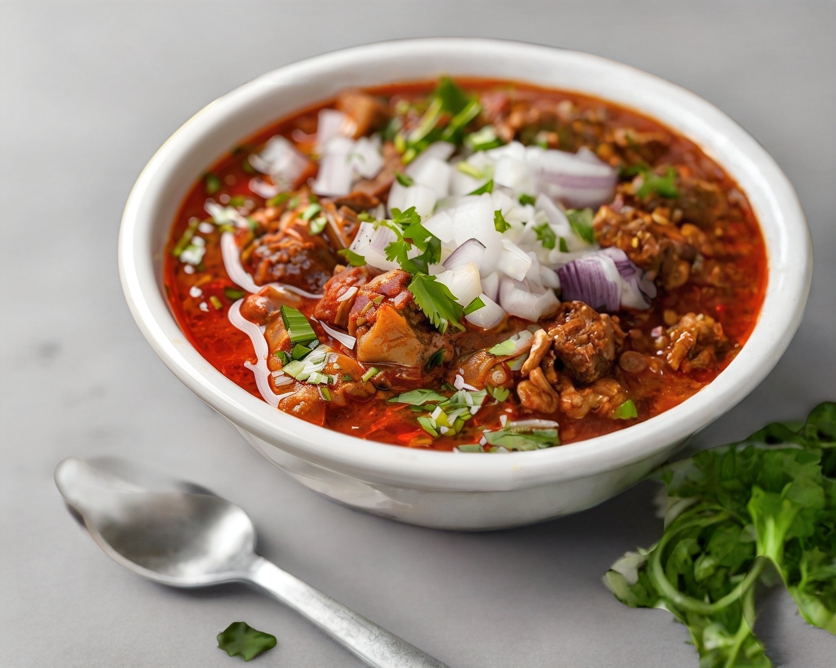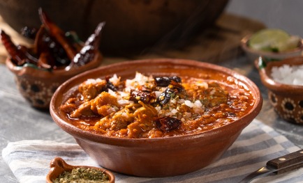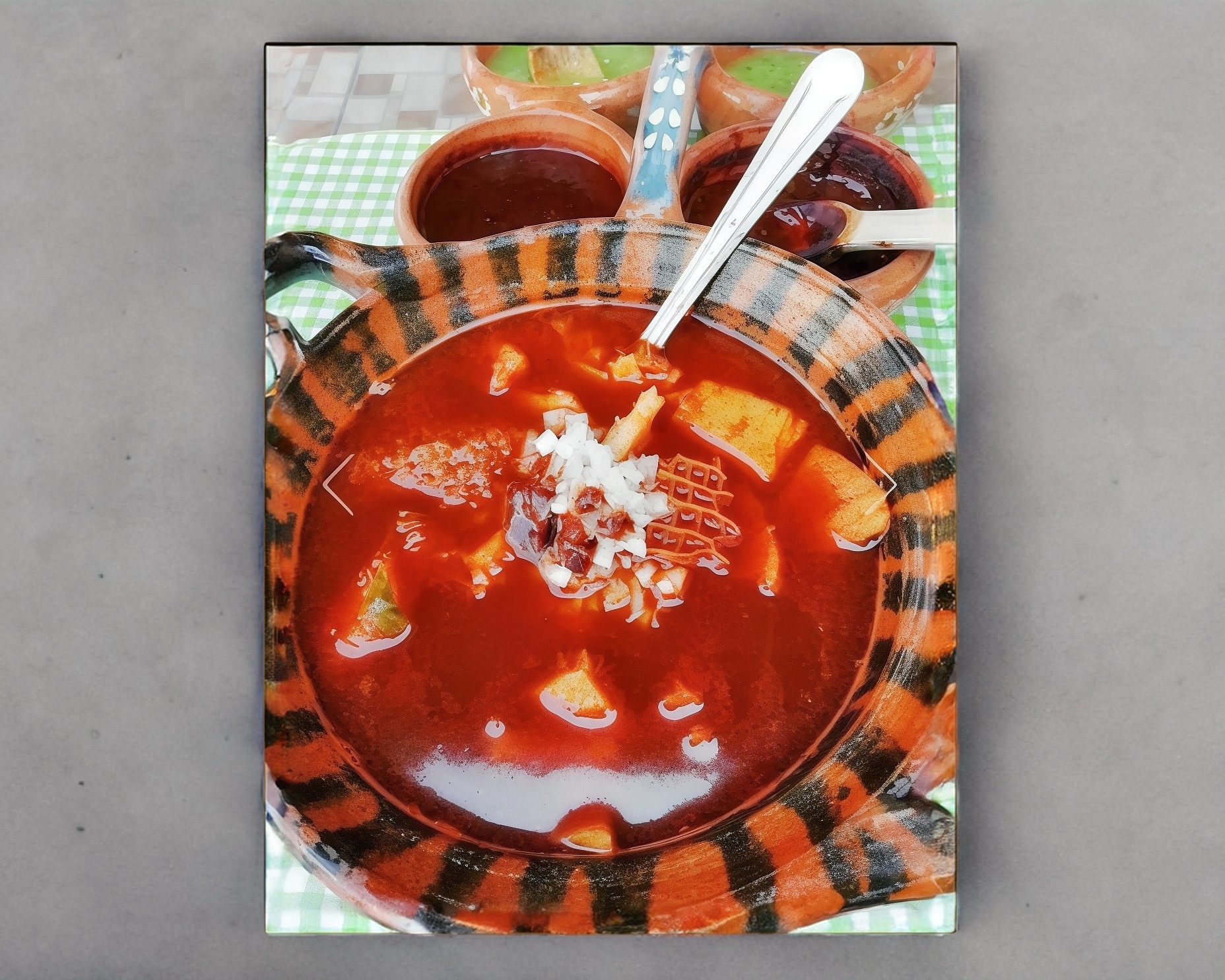 Boronas de pan en salsa especial con espinazo de cerdo, acompañadas de cebolla, limón, chile de árbol dorado y ajo fileteado dorado.