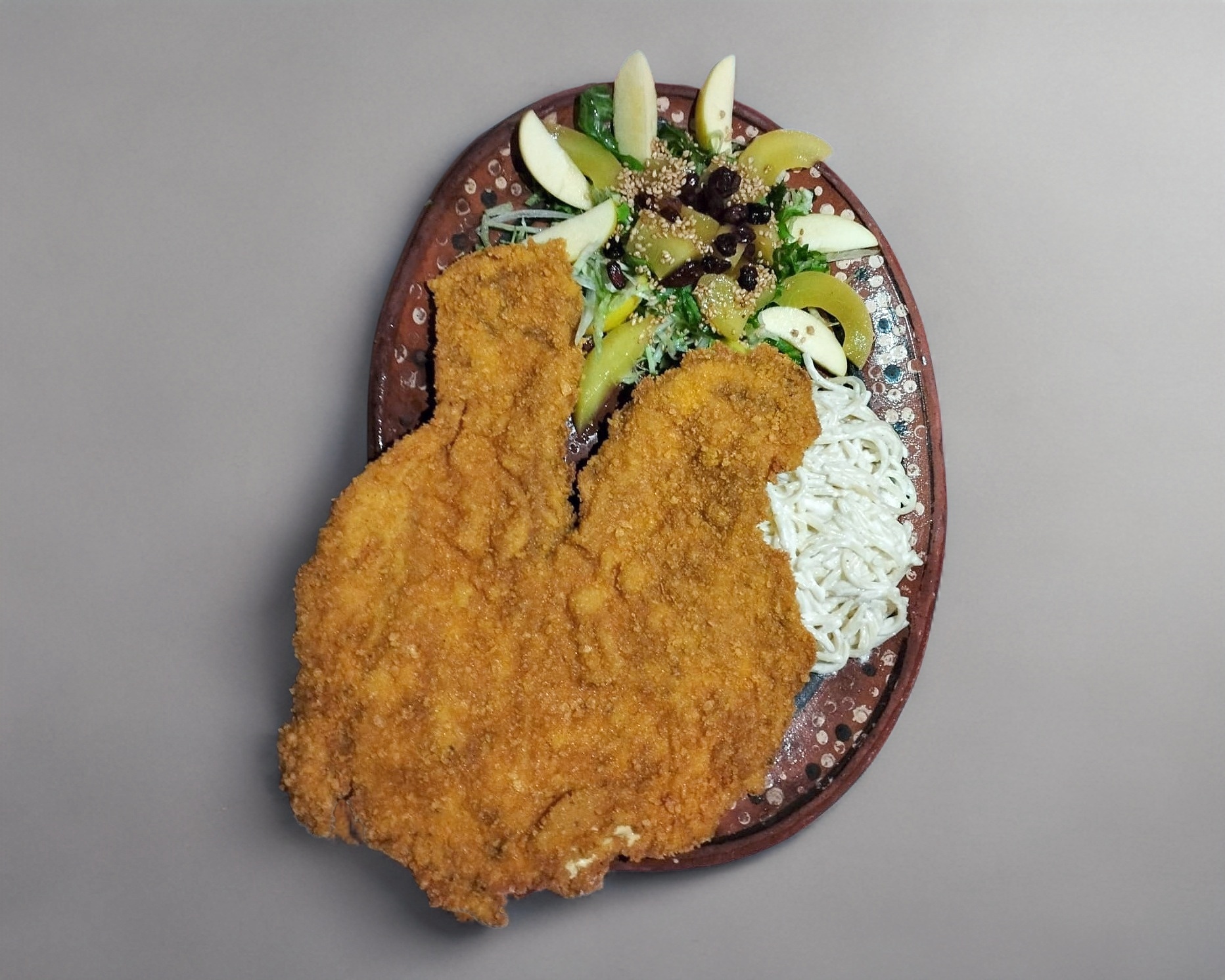 Pechuga empanizada, acompañada de ensalada dulce y pasta fría.