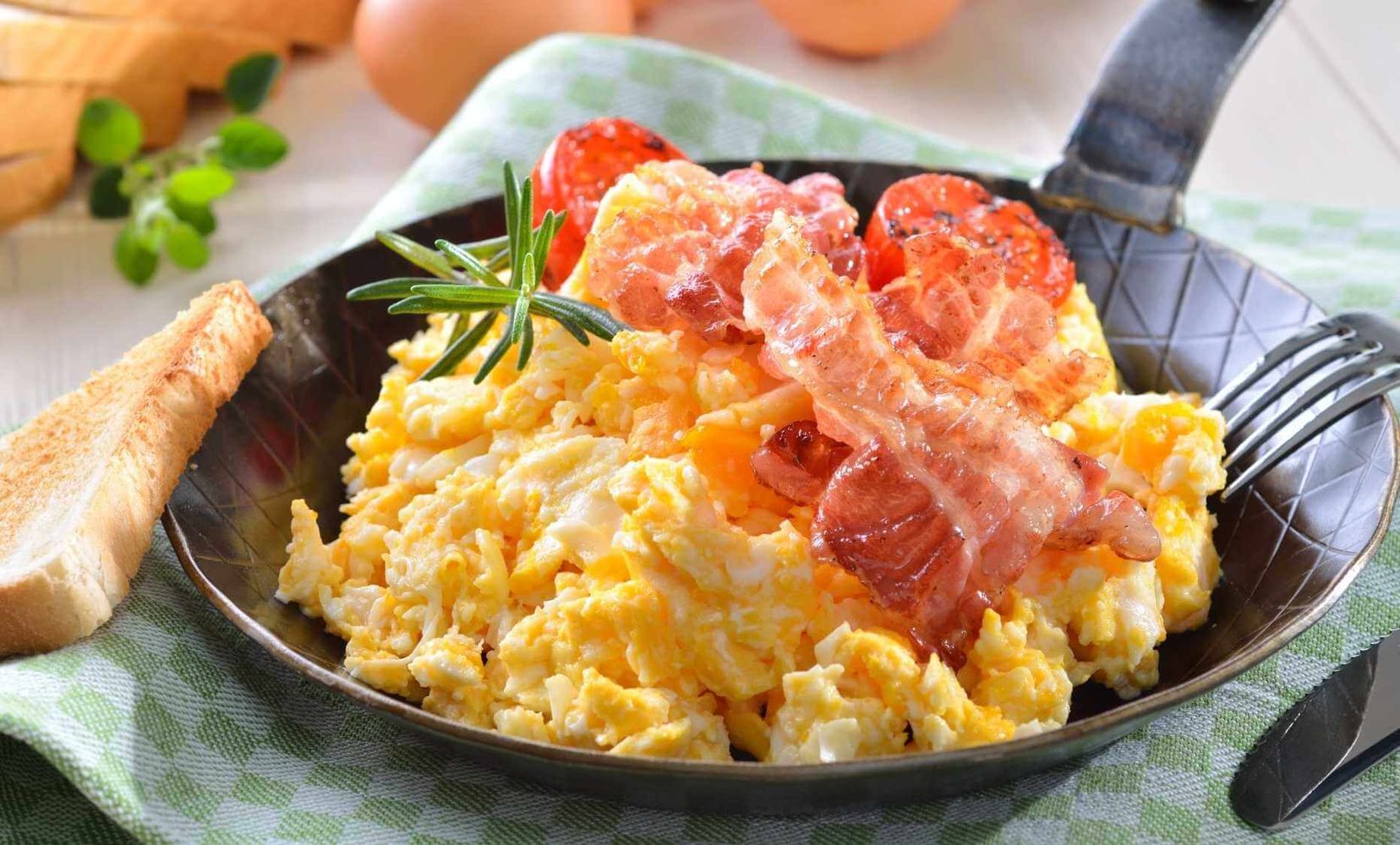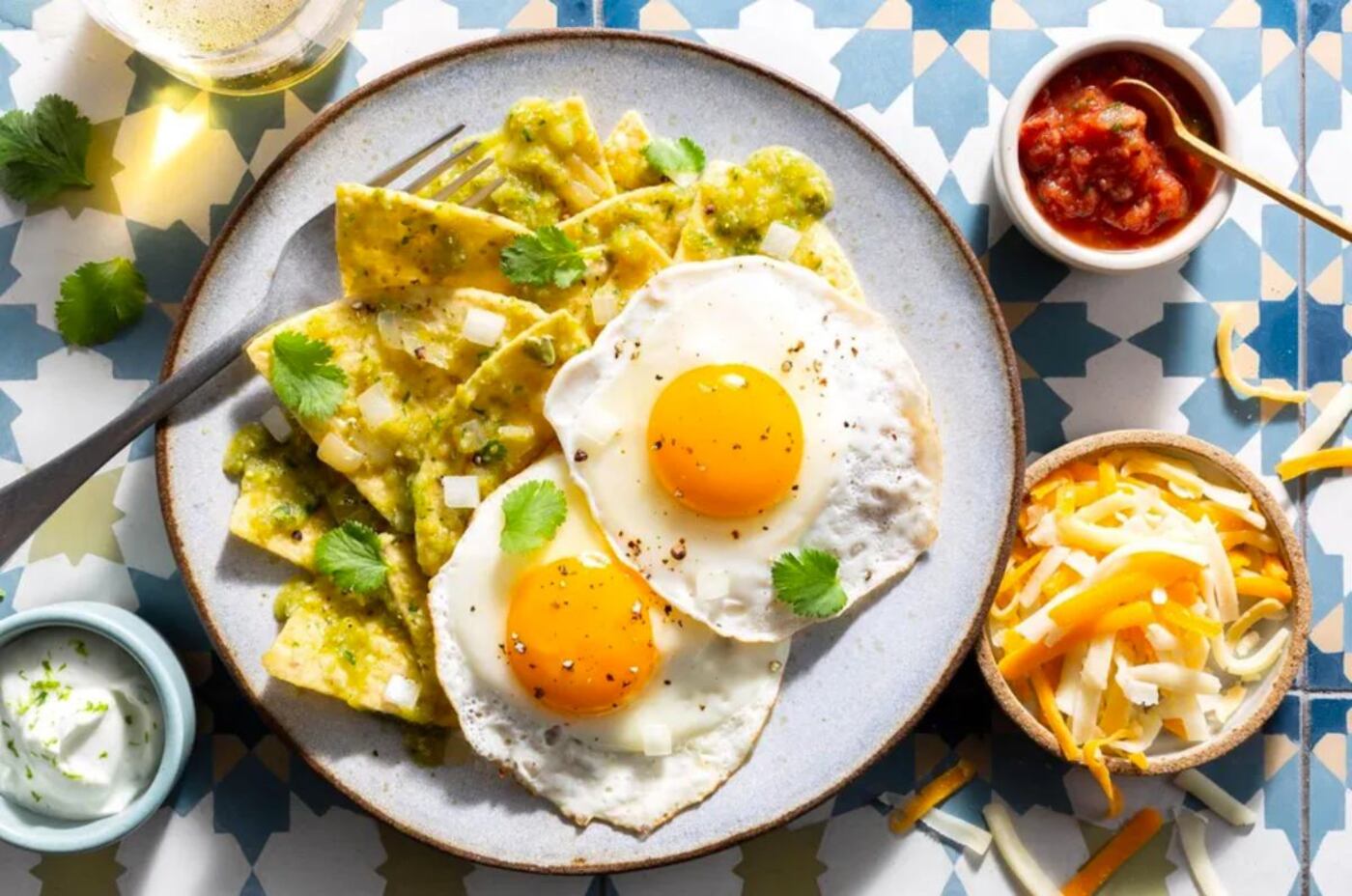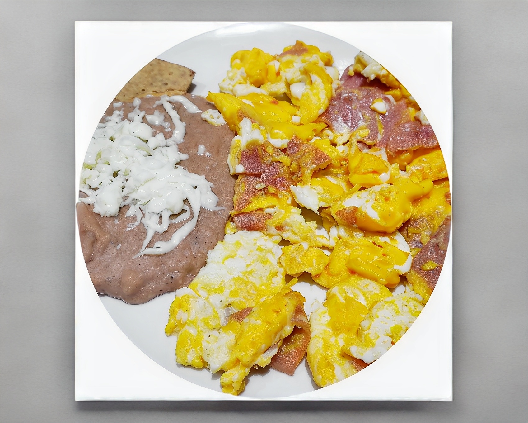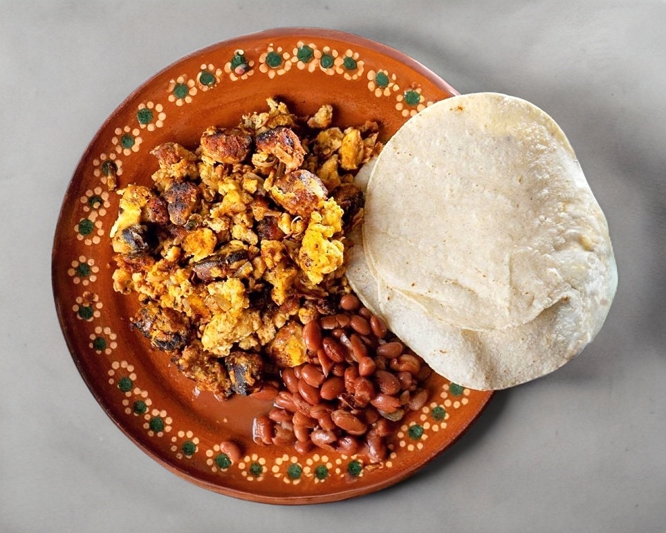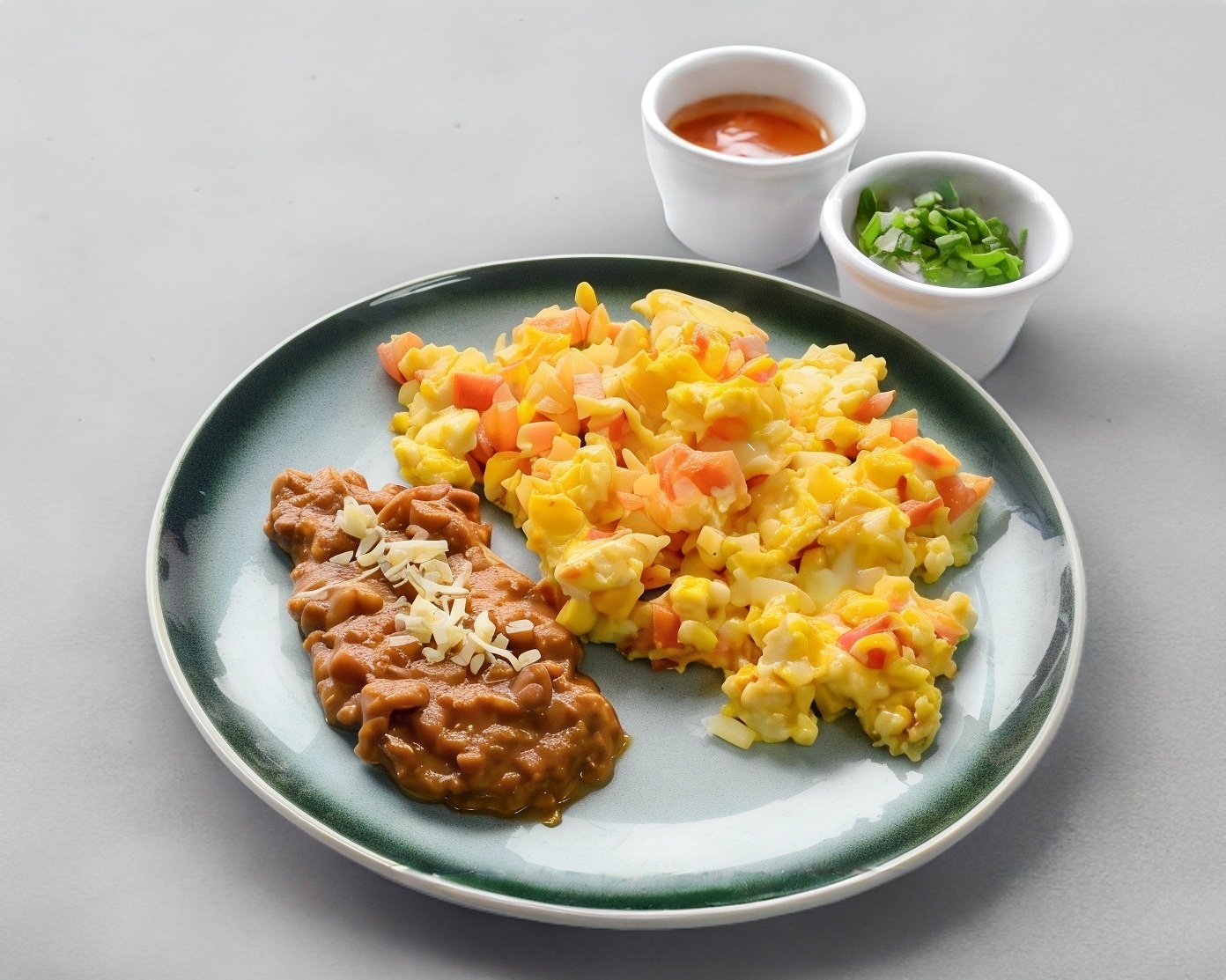 Huevos acompañados de porción de frijol y 5 tortillas.