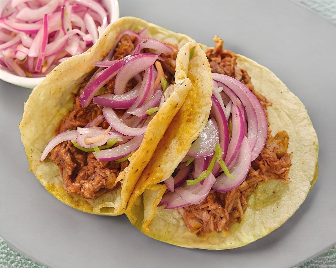 Dos tortillas de maíz con cochinita, cebolla morada y salsa de la casa.