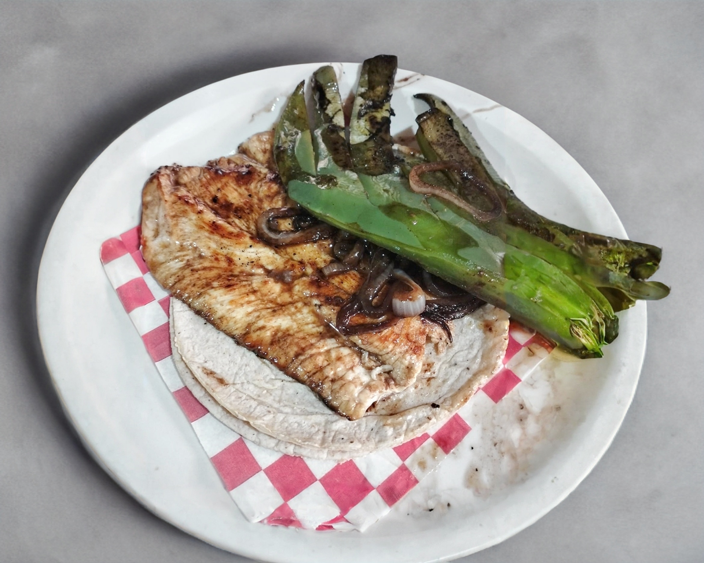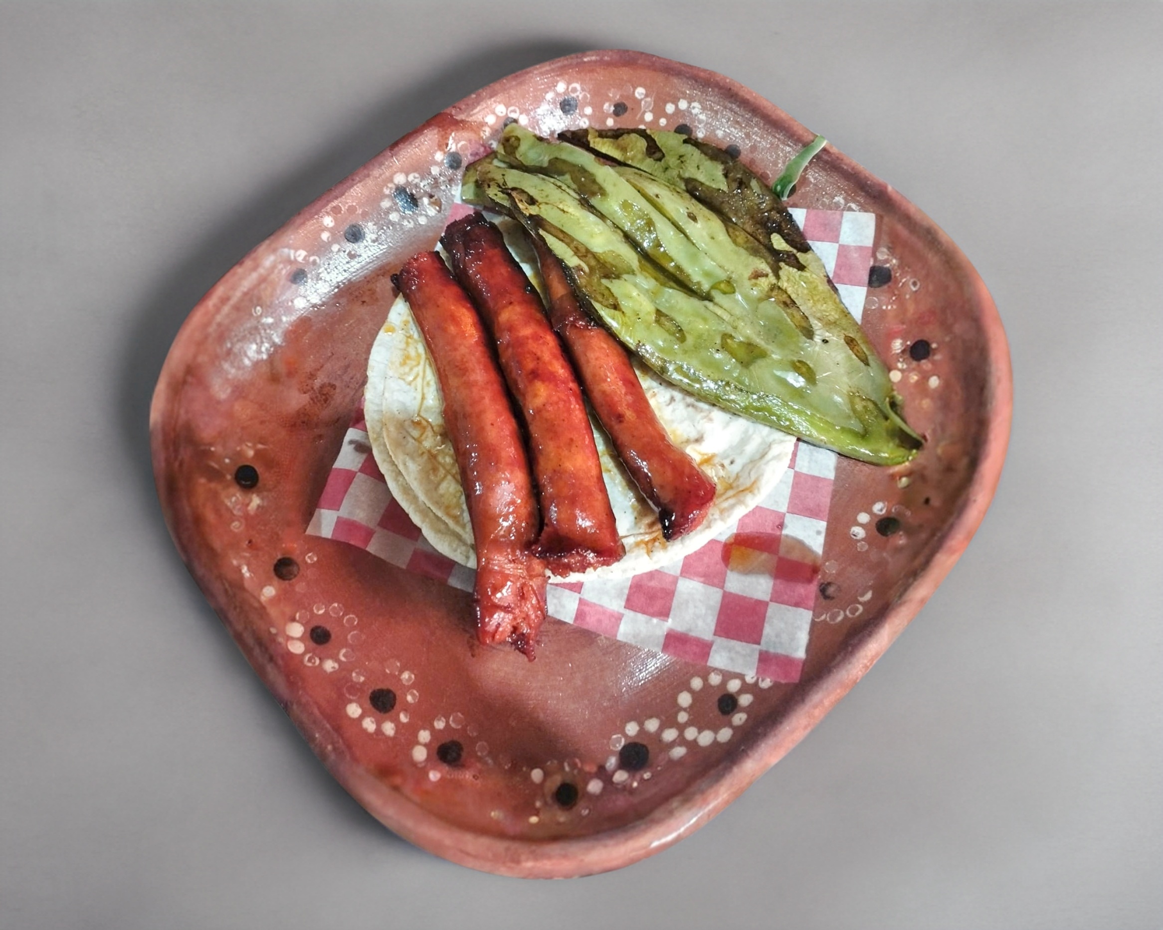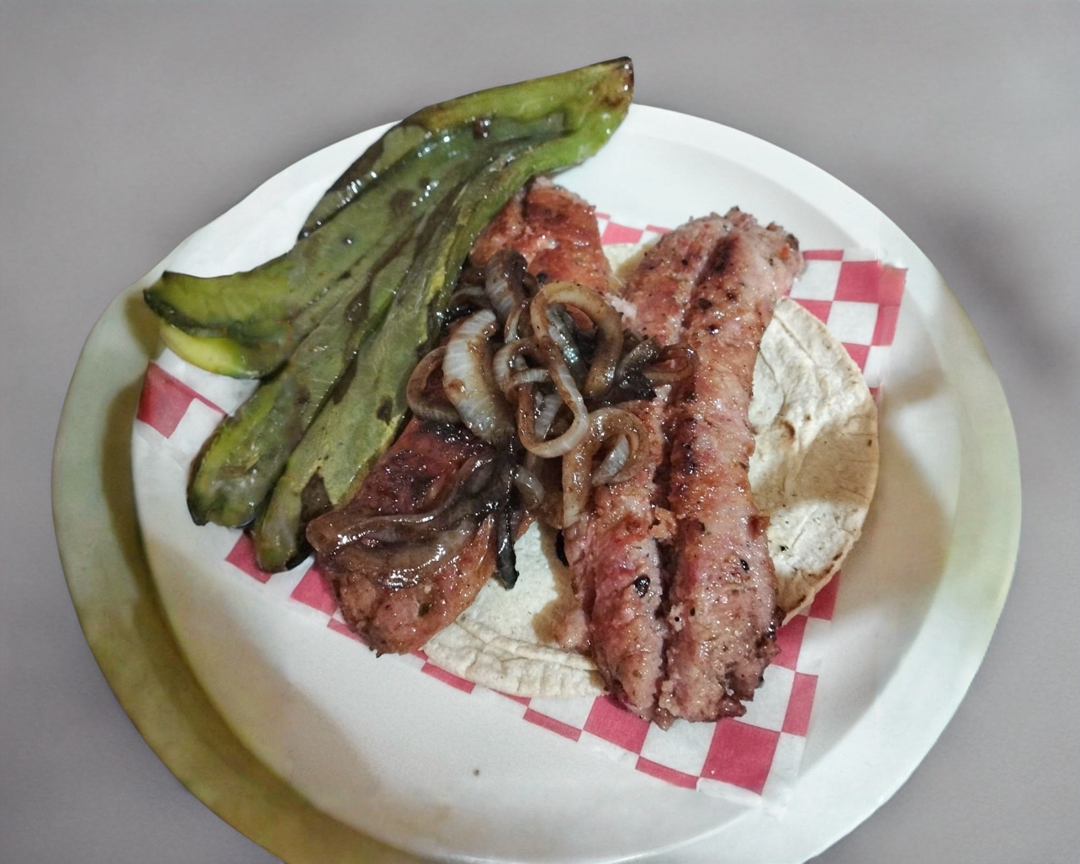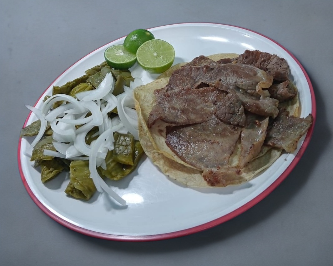 Dos tortillas de maíz, cebolla, nopal y salsa de la casa.
