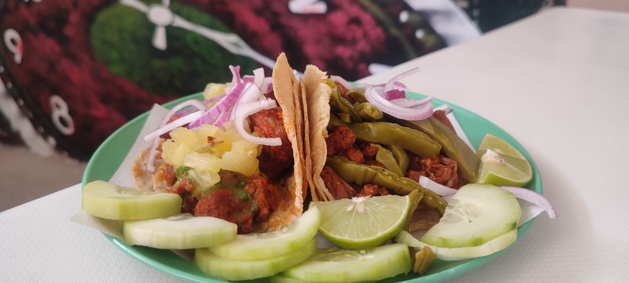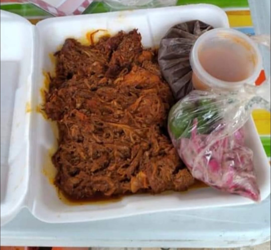 Cochinita, cebolla morada preparada, limones y salsa de la casa.