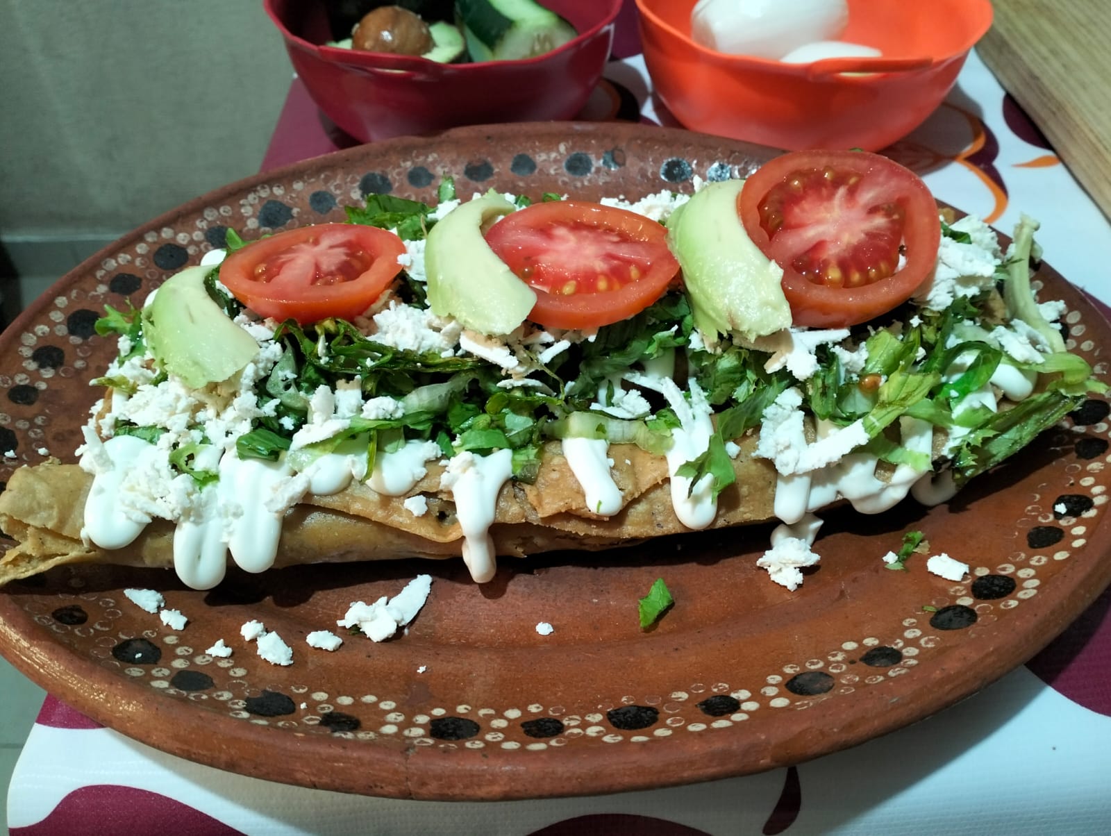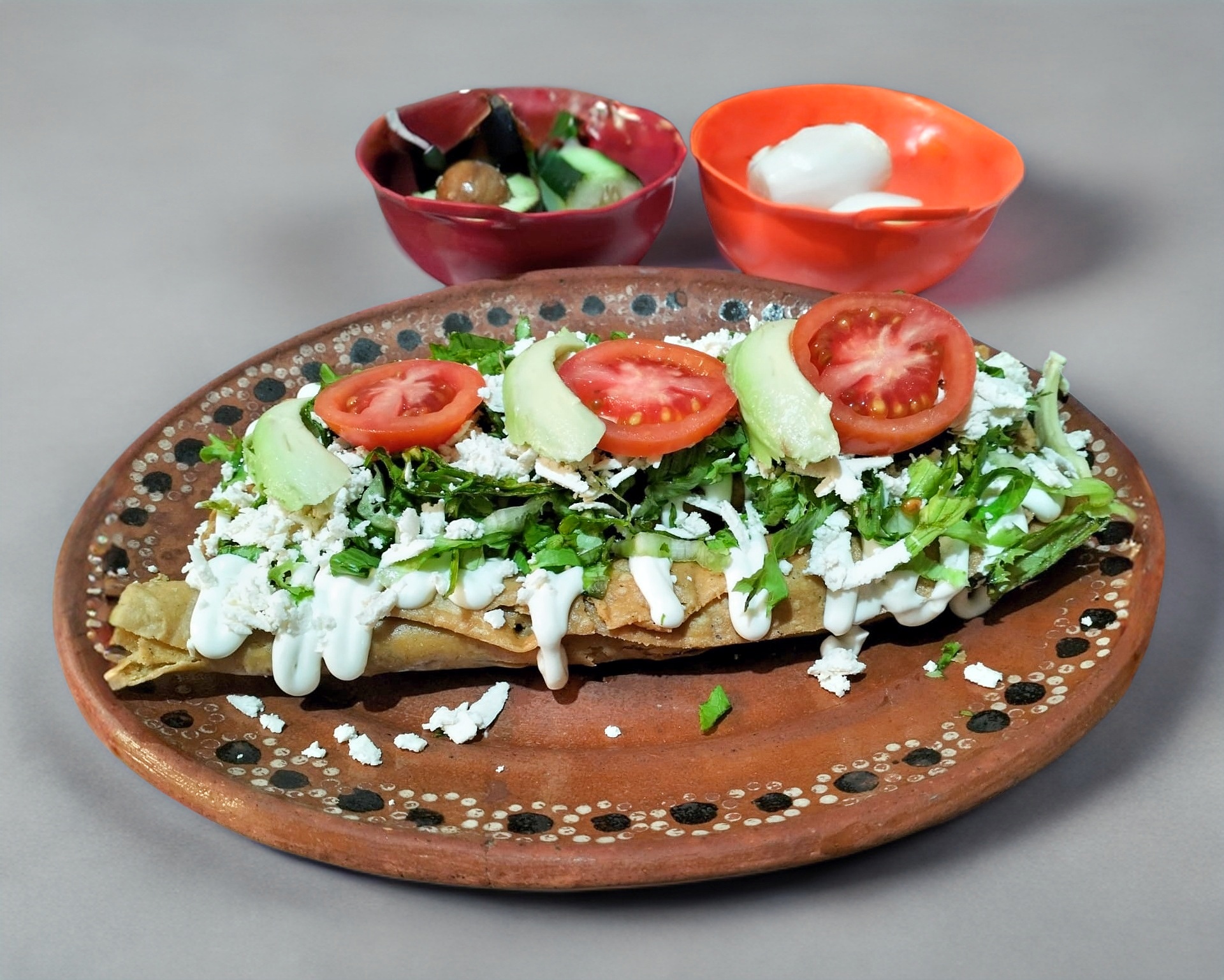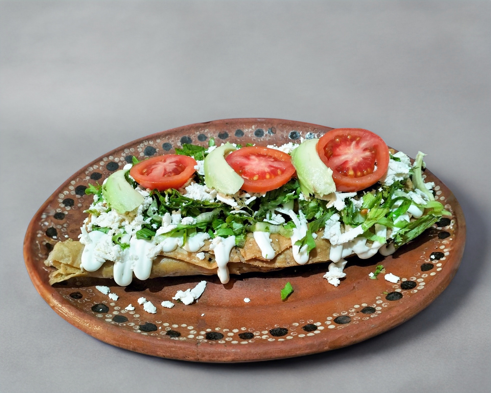 Tortilla de maíz 30 cm, con crema, lechuga, queso, jitomate y aguacate.