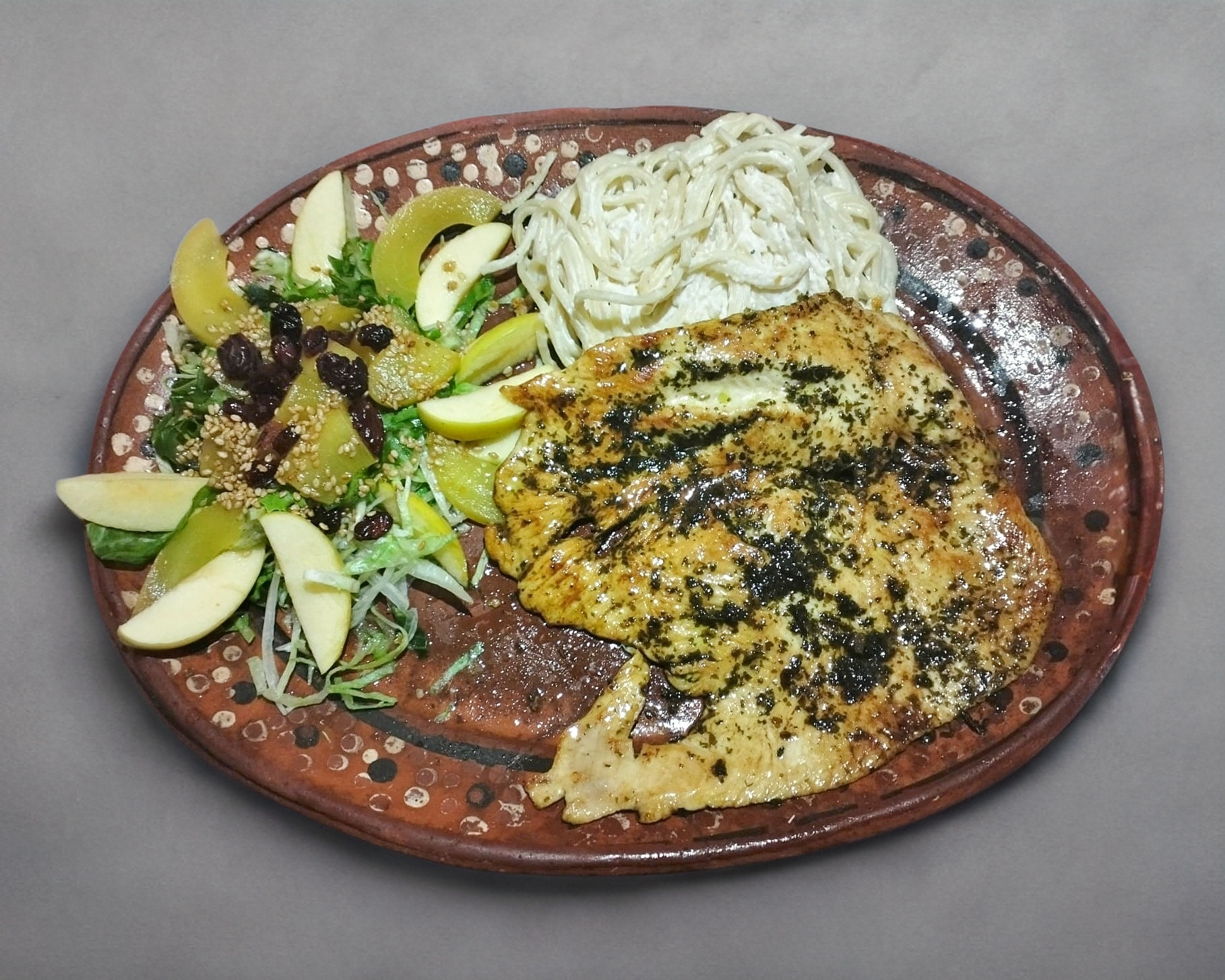 Pechuga asada en chimichurri, acompañada de ensalada dulce y pasta fría.
