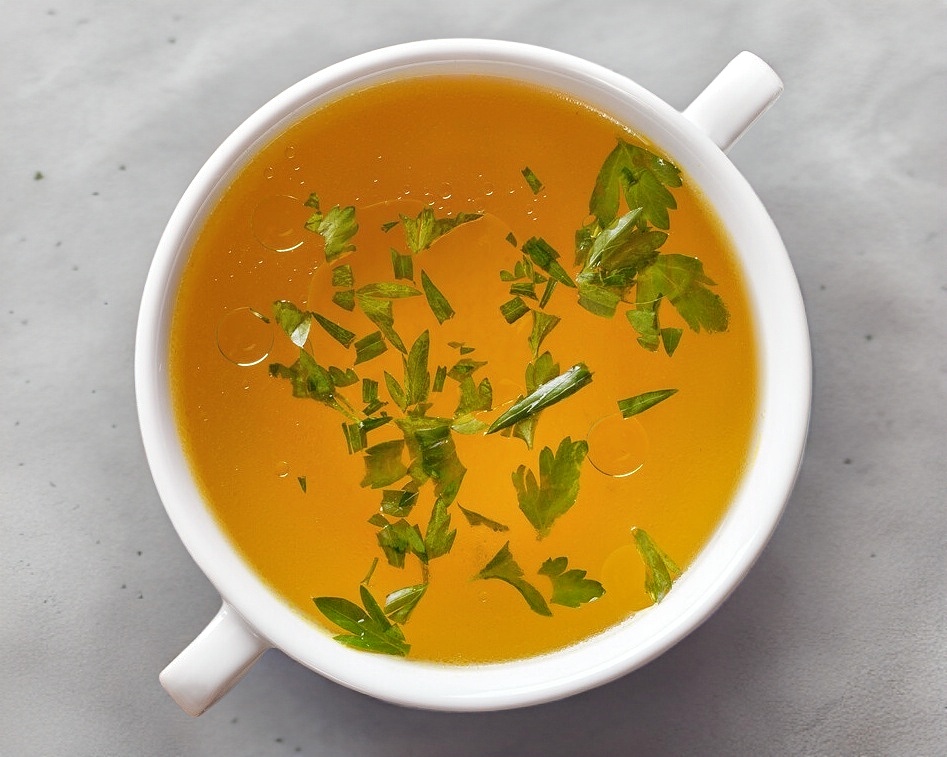 Consomé con arroz y garbanzo, cebolla, limón y salsa de la casa.