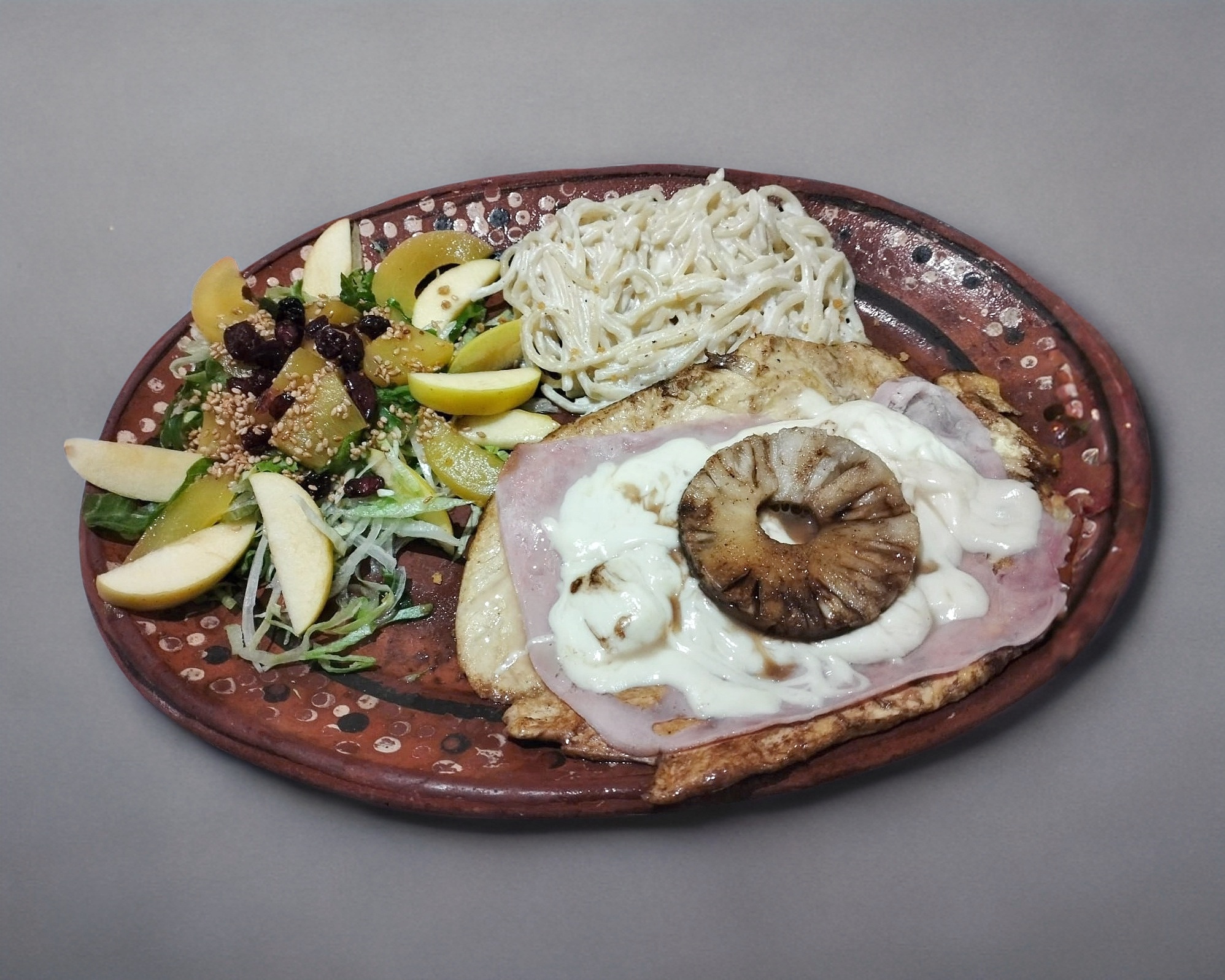 Pechuga, jamón, queso Oaxaca y piña, acompañada de ensalada dulce y pasta fría.
