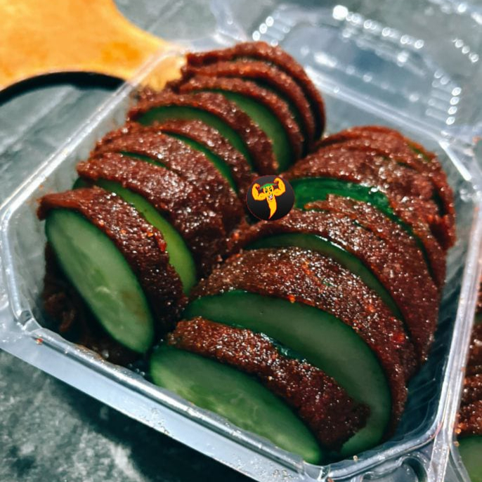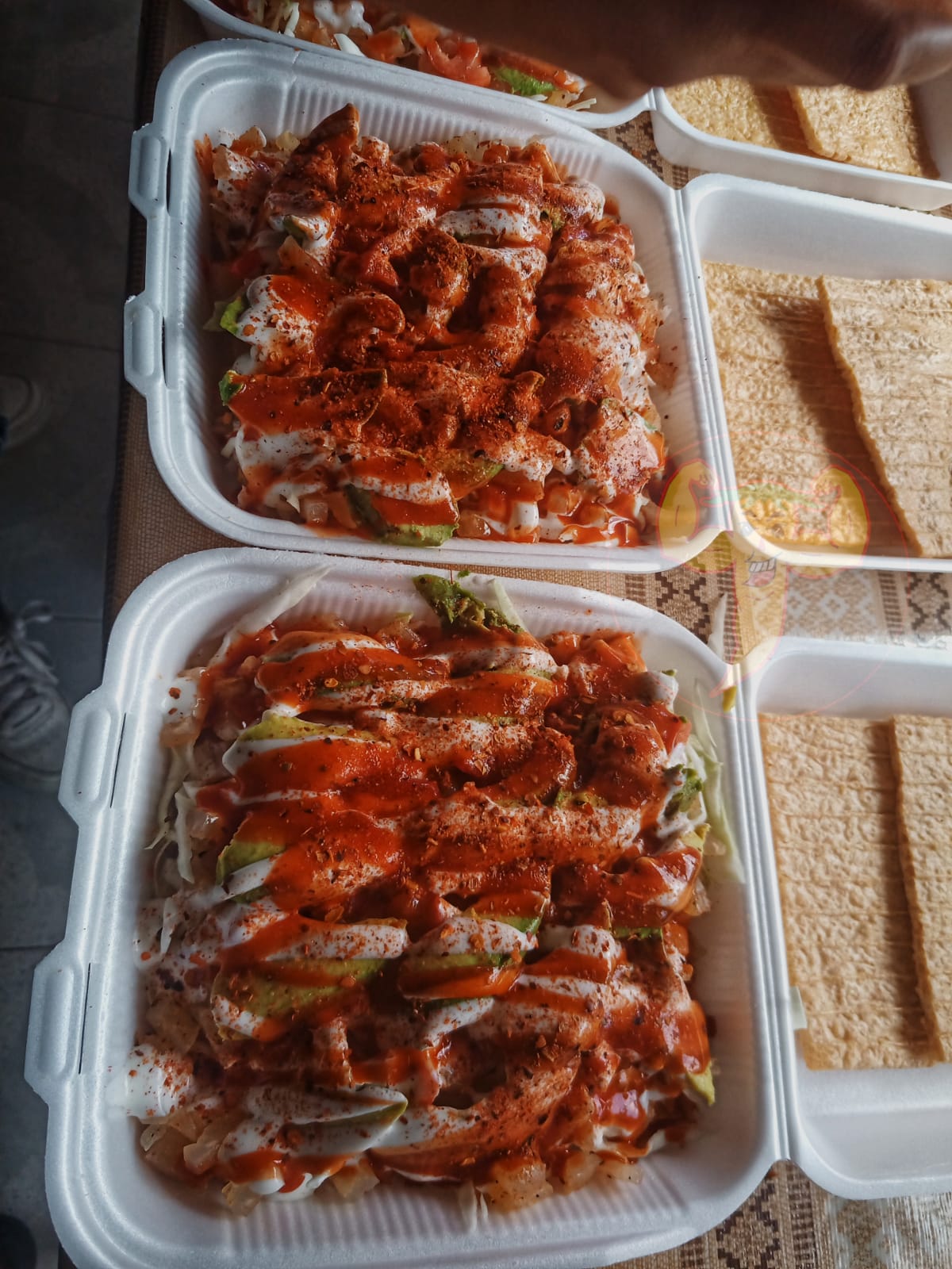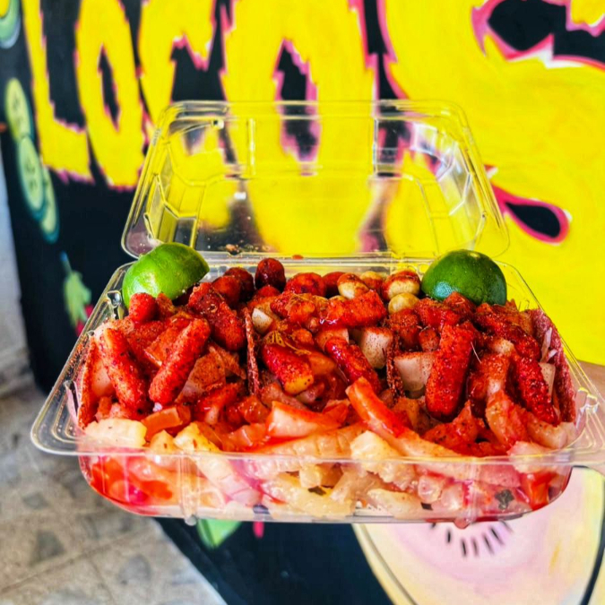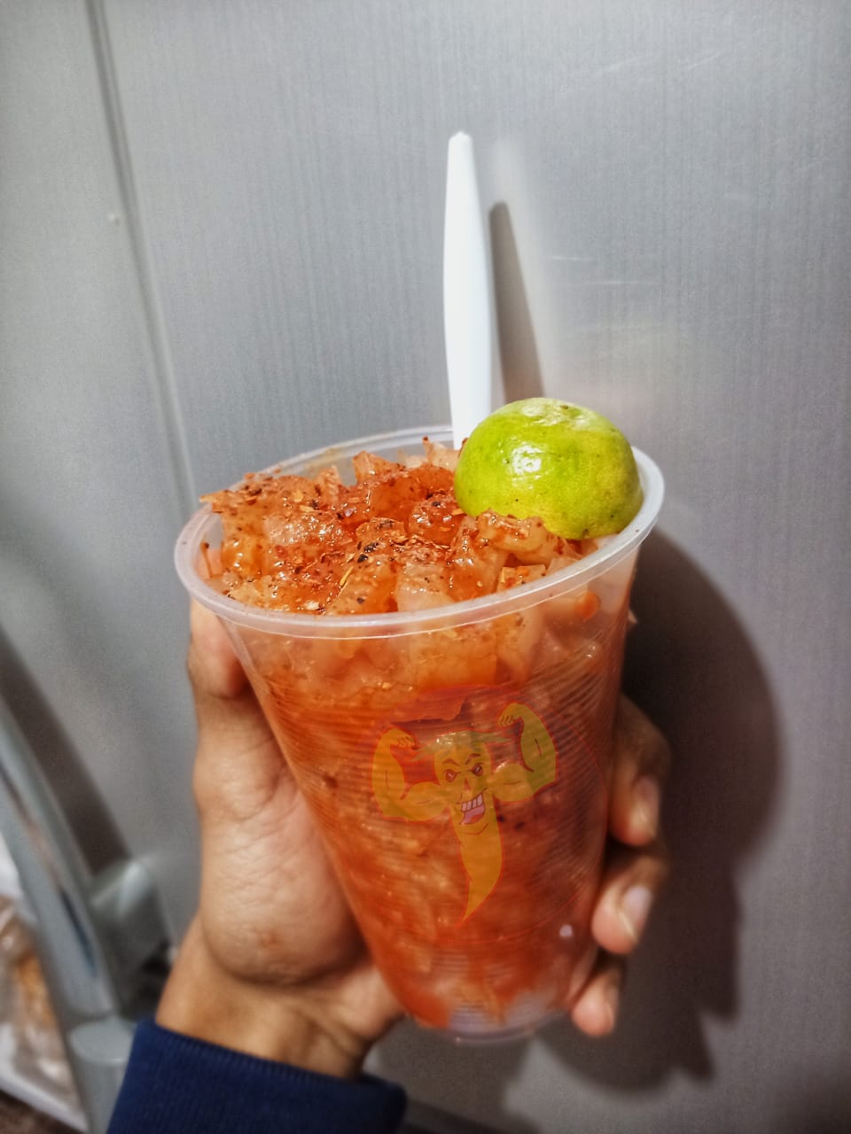 tostada hecha a base de Jícama, se le unta pulpa de Chamoy, se le agrega fruta picada (sandía, mango y Pepino), Skwinkles salsaghetti, salsa, Chamoy, Tajín, Miguelito y su limón