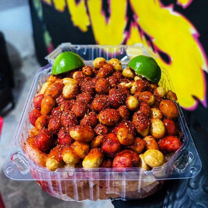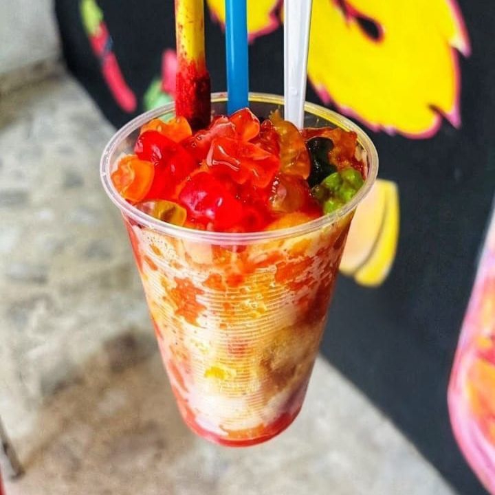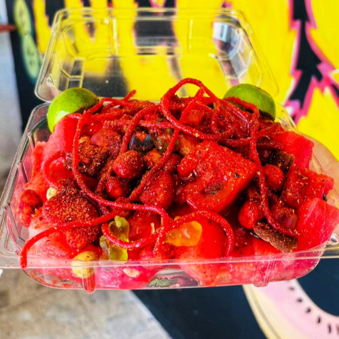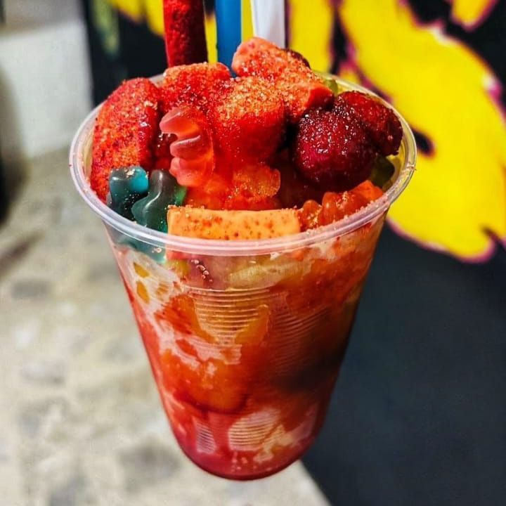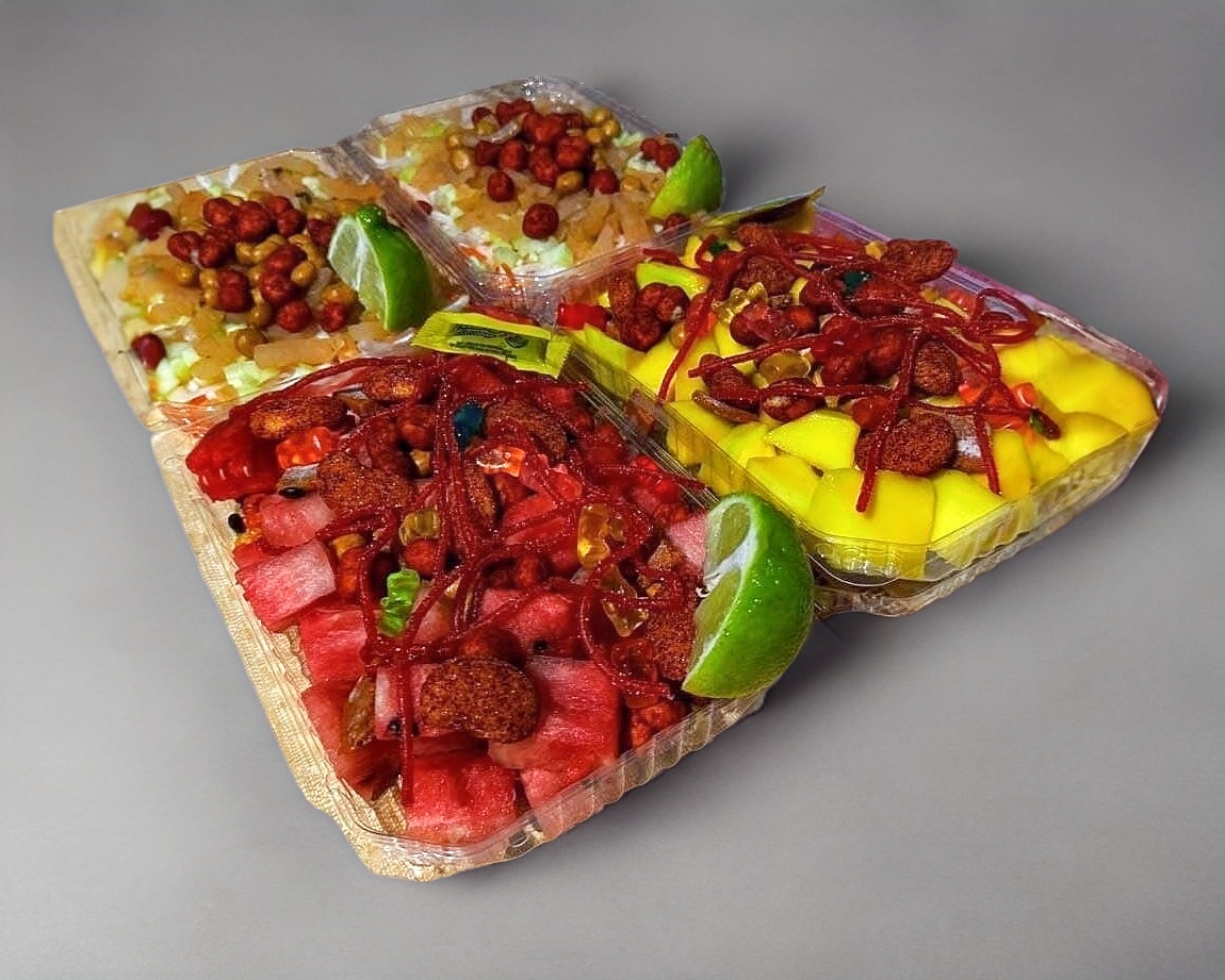 Fruta a elegir, nieve a elegir preparada con Pulparindos, Panditas, manguitos enchilados, Skwinkles, salsa, chamoy, Tajín y Miguelito.