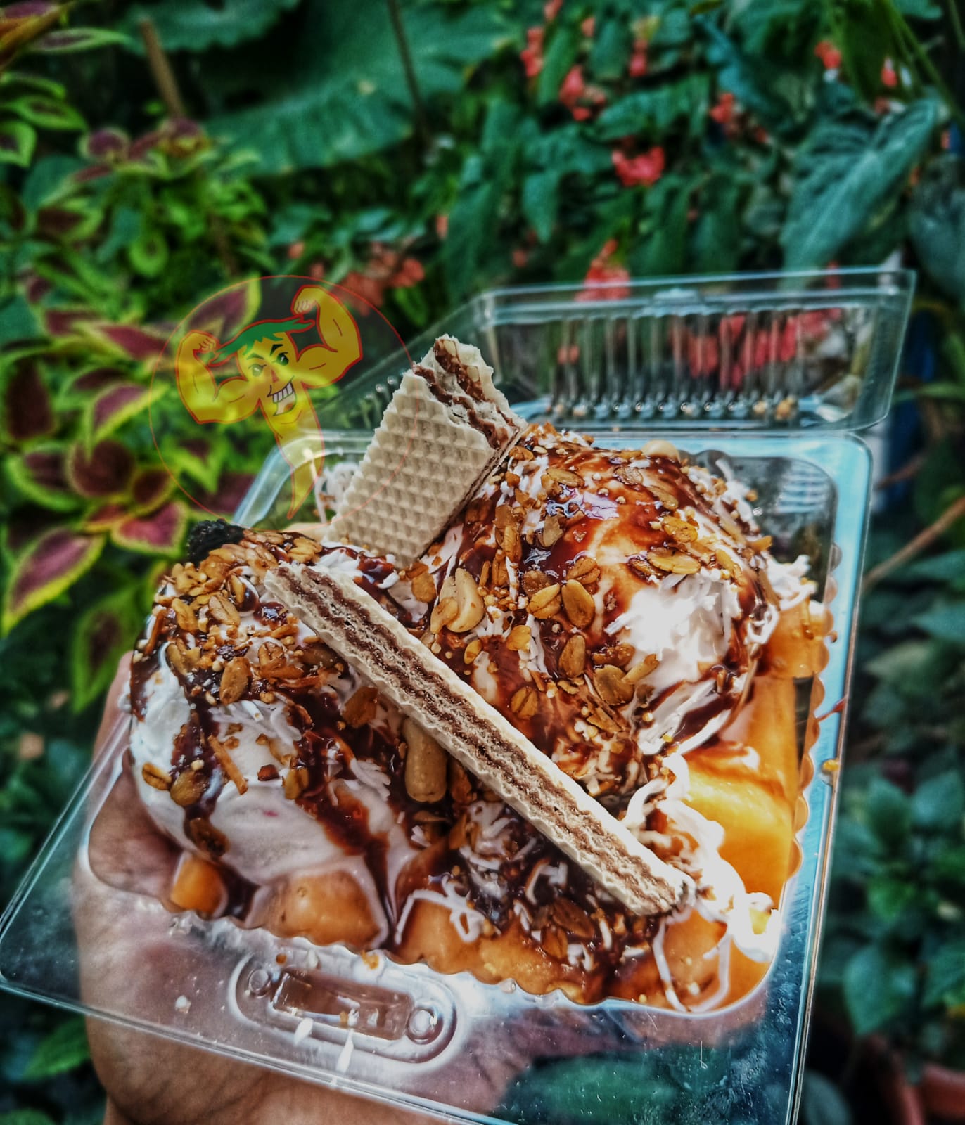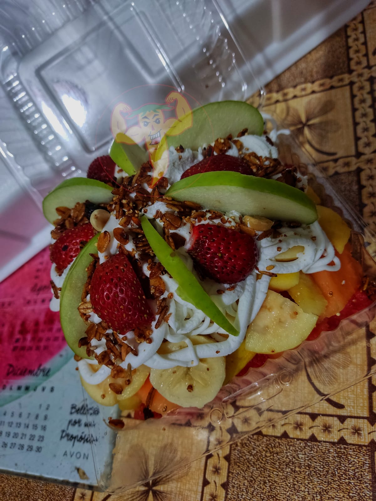 Fruta a elegir, nieve a elegir preparada con chantillí, chocolate Hershey´s, granola con cereales y banderillas de chocoavellana.