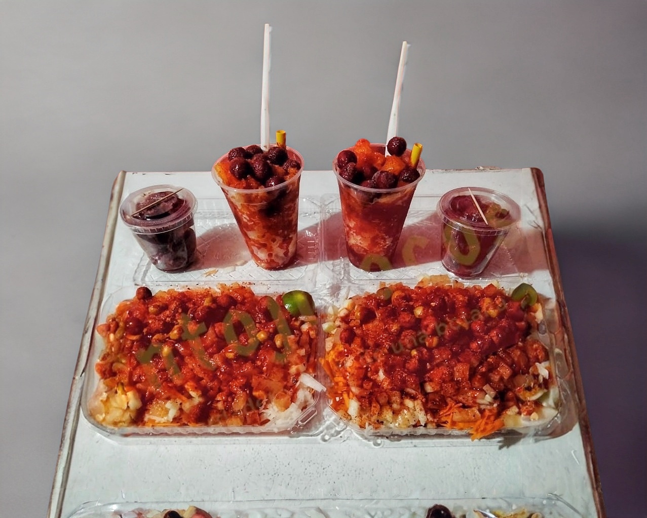 Zanahoria, Jicama, Pepino, Cueritos, Cacahuates hotnuts, Cacahuates japoneses, Panditas, Salsa, Chamoy, Tajín, Miguelito y Limón. (Personal)