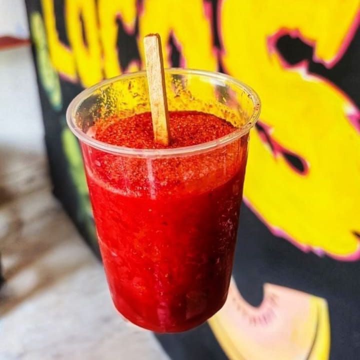 Paleta congelada hecha de fruta natural sabor sandía, preparada con chamoy y Miguelito.