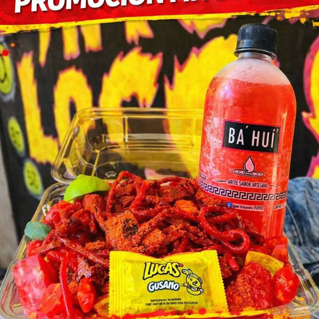 Arizona (sabor a elegir), porción de fruta a elegir, 5 tipos de gomitas mixtas, banderilla de tamarindo, skwinkles salsaghetti, salsa, chamoy, tajin y miguelito.