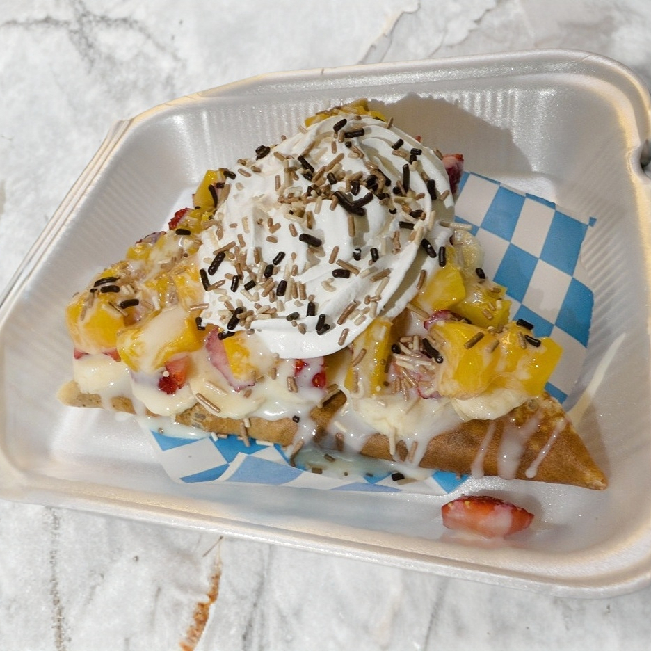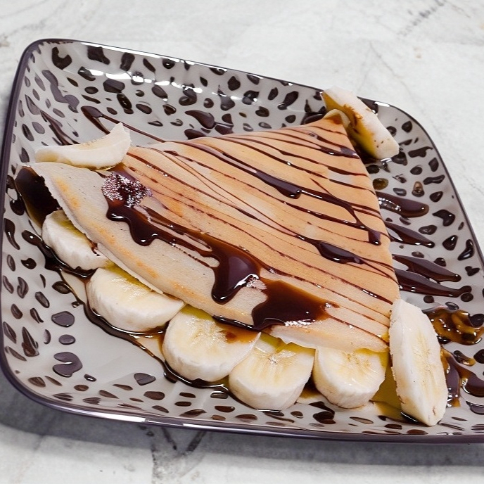 Deliciosa crepa de platano, durazno, fresa, queso philadelphia, nutela, lechera y crema batida