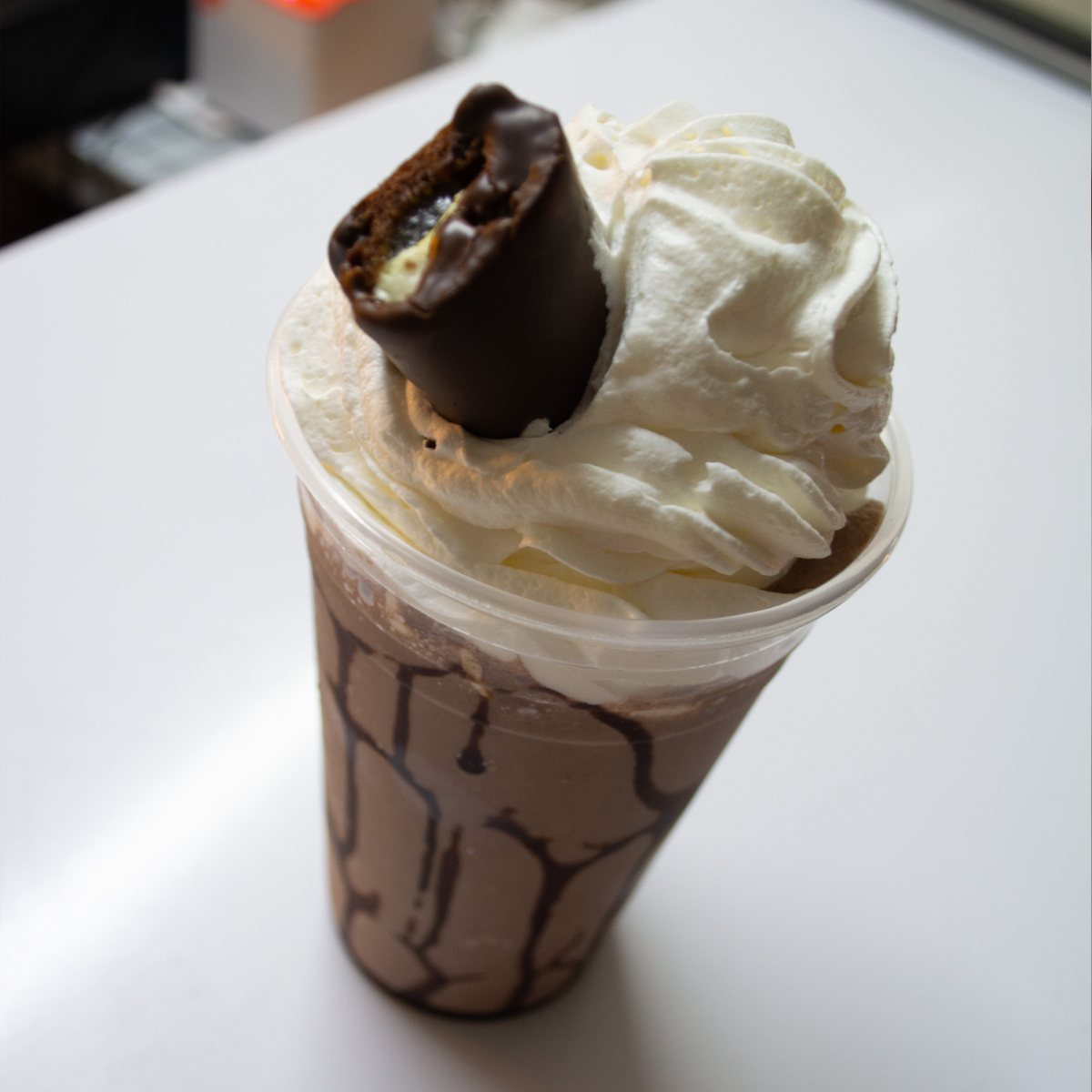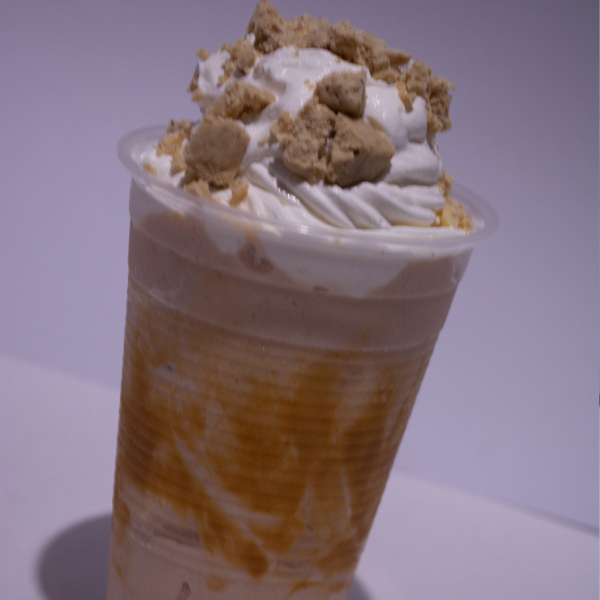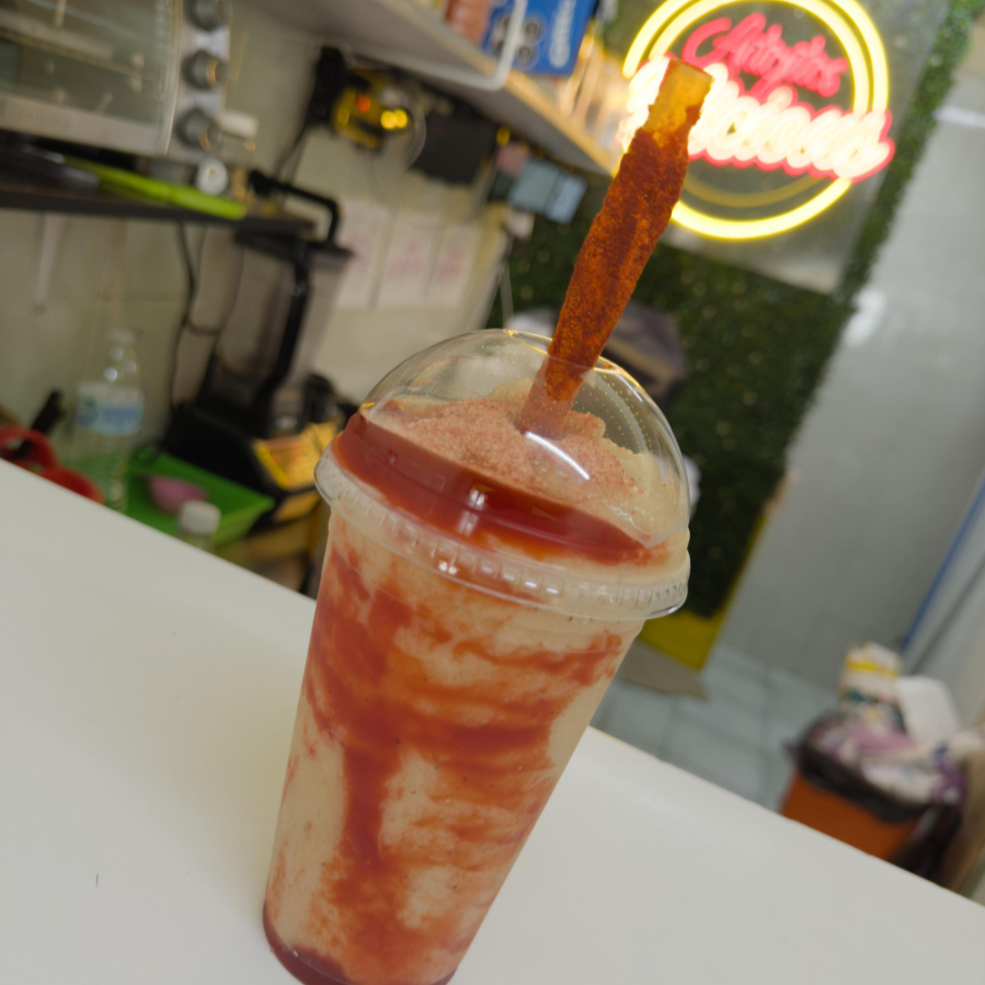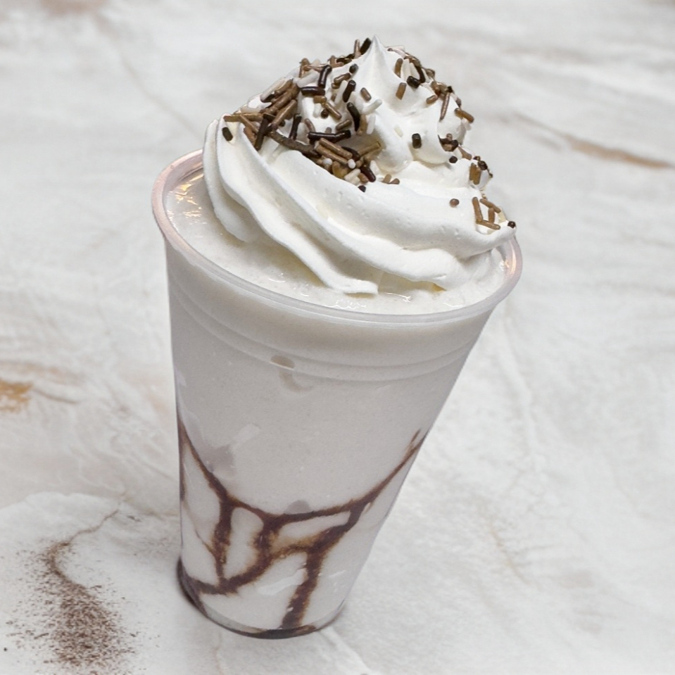 Delicioso frappe de sabor, cubierto de crema batida, servido en vaso de 16 onzas