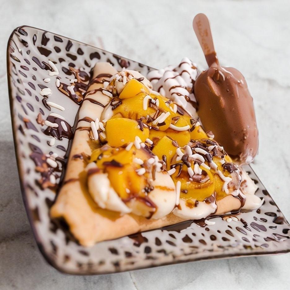 Deliciosa crepa de platano, durazno, nutela, lechera, crema batida, chocolate hersheys, chispas de chocolate y 1 paleta mini MAGNUM