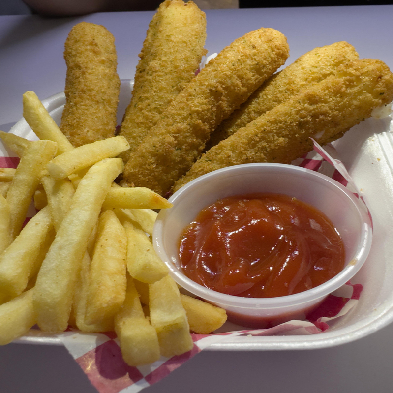 5 piezas de dedos de queso (aproximadamente 150 gramos), acompañados de 70 gramos de papas a la francesa
