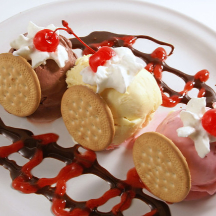 3 bolas de helado de sabor fresa, vainilla y chocolate, acompañado de crema batida, platano y 1 cereza