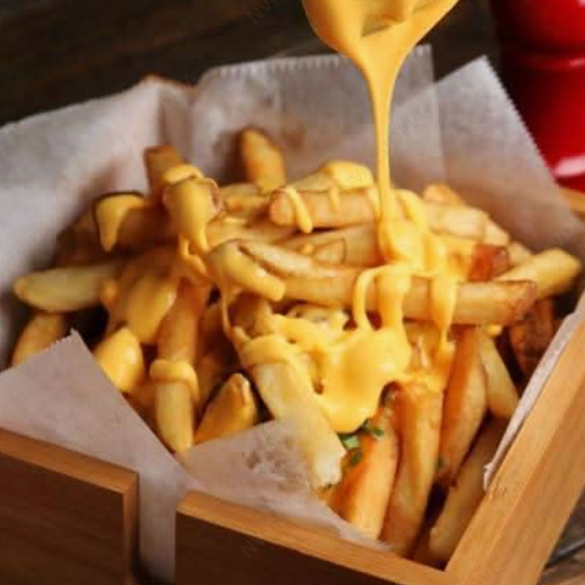 Carne de pollo, queso amarillo y papas a la francesa. Imagen de referencia.