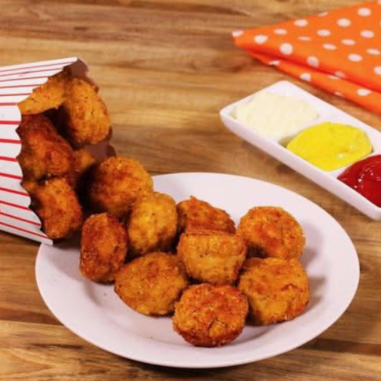 Ricos nuggets de pollo doraditos, acompañados de cátsup, salsa Valentina, queso amarillo. Imagen de referencia.