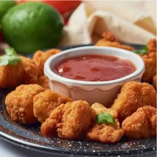 Palomitas de pollo crocantes, acompañadas de cátsup, salsa Valentina, queso amarillo. Imagen de referencia.
