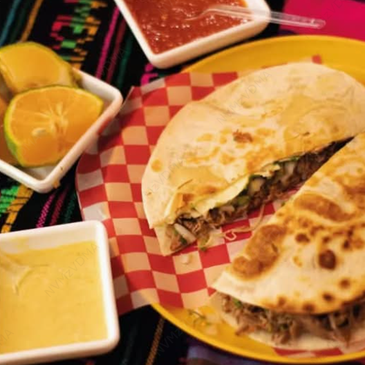 Tortilla de harina rellena de queso derretido y carne molida sazonada a un toque de suadero, se hacen en un comal o parilla hasta que el queso se derrite y se sirve caliente. La imagen es solo de referencia para tener una idea de lo que se compra.