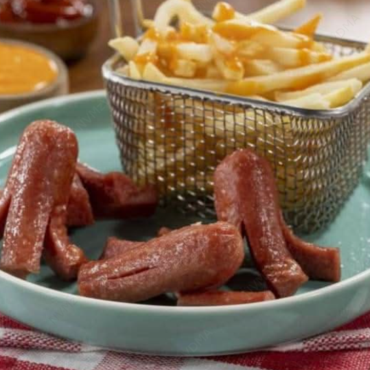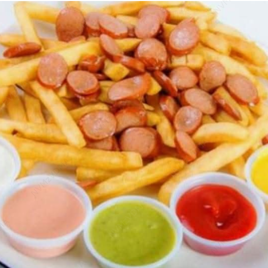 Papas a la francesa con trocitos de salchicha. Imagen de referencia.