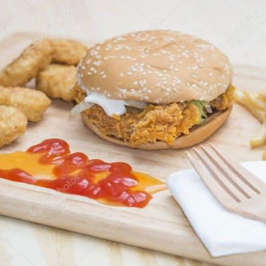 Consiste en una hamburguesa especial que lleva: super bimbollo gigante, nugget tipo hamburguesa de pollo, queso amarillo, cátsup, mostaza, mayonesa. Imagen de referencia.