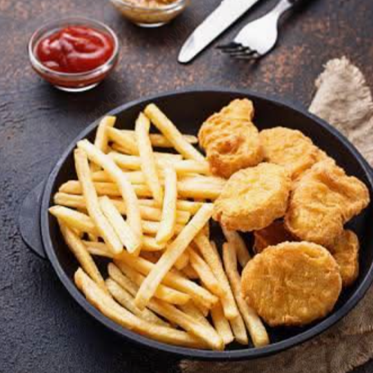 Deliciosos nuggets de pollo crocantes, acompañados de ricas papas a la francesa, acompañados de cátsup, salsa Valentina, queso amarillo. Imagen de referencia.