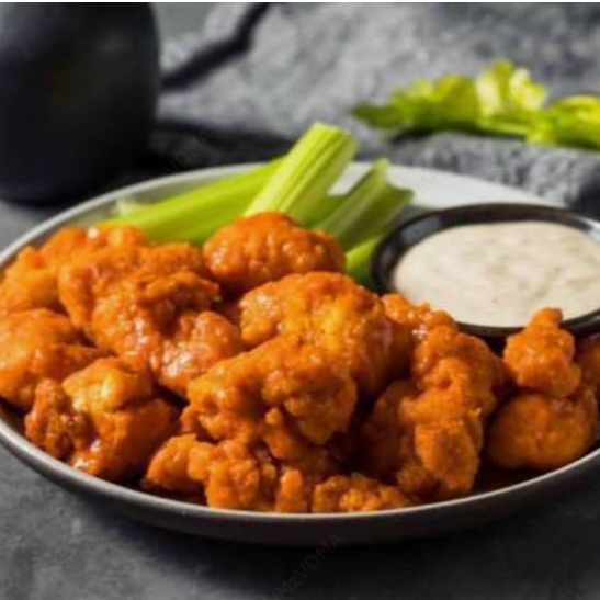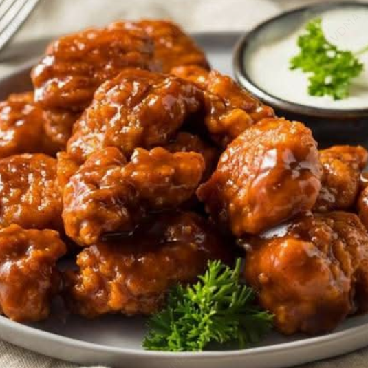 Disfruta de nuestros deliciosos boneless de 250 g aproximadamente, bañados en salsa búfalo. Imagen de referencia.