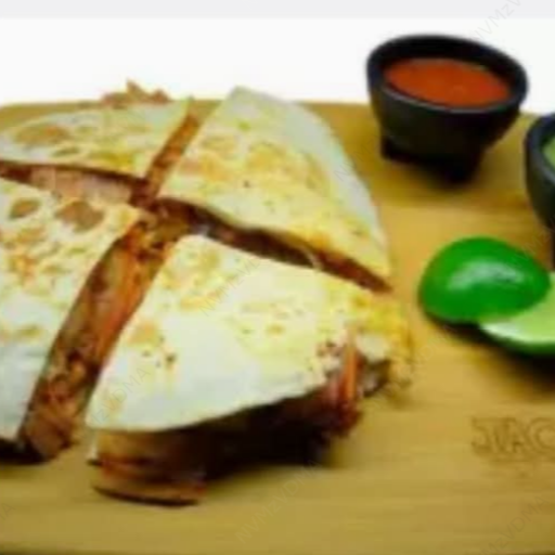 Tortilla de harina rellena de queso derretido y carne al pastor, se hacen en un comal o parilla hasta que el queso se derrite y se sirve caliente. La imagen es solo de referencia para tener una idea de lo que se compra.