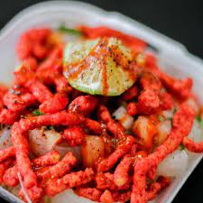 Cheetos Flamin Hot, queso amarillo, salsa y limón.
