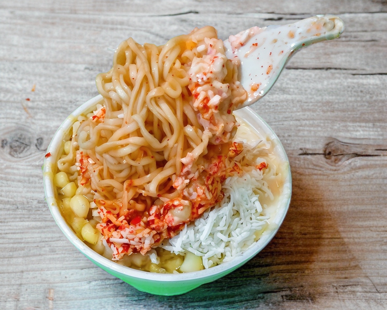 Esquites, mayonesa, queso rallado, limón y chile en polvo.