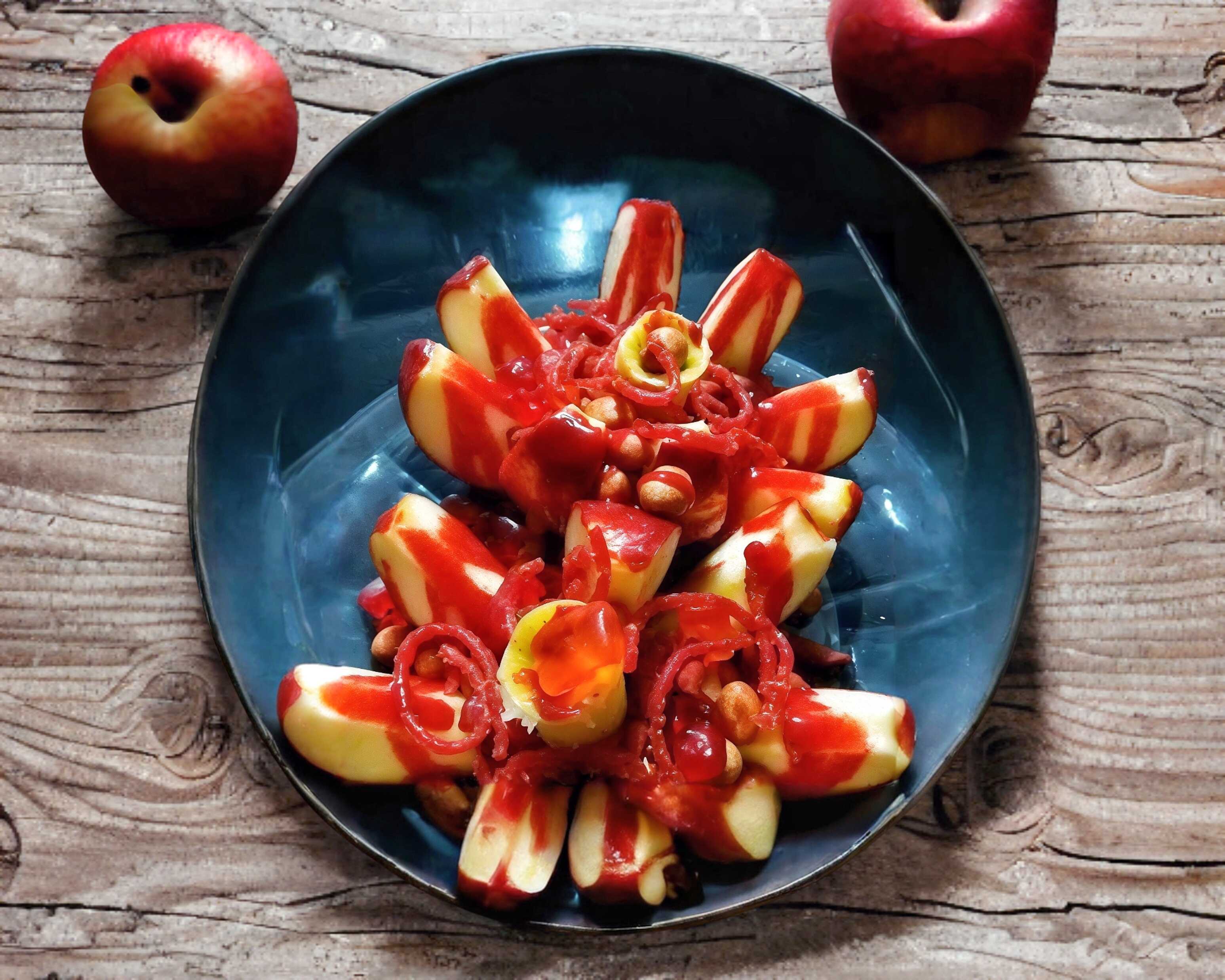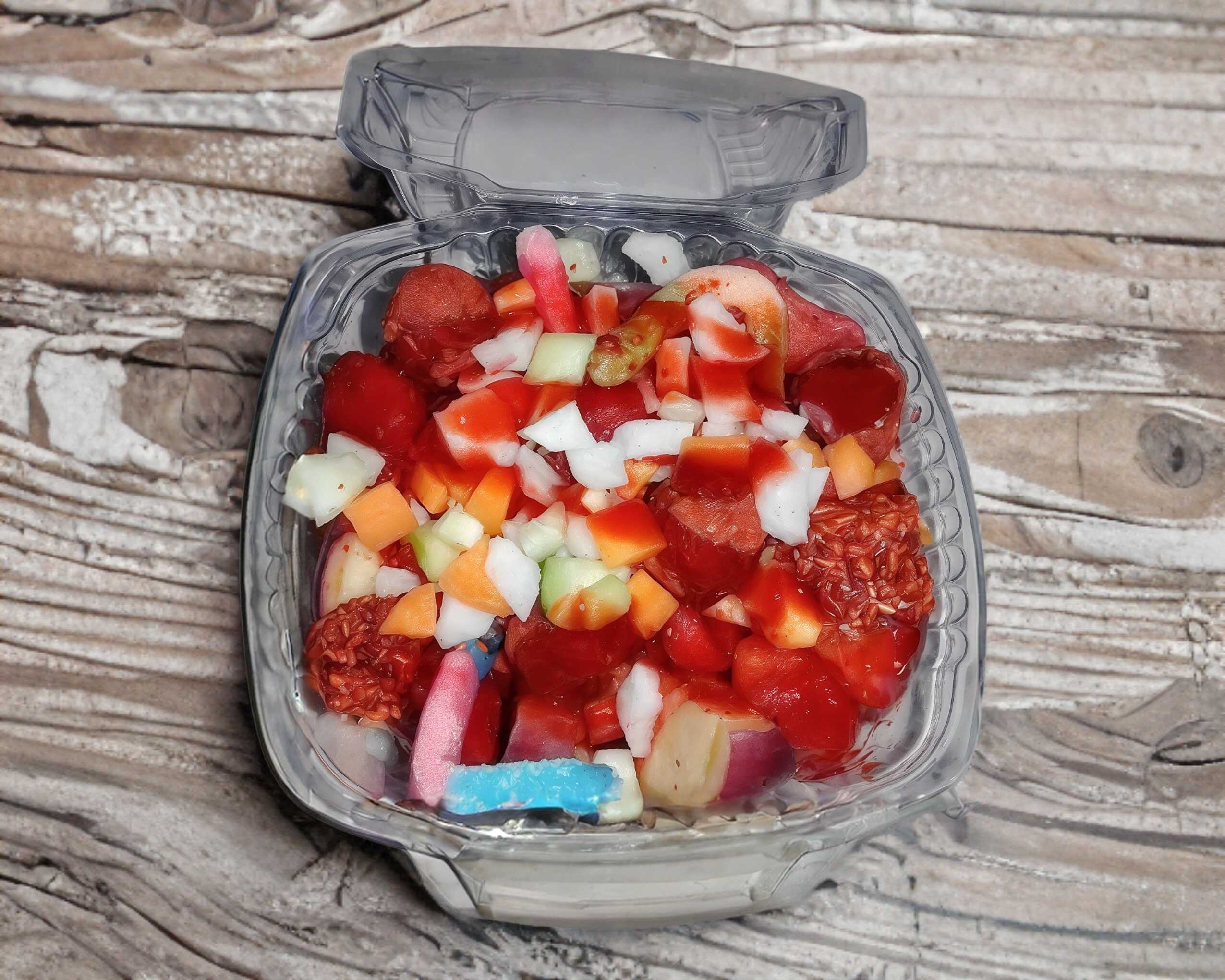 Cacahuate enchilado, gomas de víboras, cueritos, charritos, chamoy, limón y salsa.
