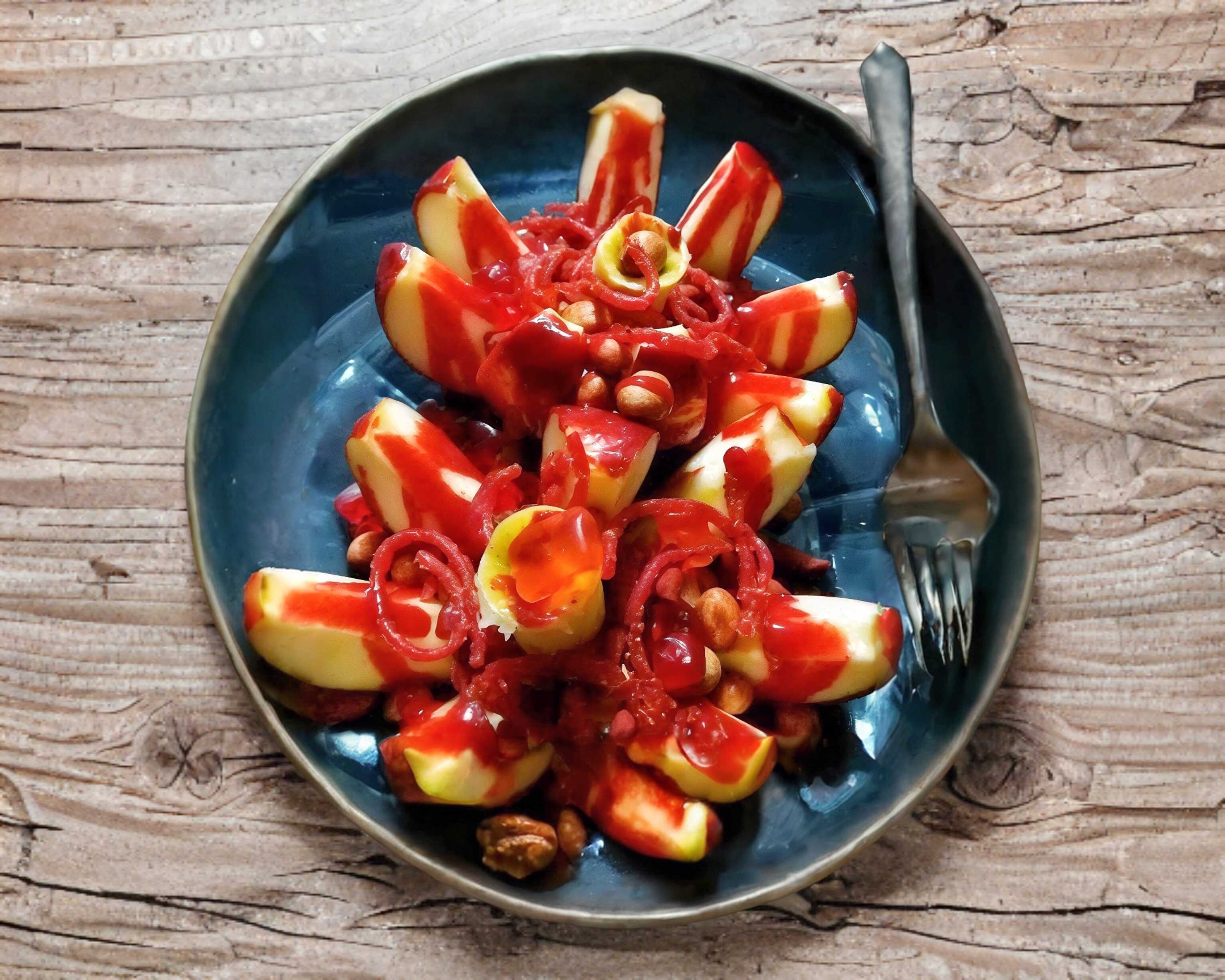 Cueritos, cacahuate enchilado, chamoy, salsa, chile en polvo, gomas de víbora, Maggi y salsa inglesa.