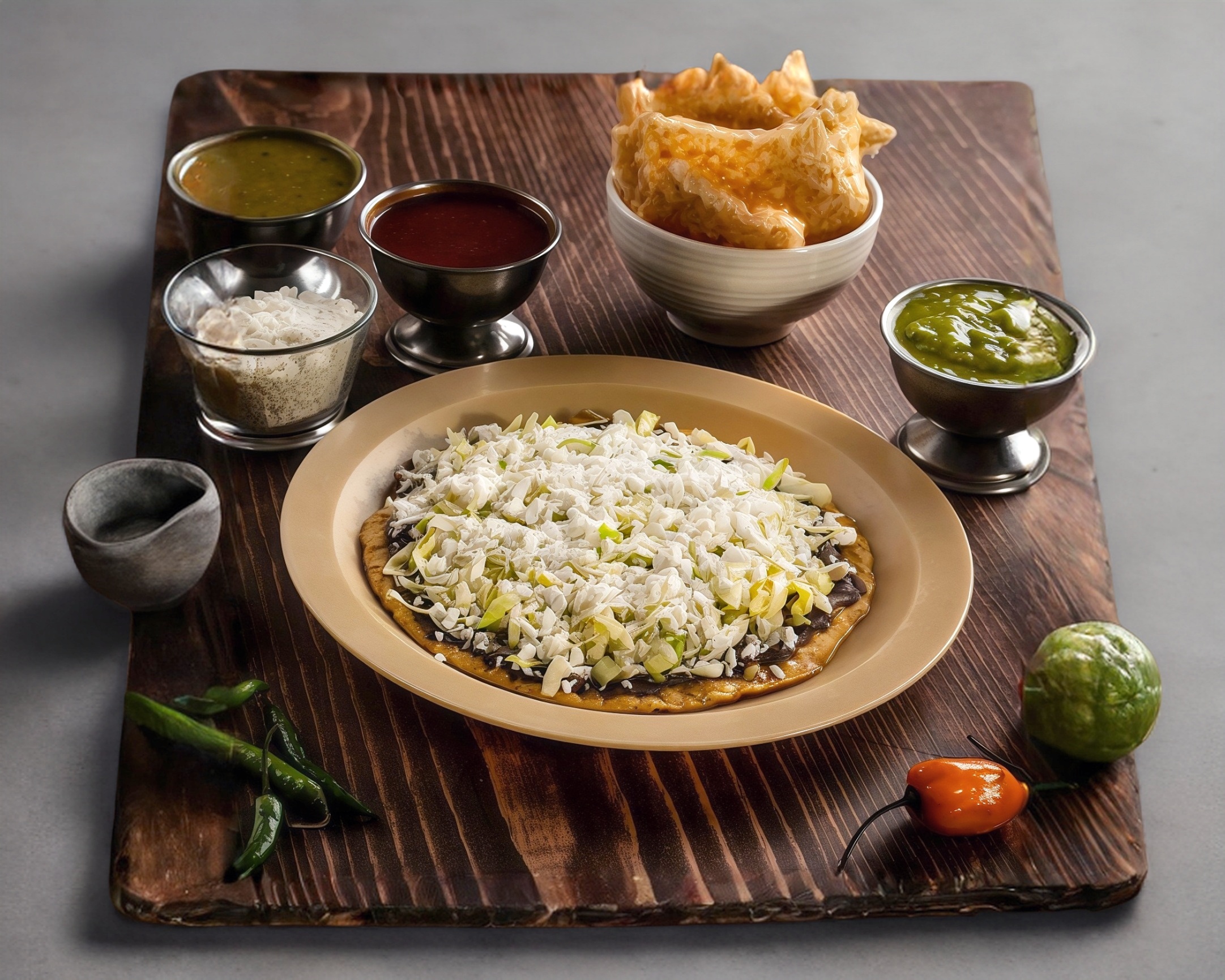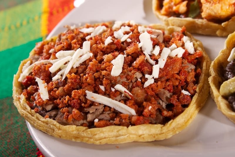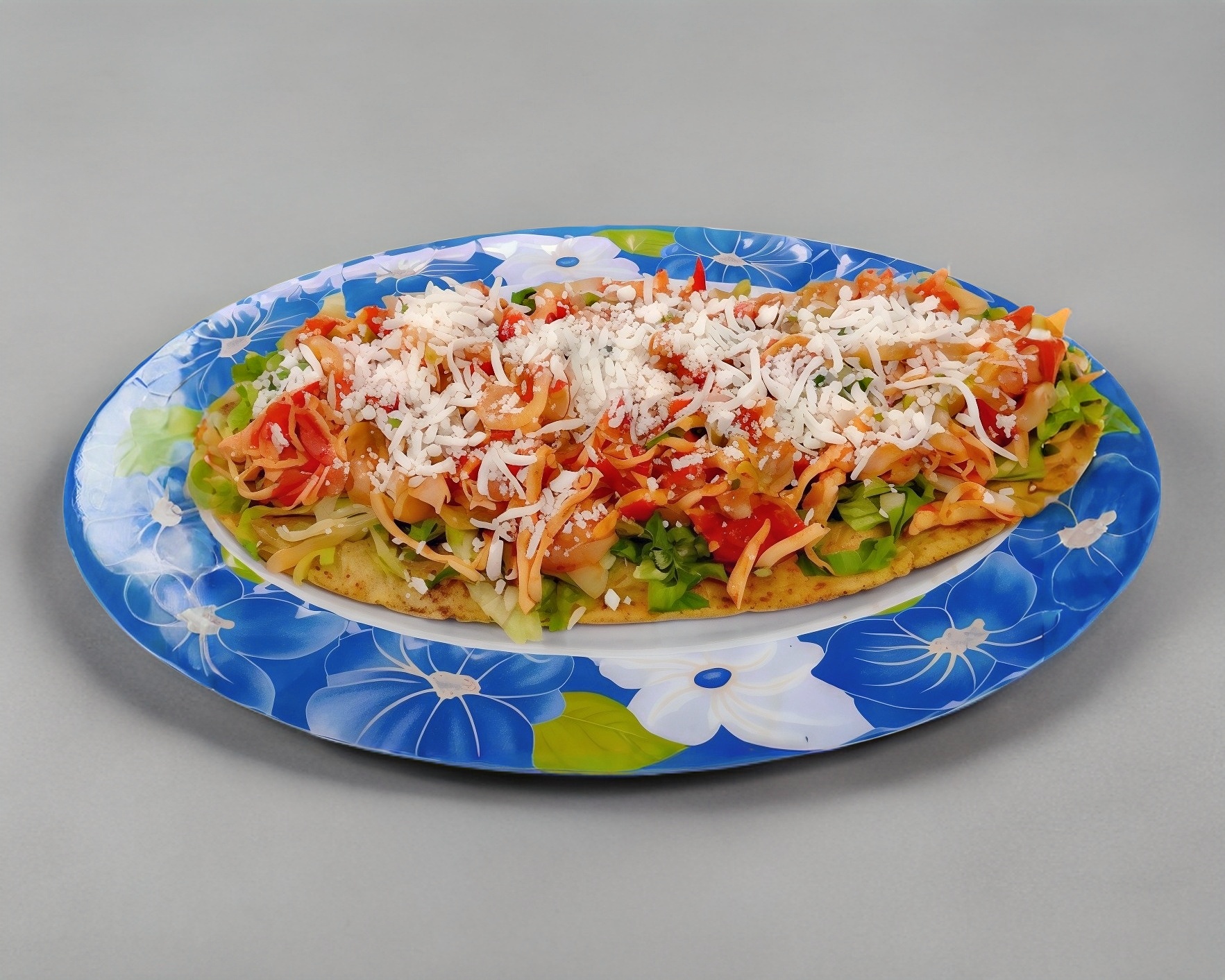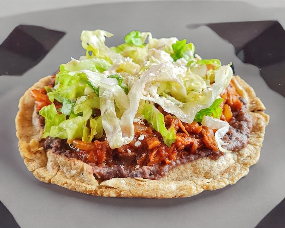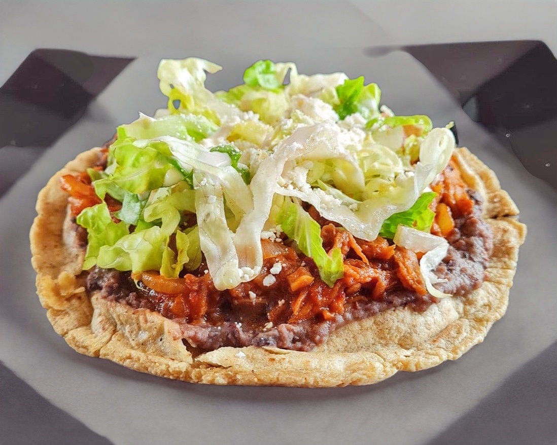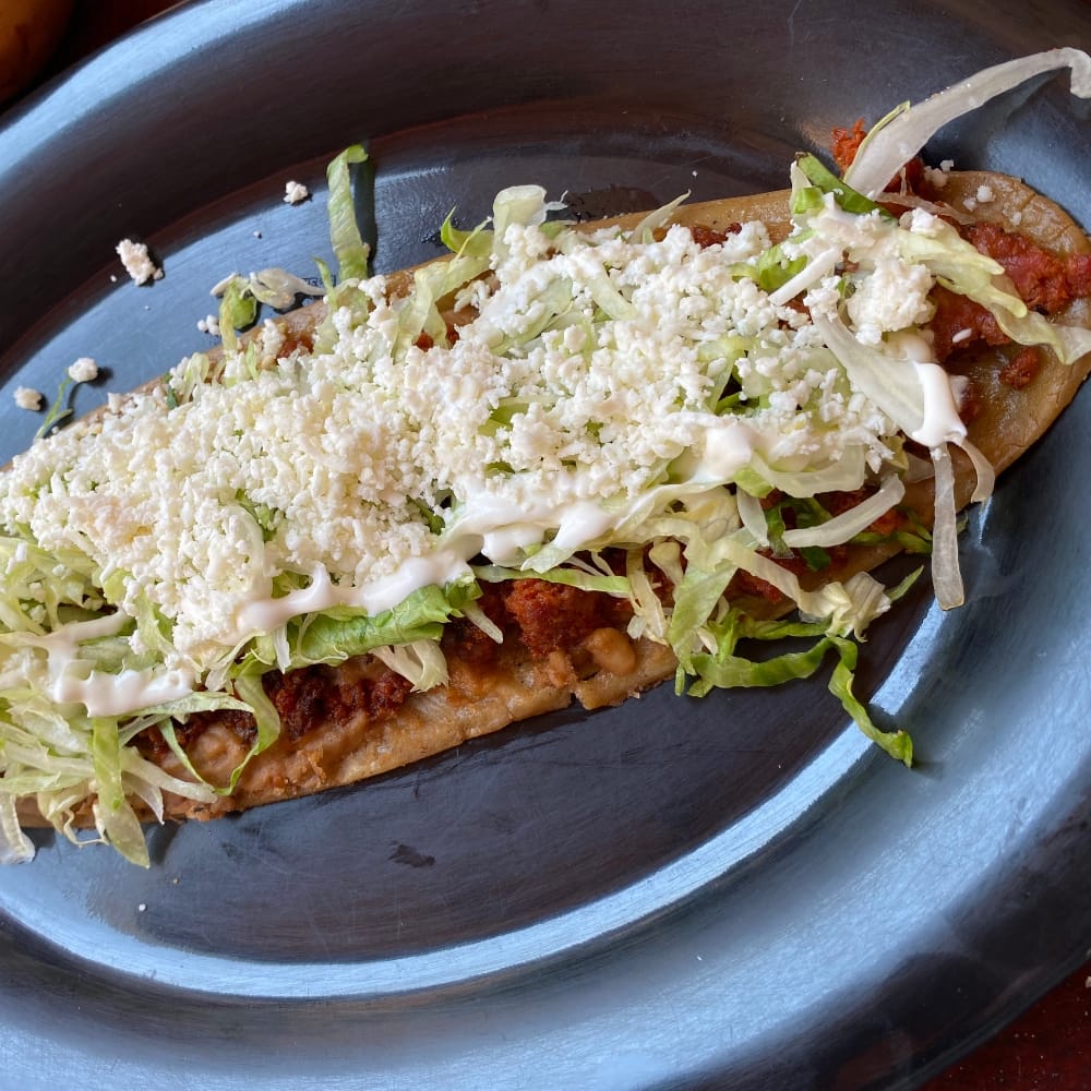 Sope con frijoles, chicharrón prensado, lechuga, crema y queso rallado. Porcion personal