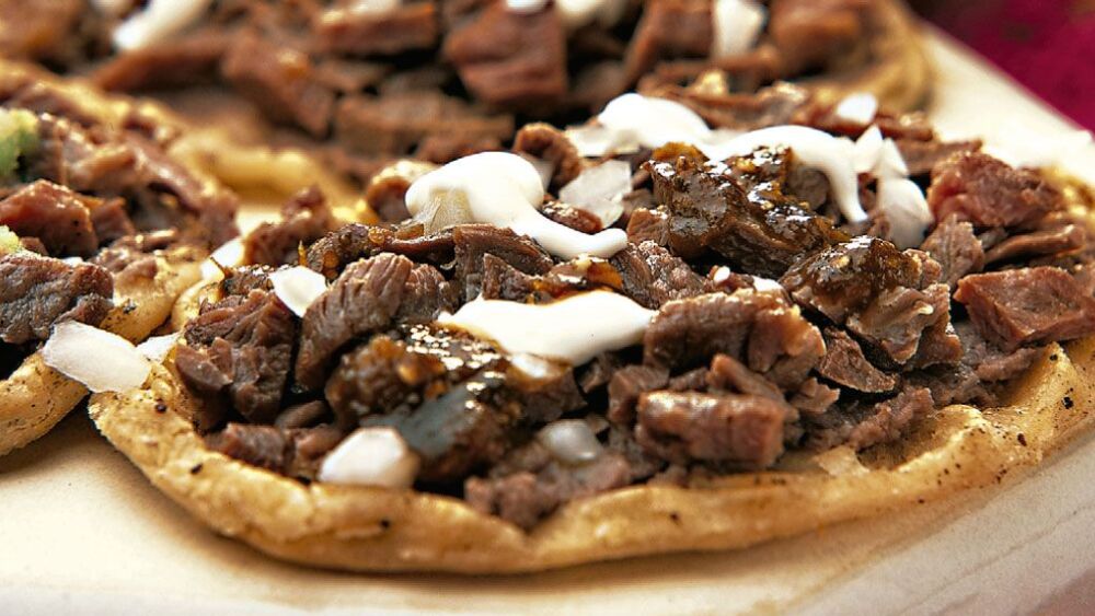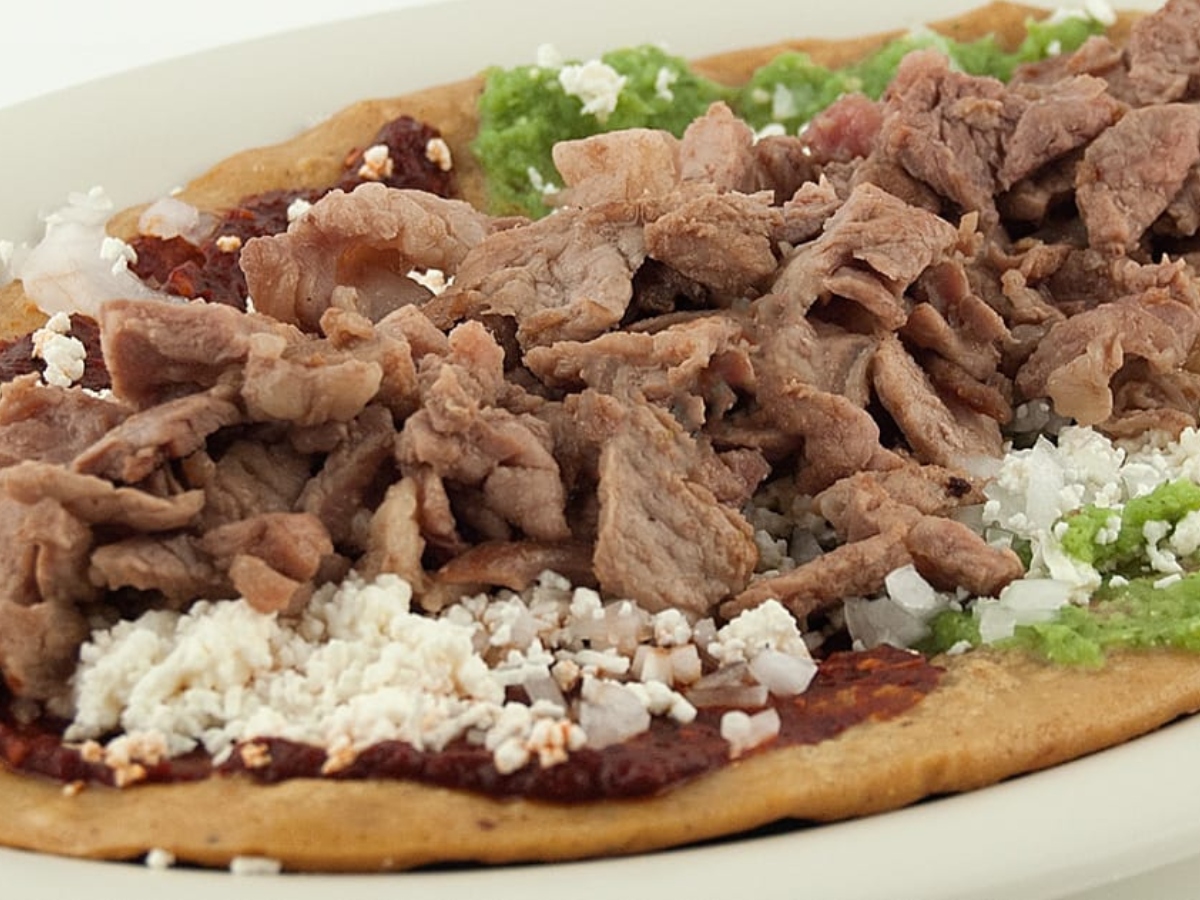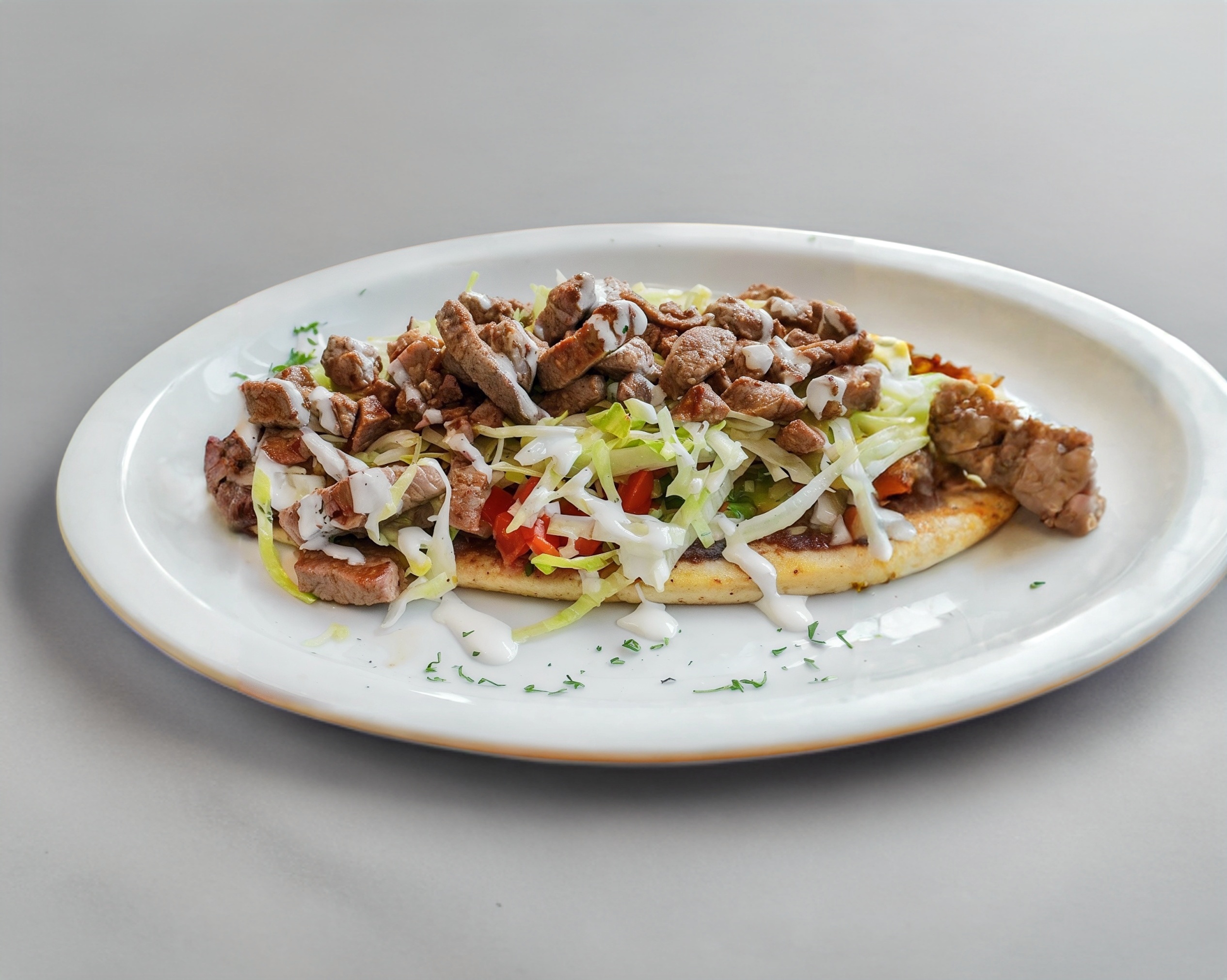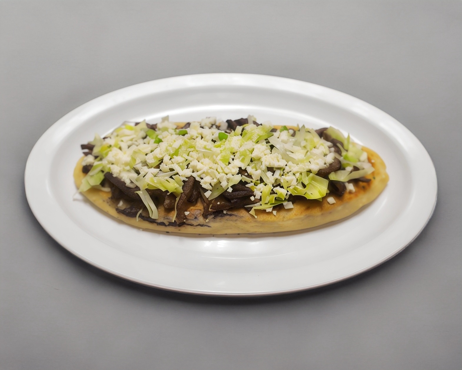 Sope con frijoles, bistec ,queso rallado, lechuga y crema. Porcion personal