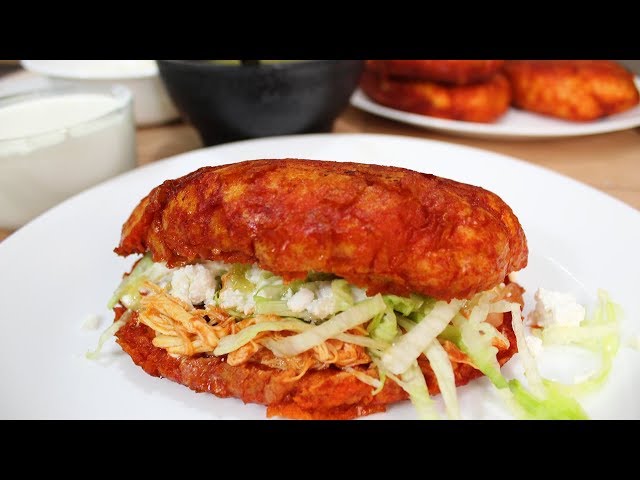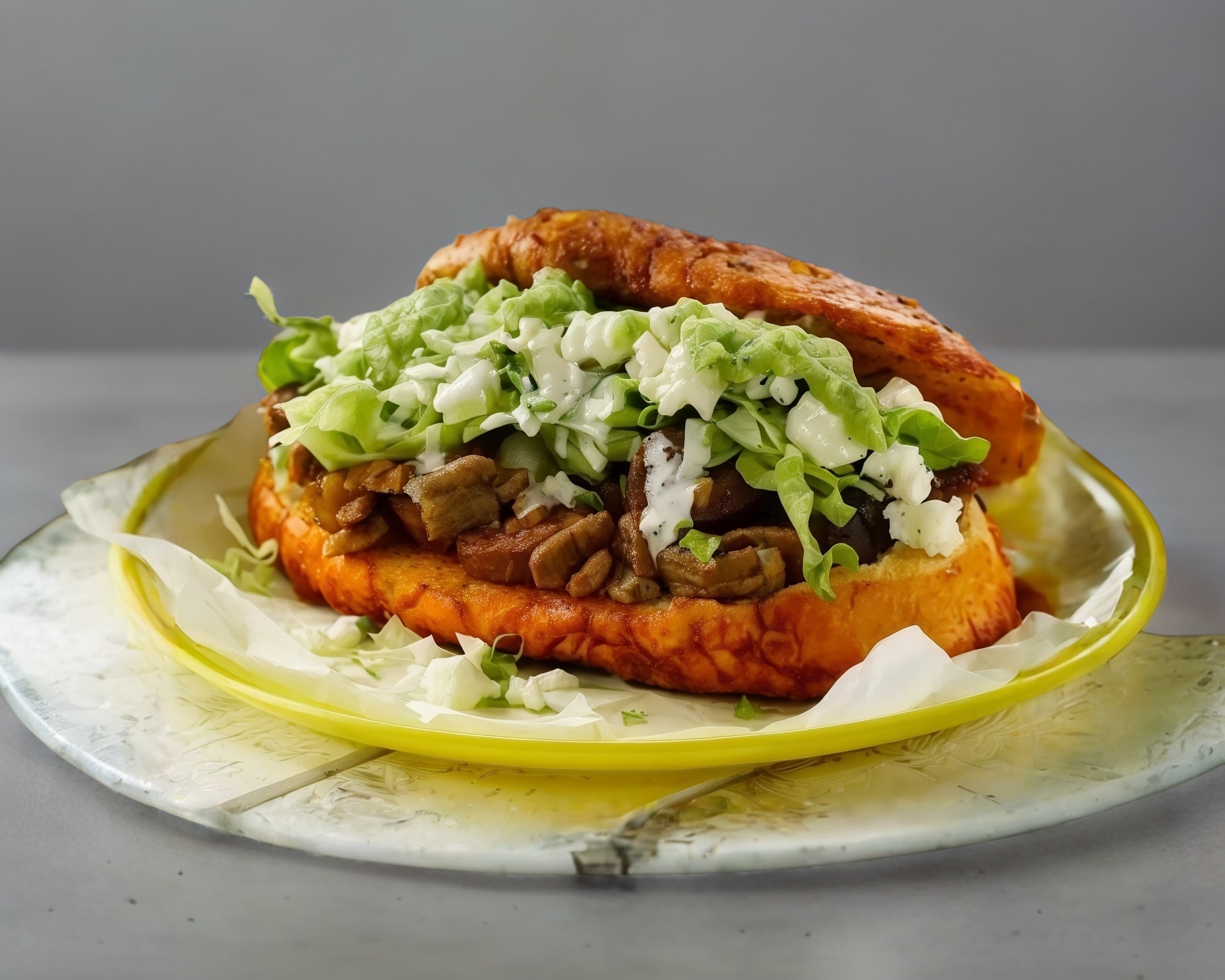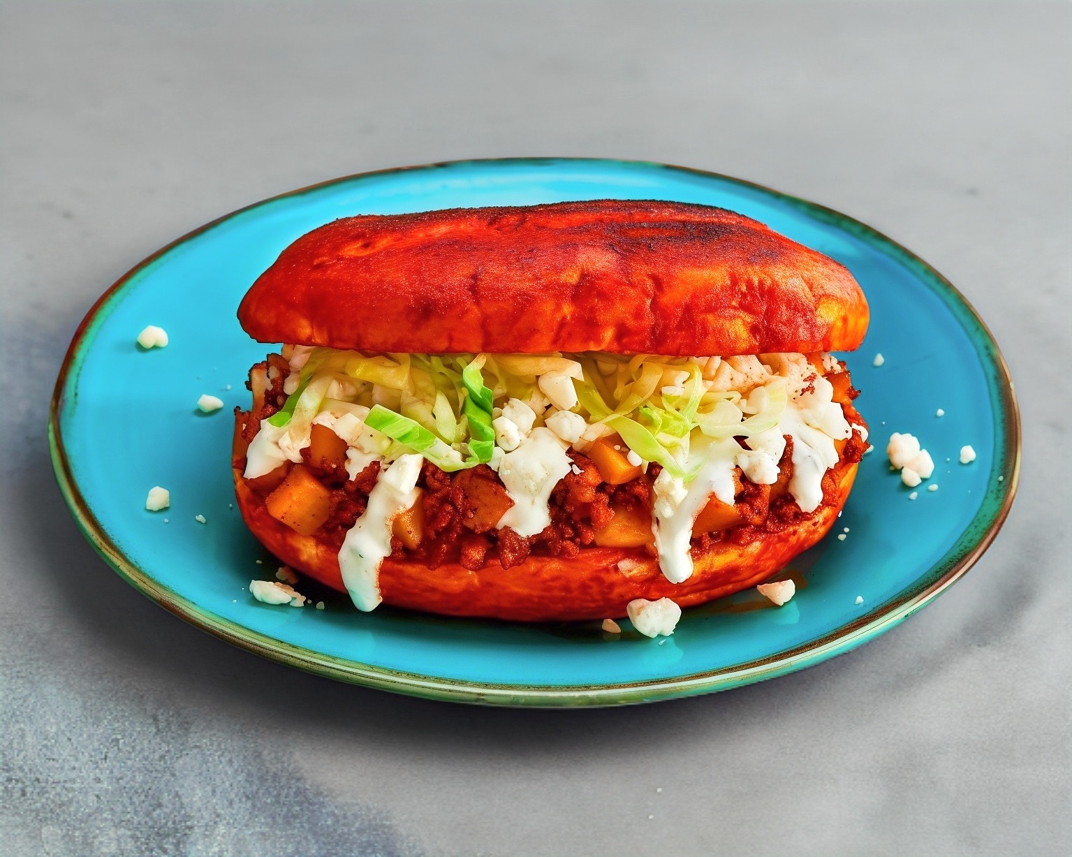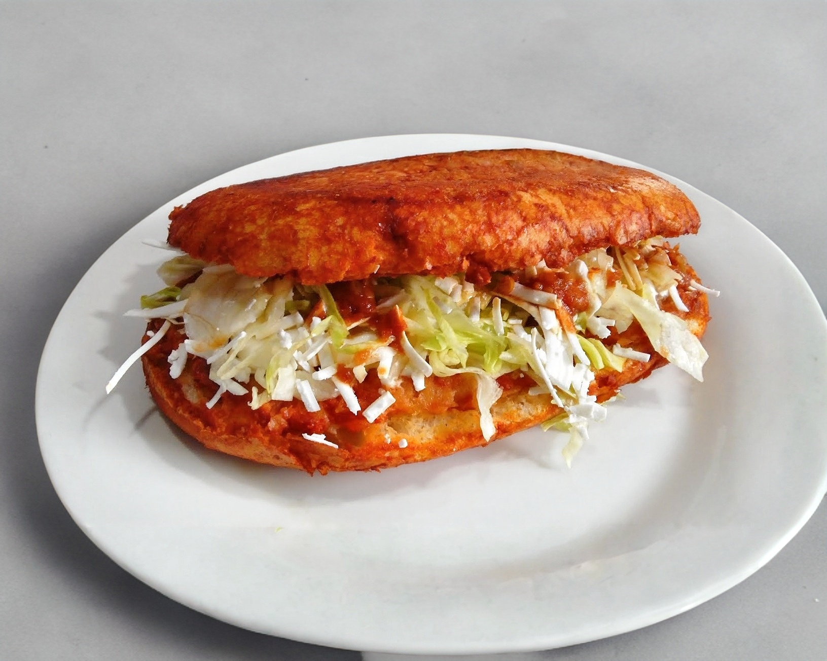 Pambazo relleno de papa con longaniza, lechuga, crema y queso rallado.