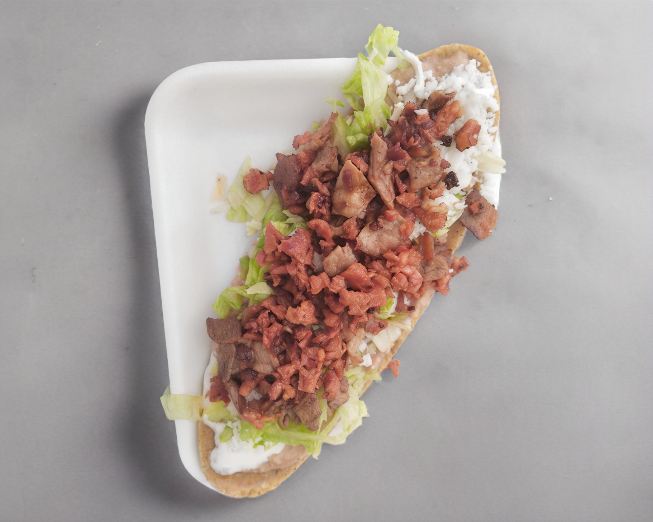 Frijoles, bistec ,crema, queso rallado lechuga.