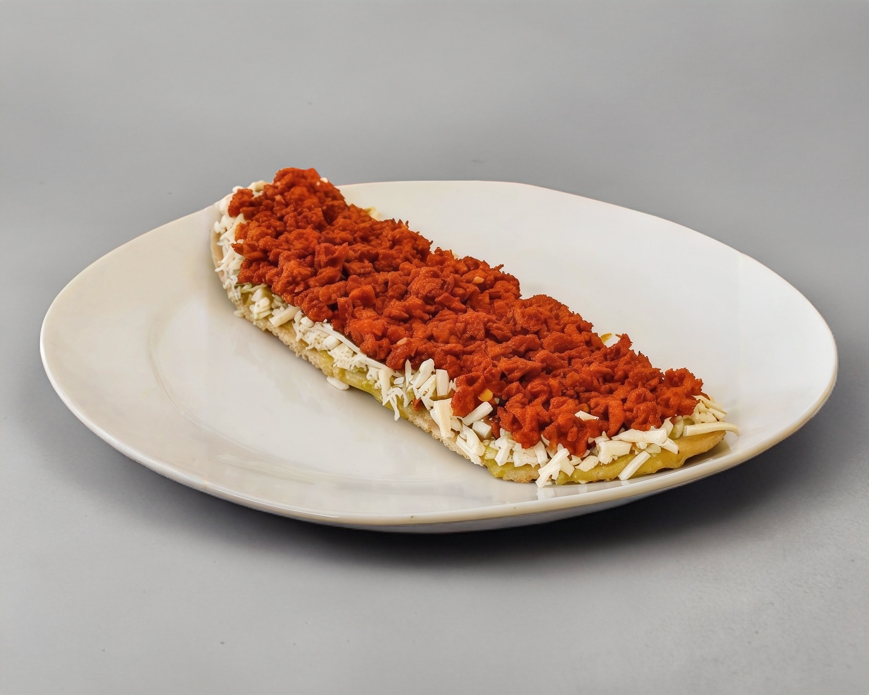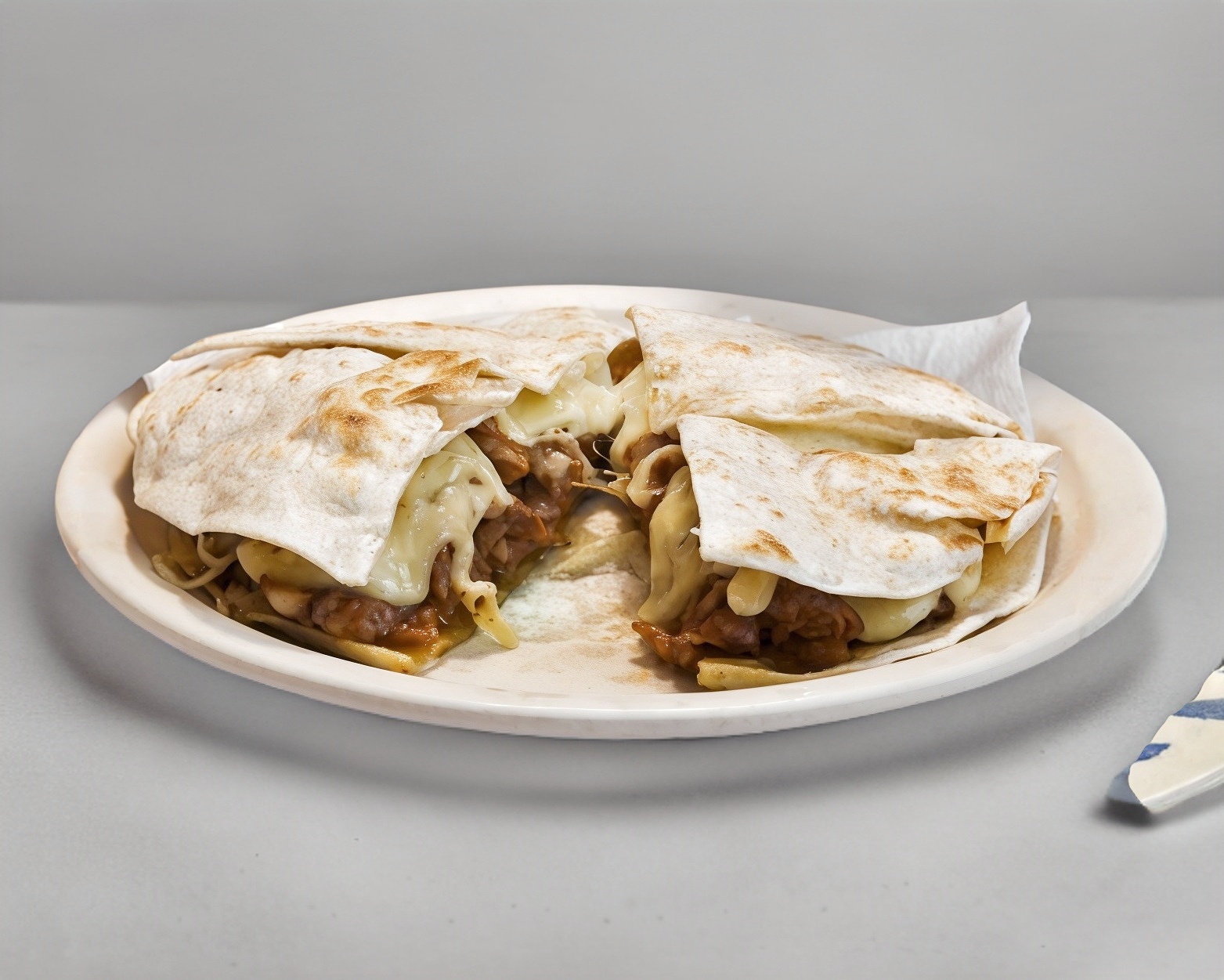 2 Tortilla de harina partidas a la mitad, Bistec y queso Oaxaca.