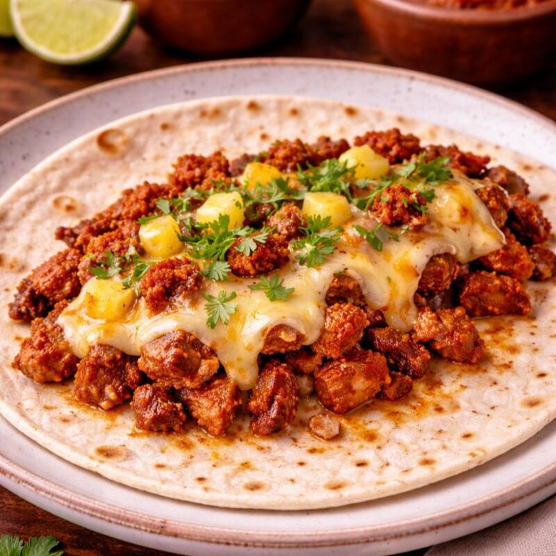 Taco de Carne al Pastor en Tortilla de harina con queso manchego, cebolla y salsa verde especial de la casa.