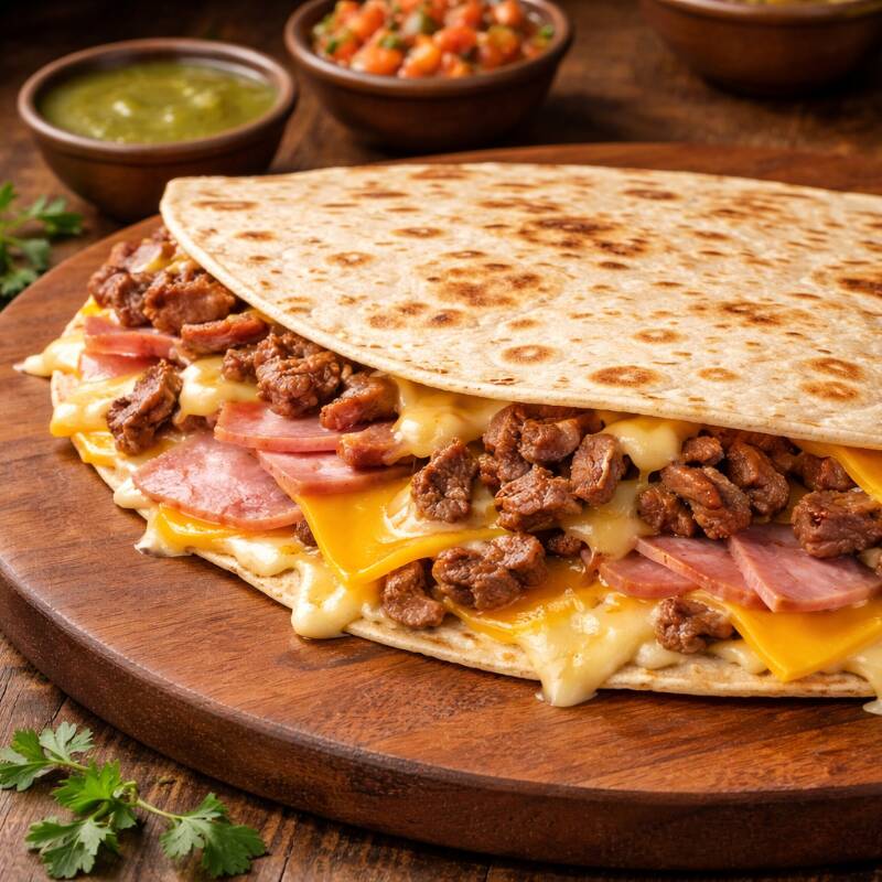 Sincronizada Especial con tu Carne Favorita elegir, Doble Tortilla de Harina. Jamón, Queso amarillo y manchego derretido.