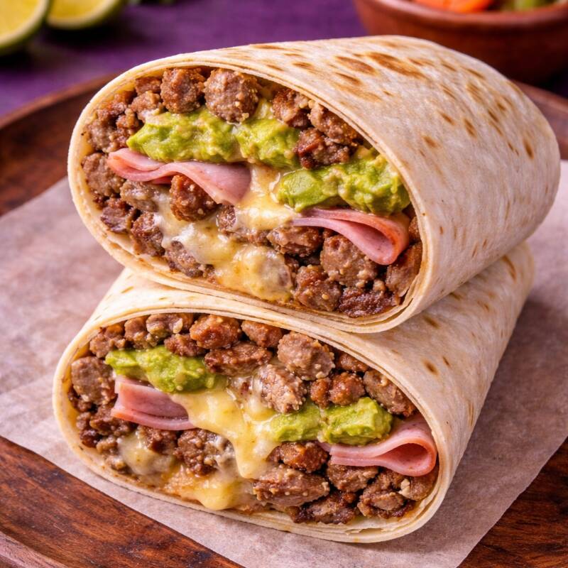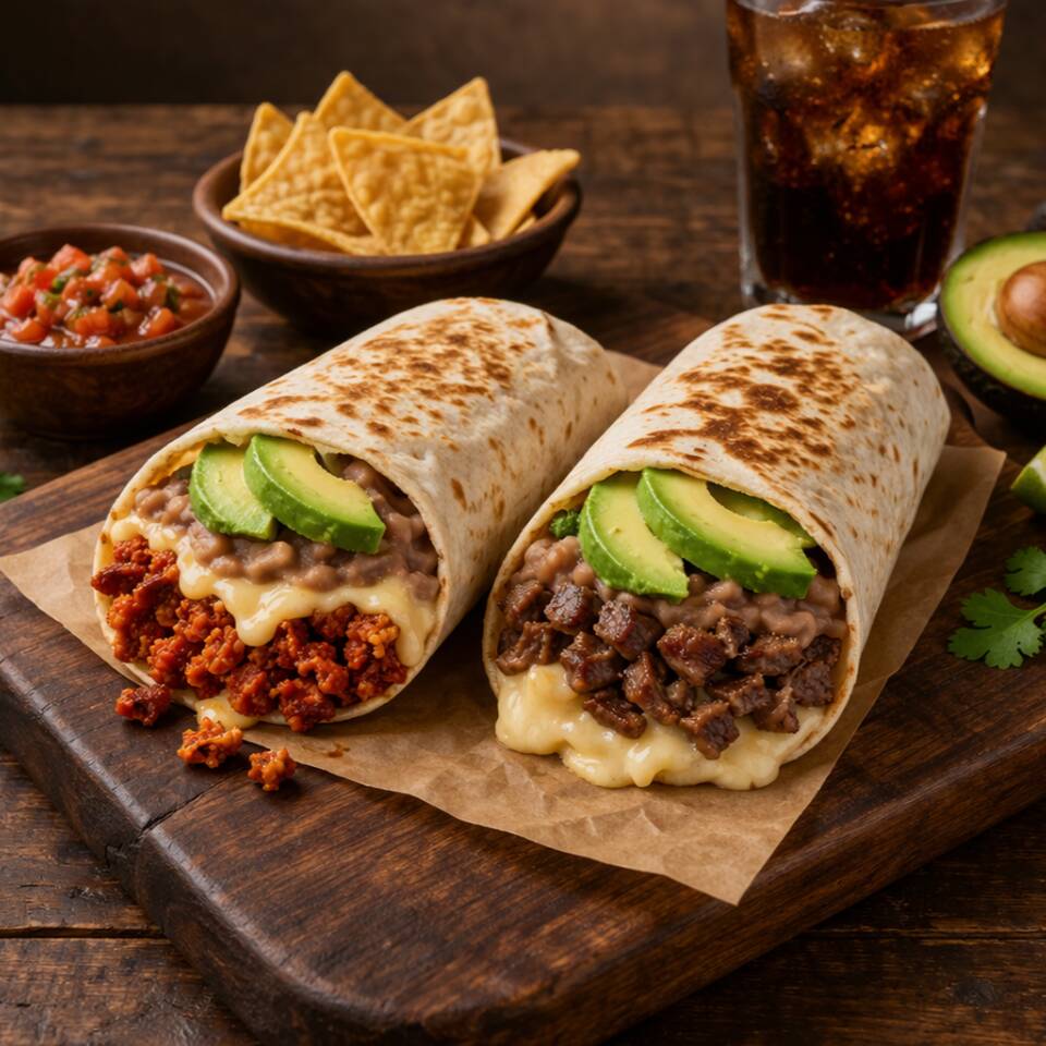 Burrito Sencillo (Frijoles, Queso Manchego, Aguacate, Jamón) con carne a elegir (Suadero, Bistec, Chorizó, Campechano)