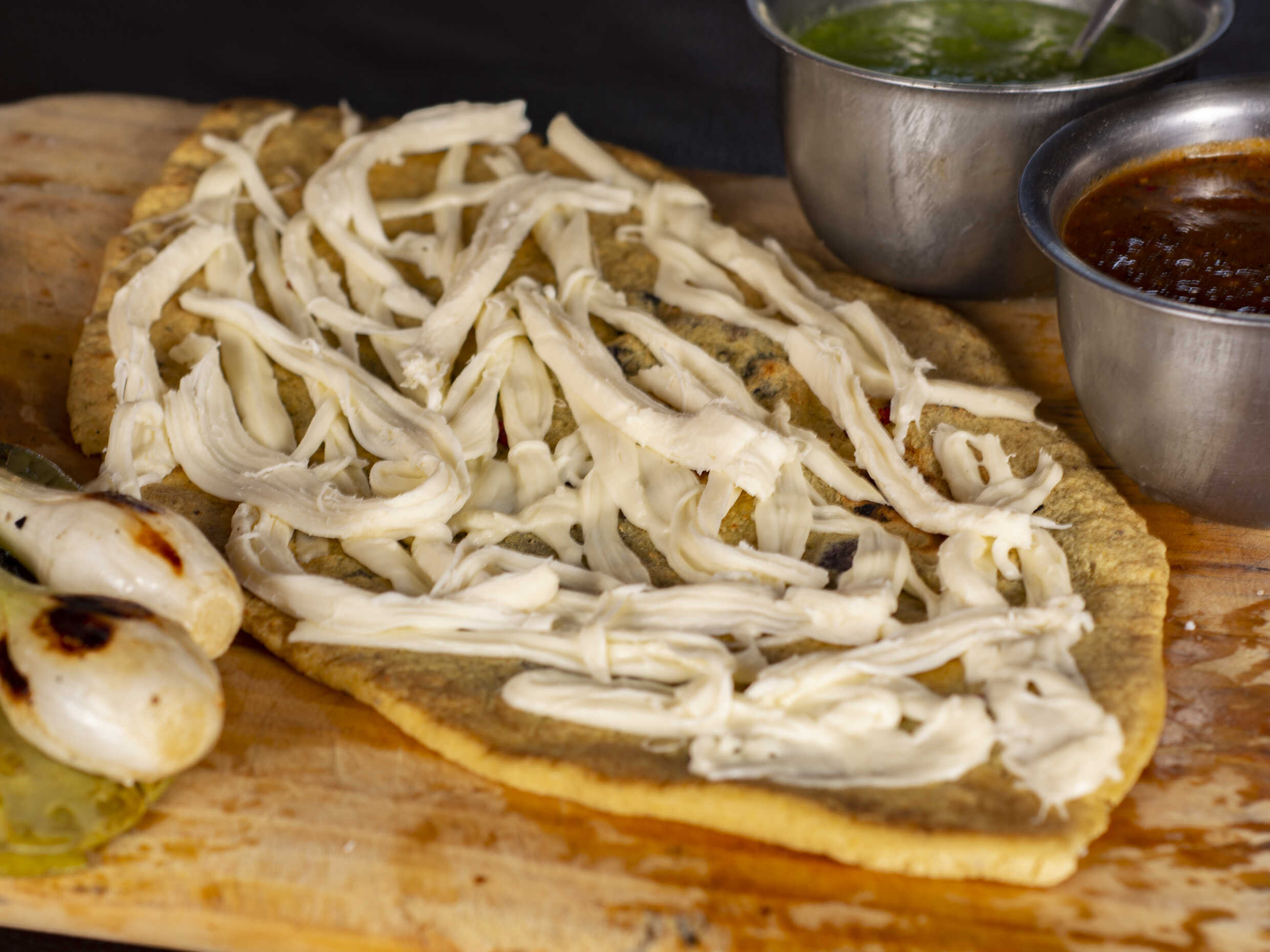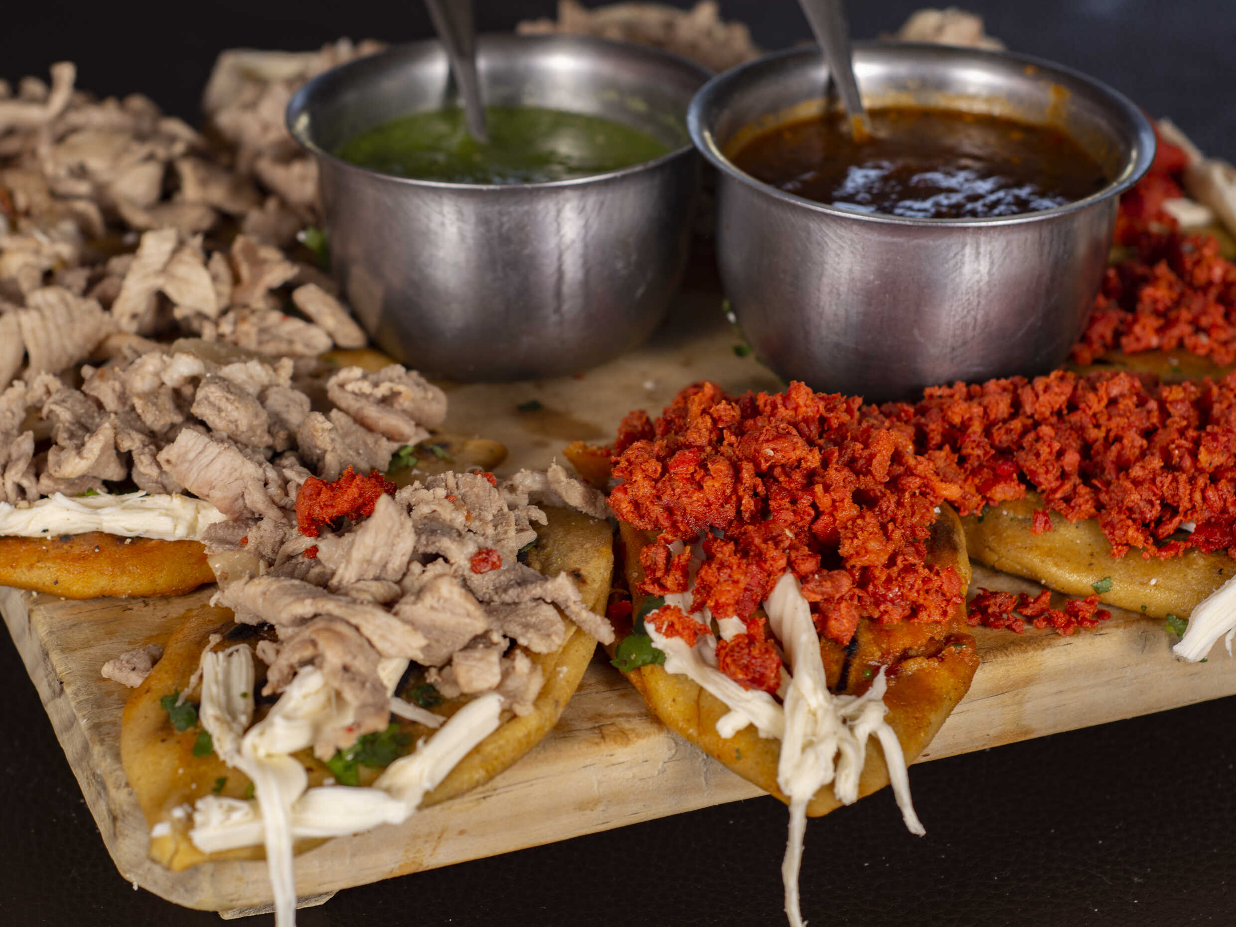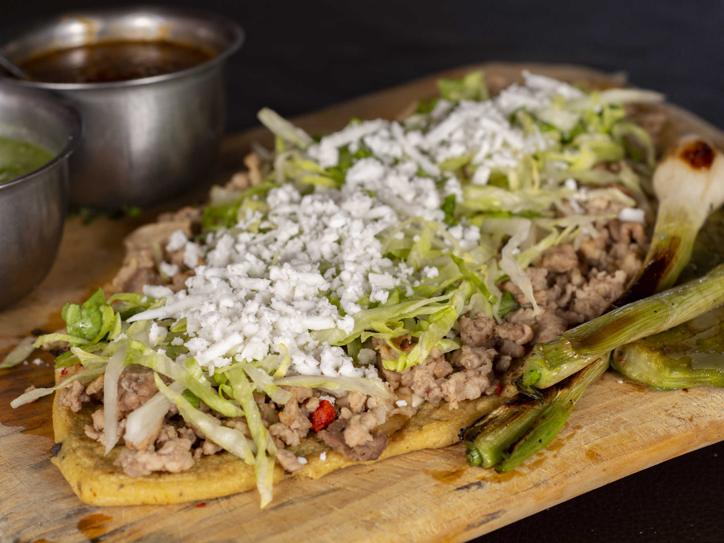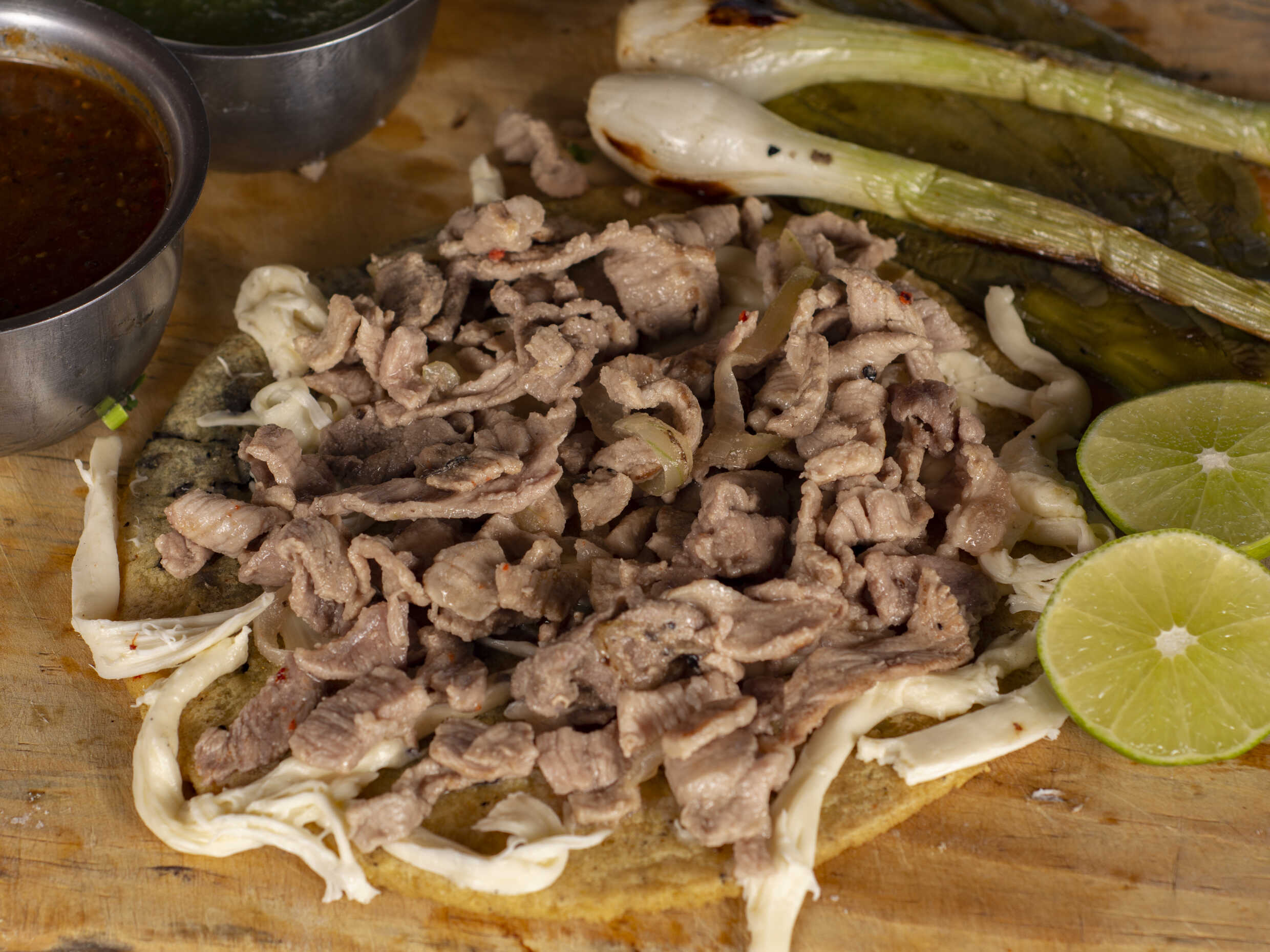 Chicharrón prensado con cebolla, cilantro y queso Oaxaca, elige tu salsa.