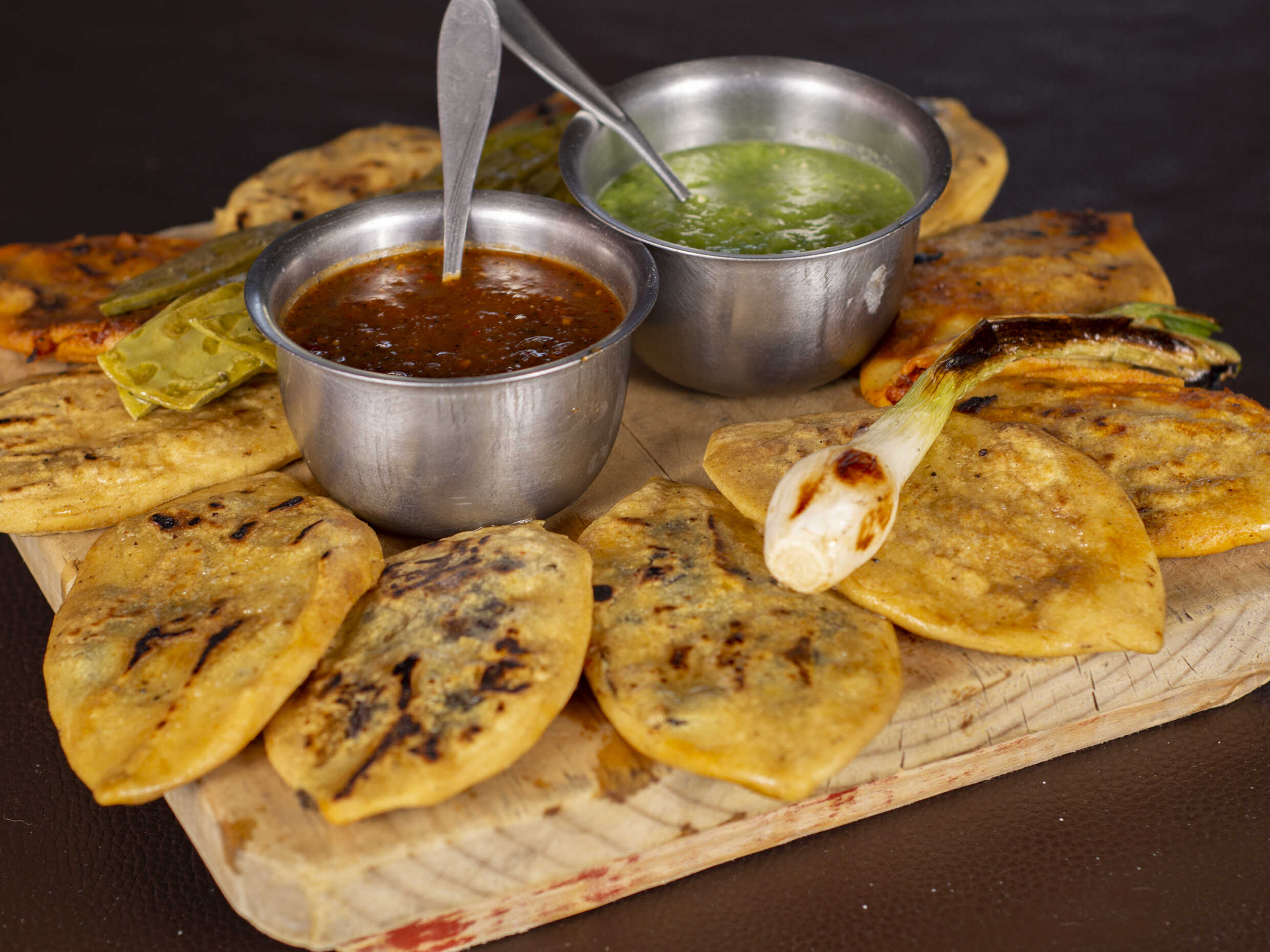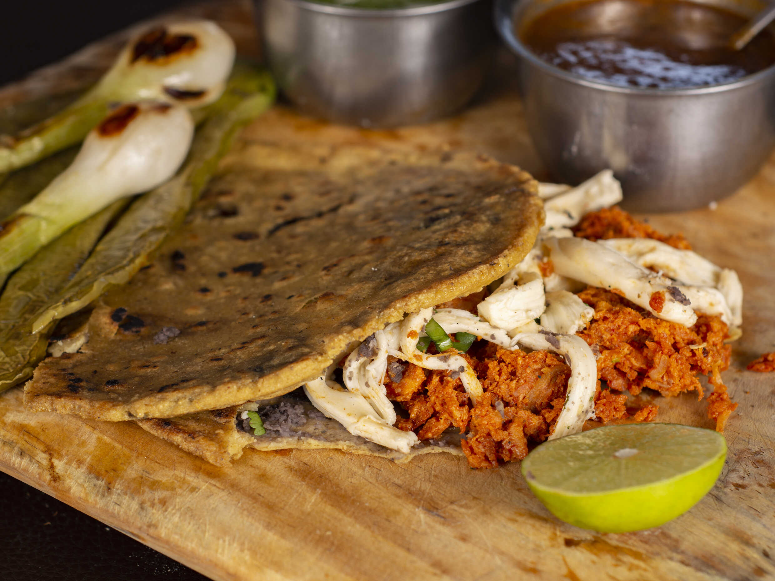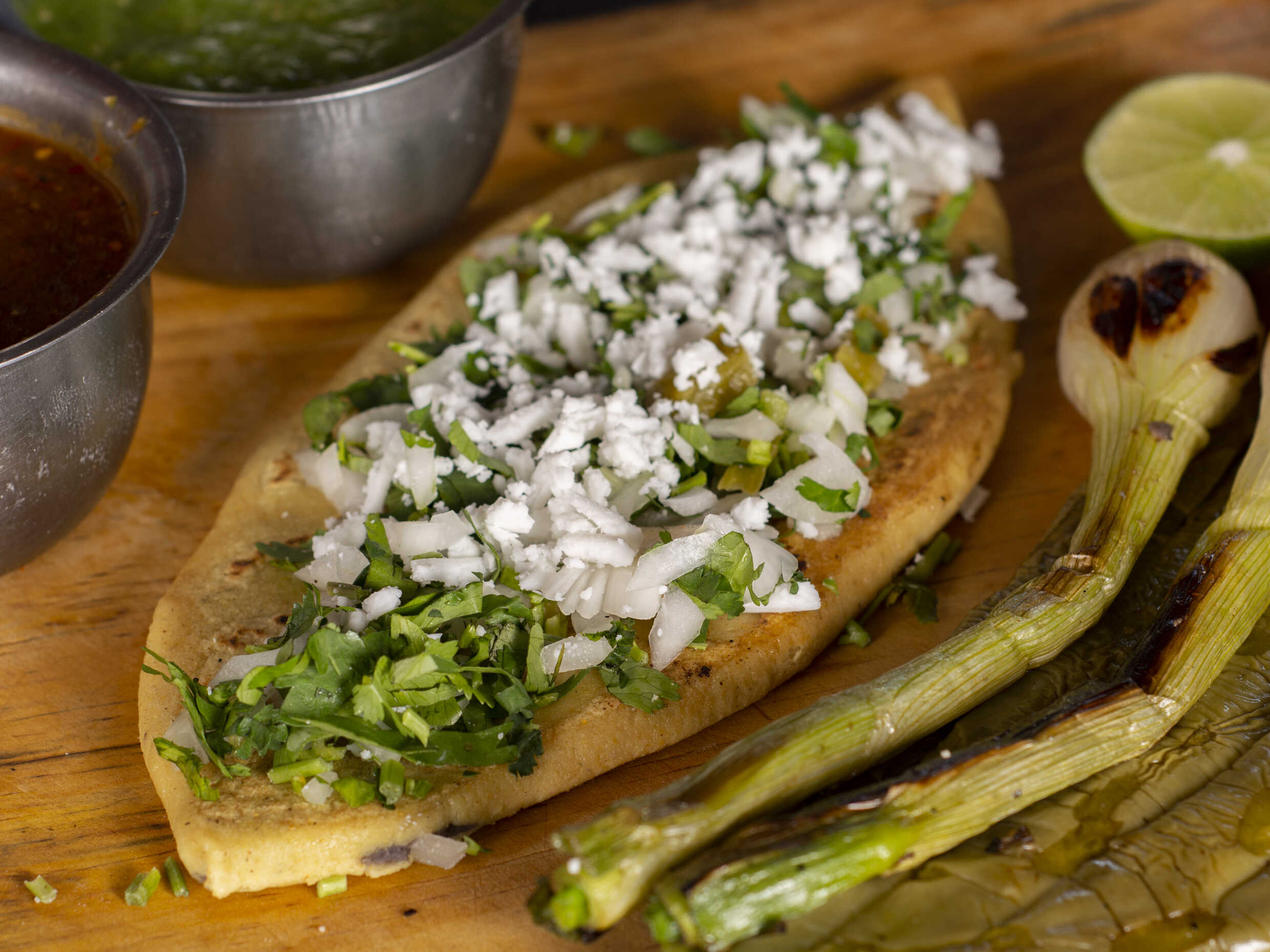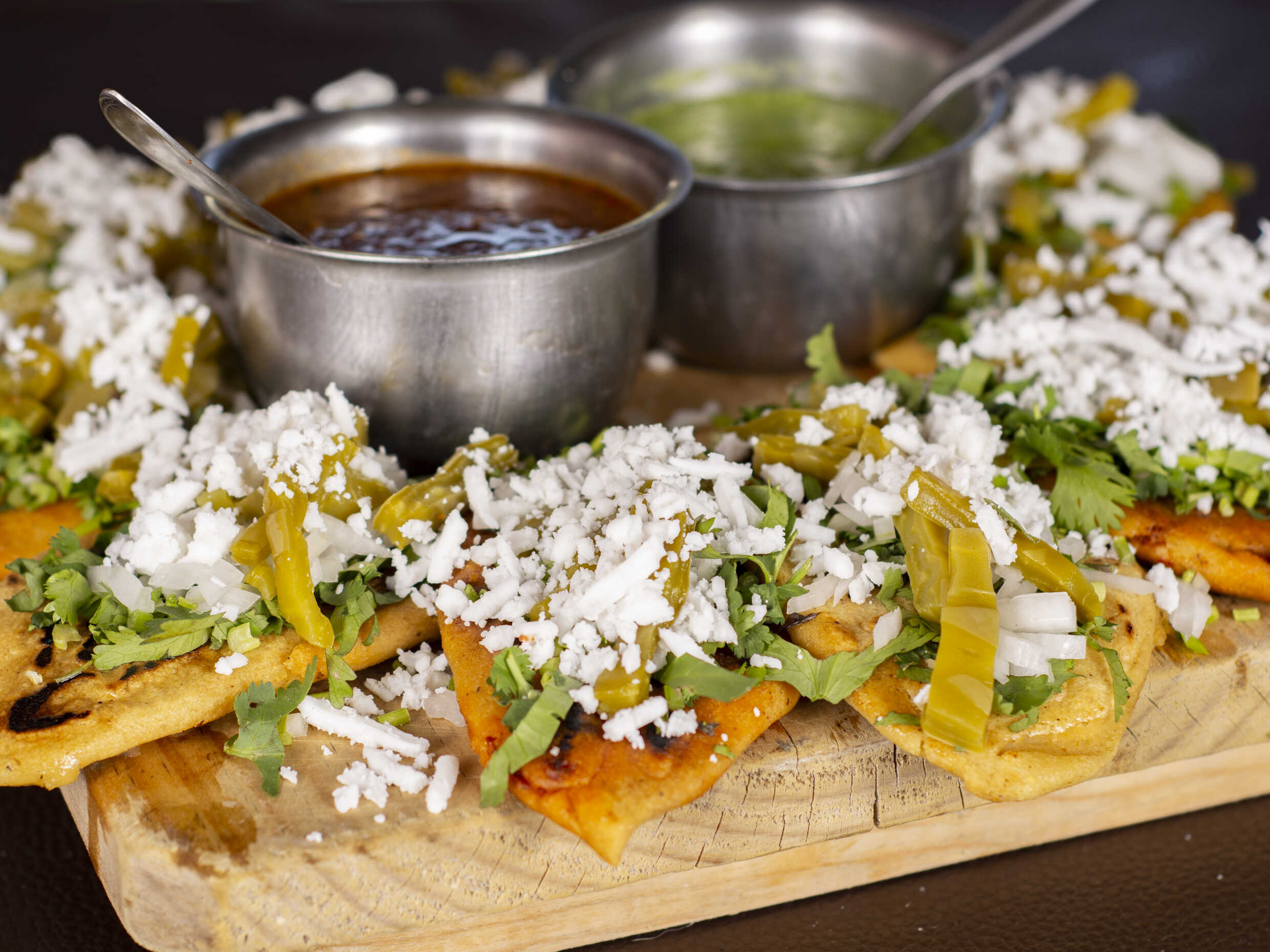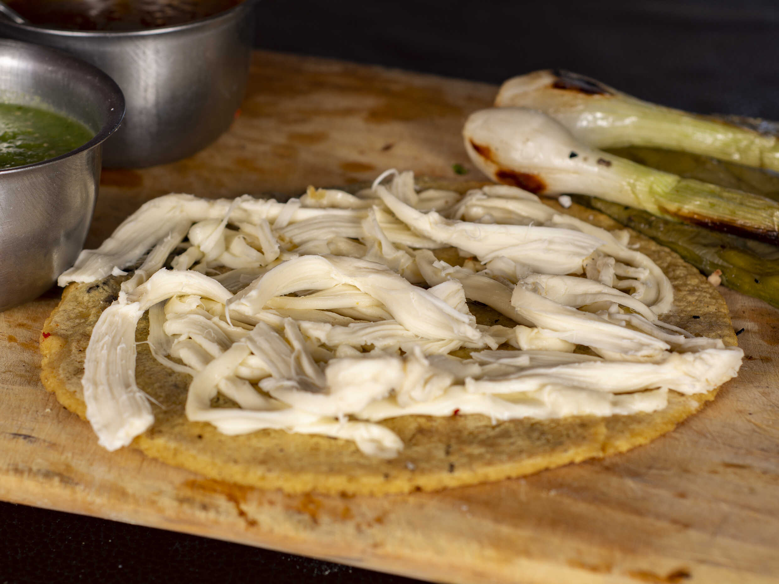 Chicharrón prensado con cebolla, cilantro y queso Oaxaca, elige tu salsa.