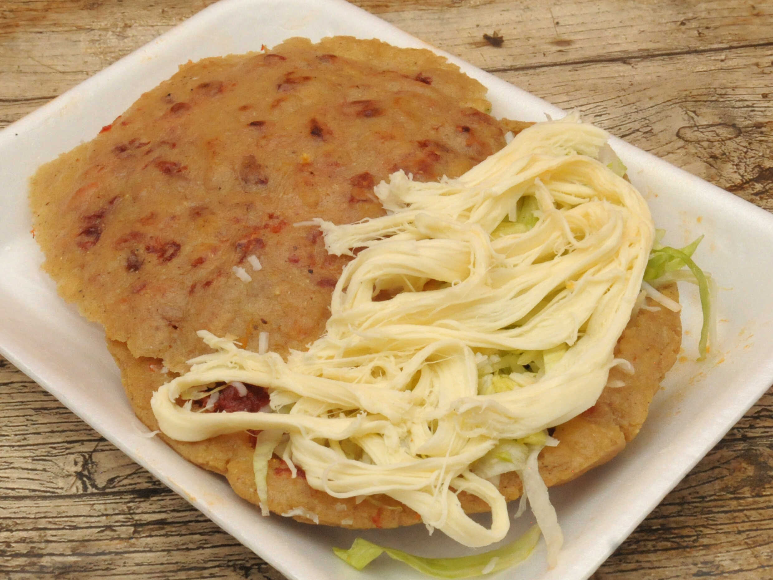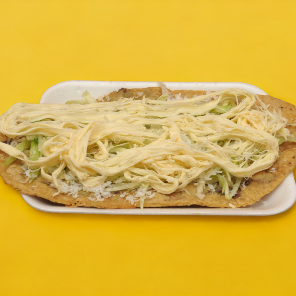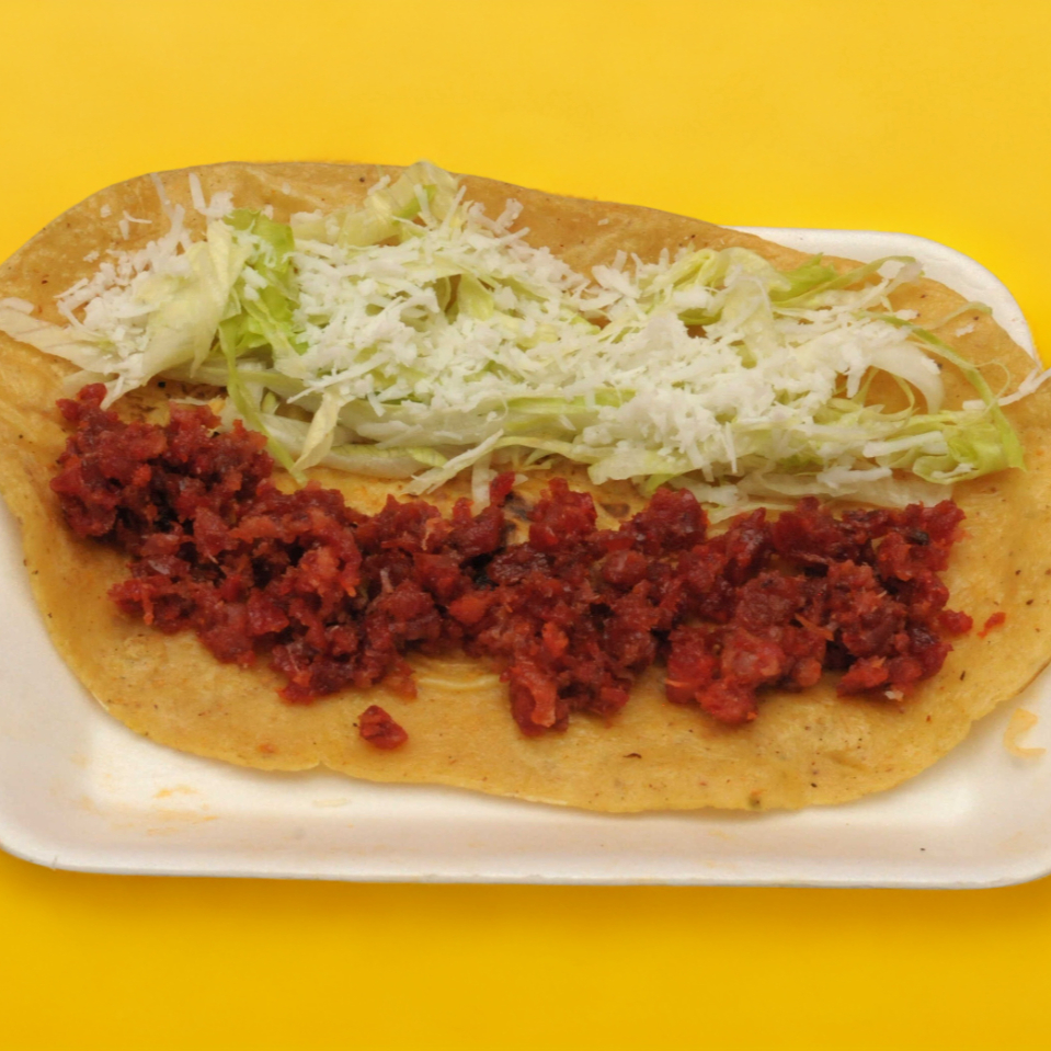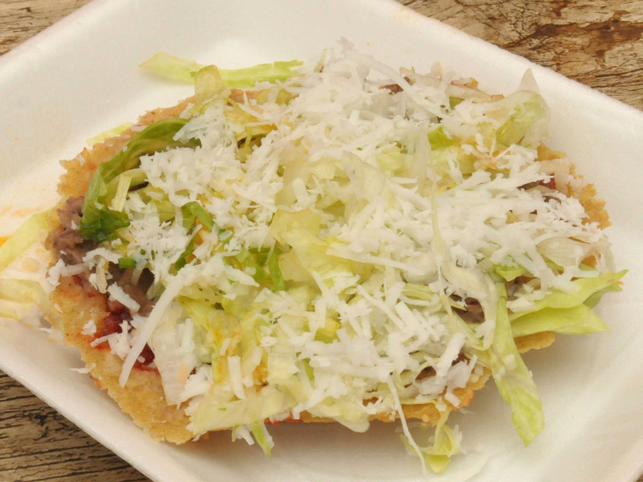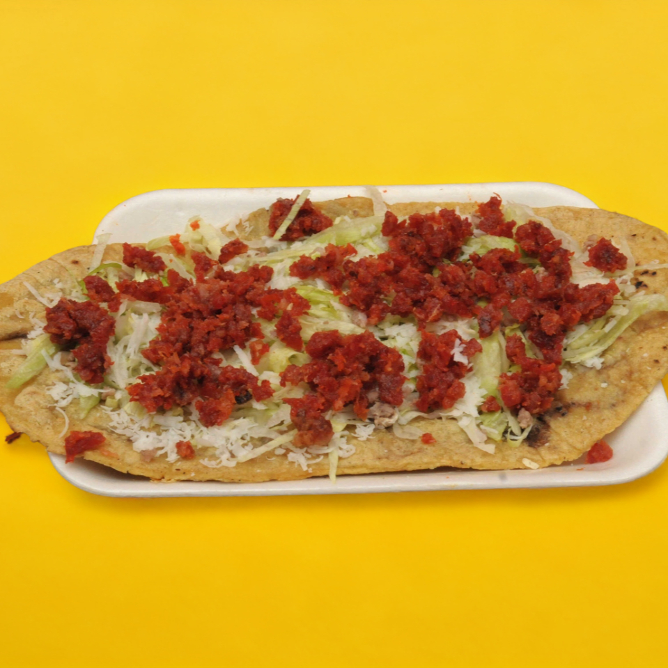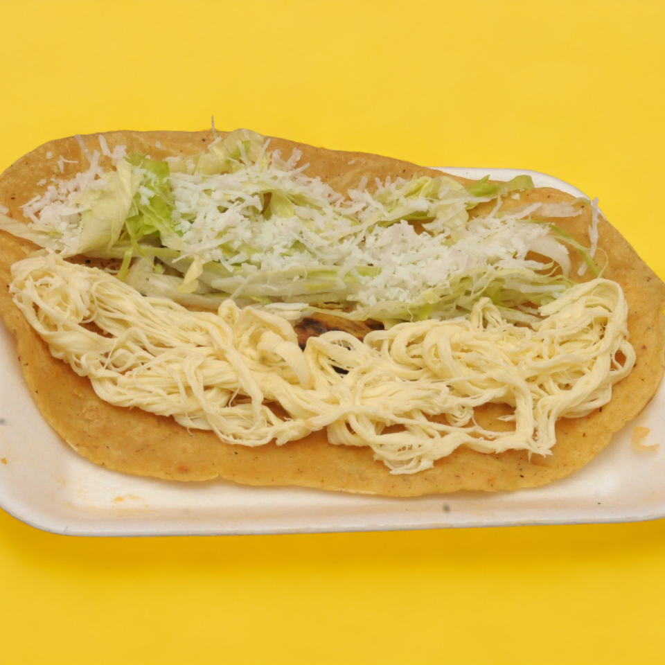 Lleva chicharrón, lechuga, queso cebolla y salsa o cilantro, cebolla y queso