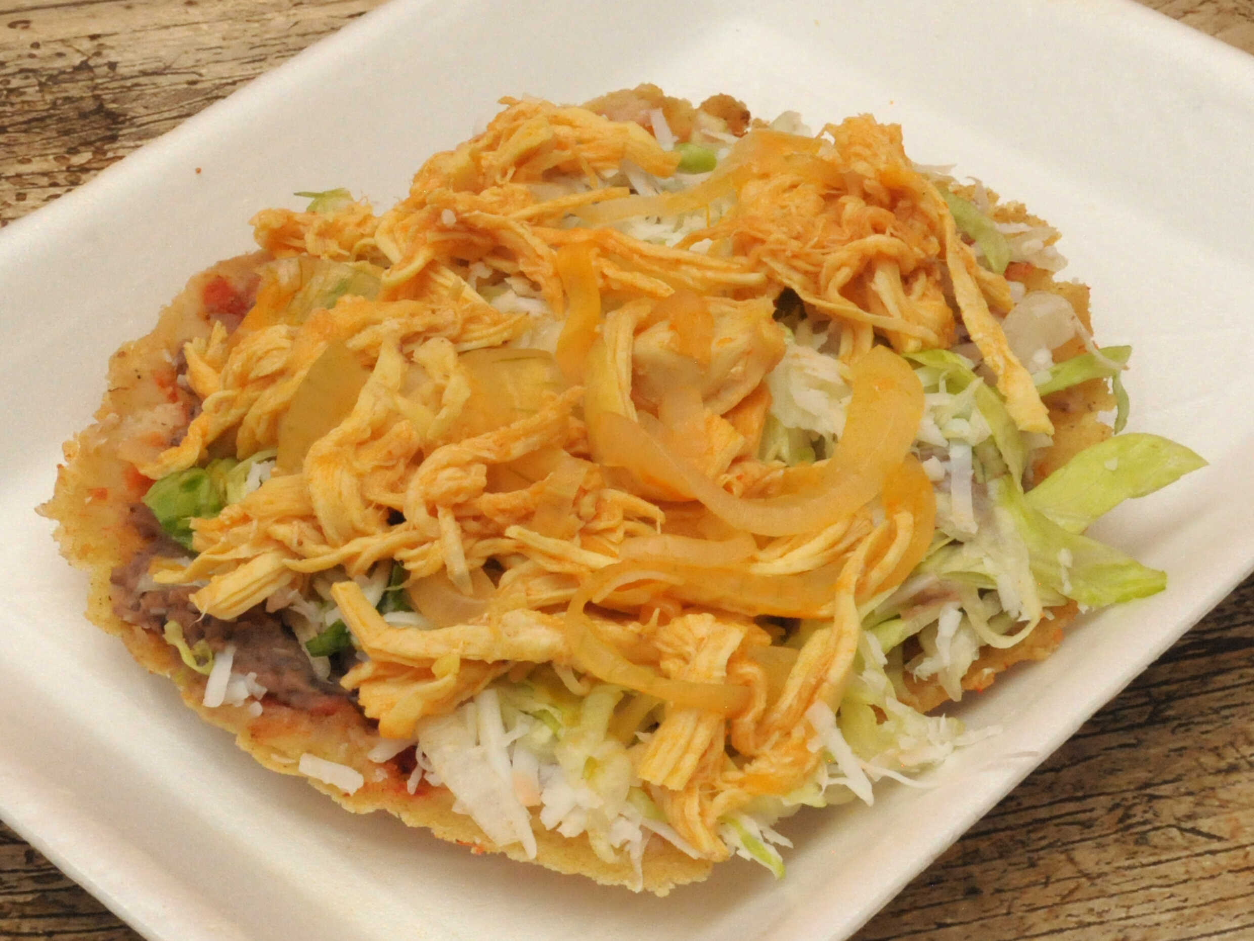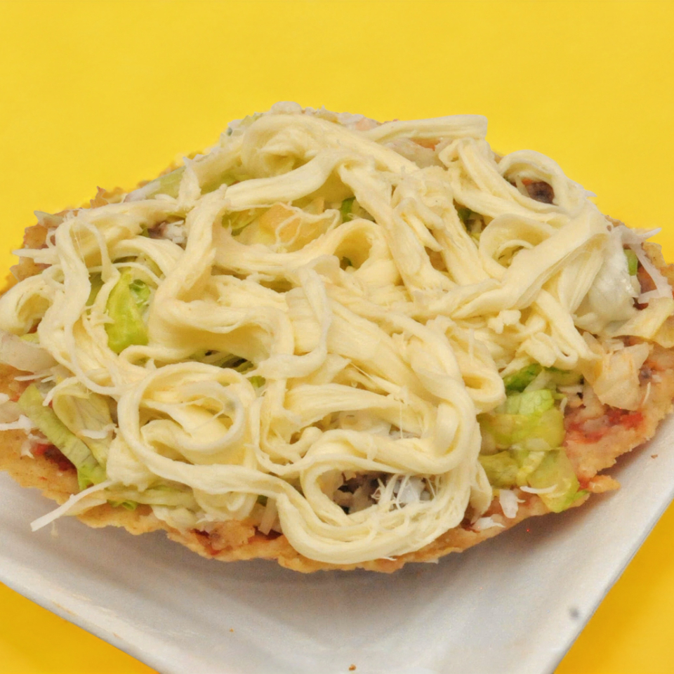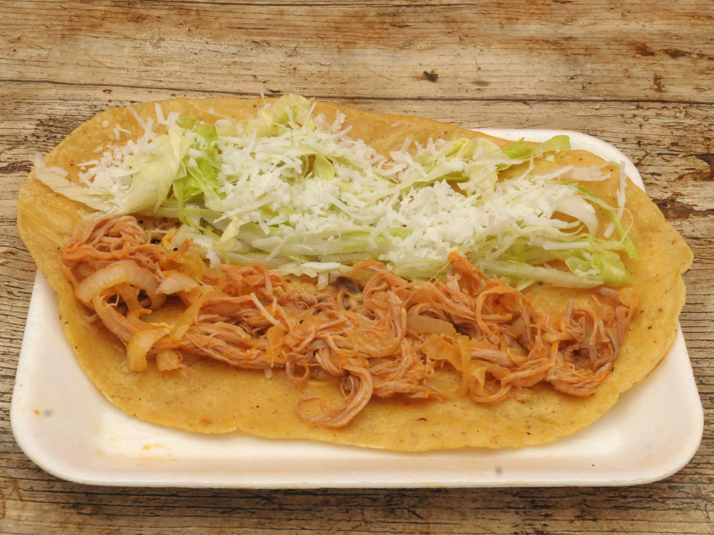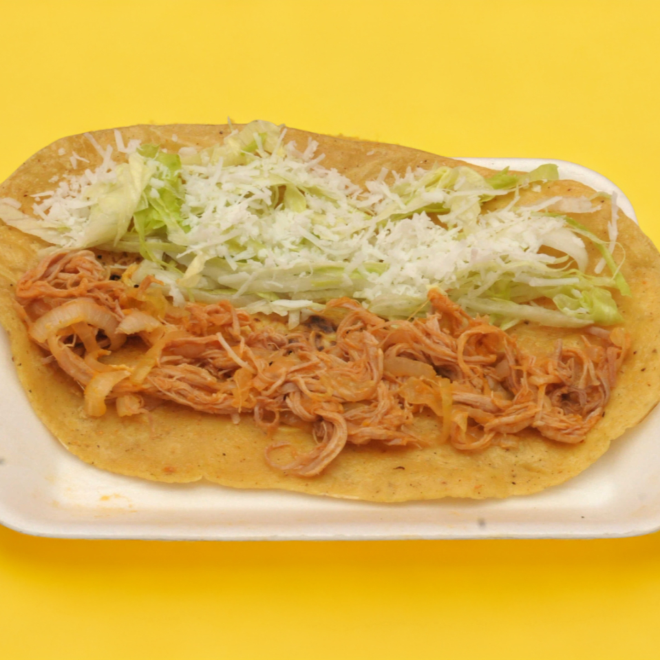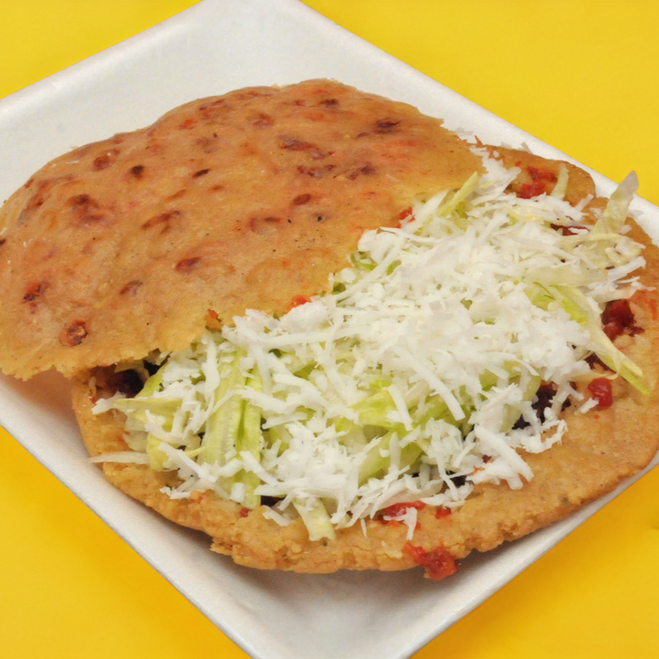 Lleva chicharrón, lechuga, queso cebolla y salsa o cilantro, cebolla y queso