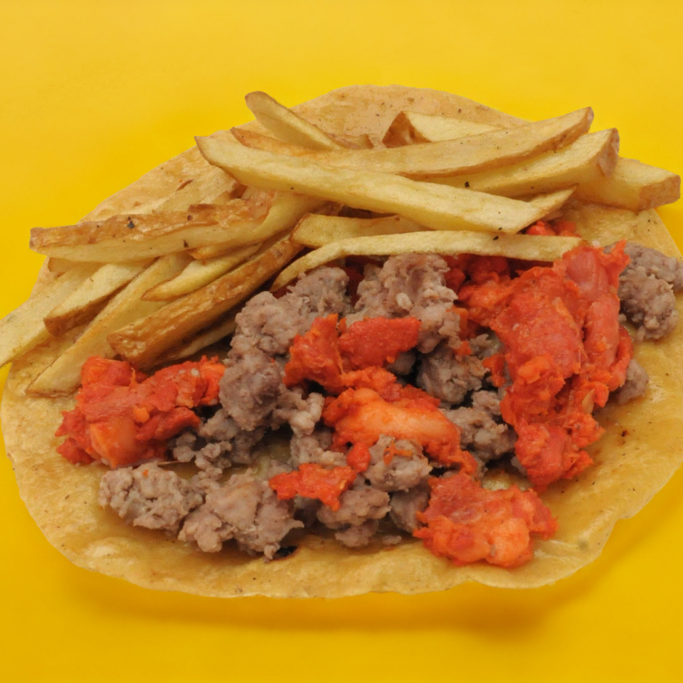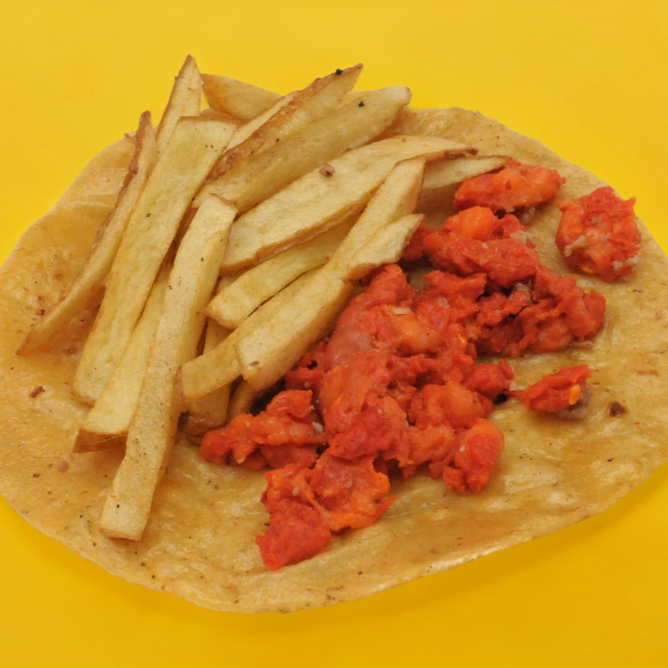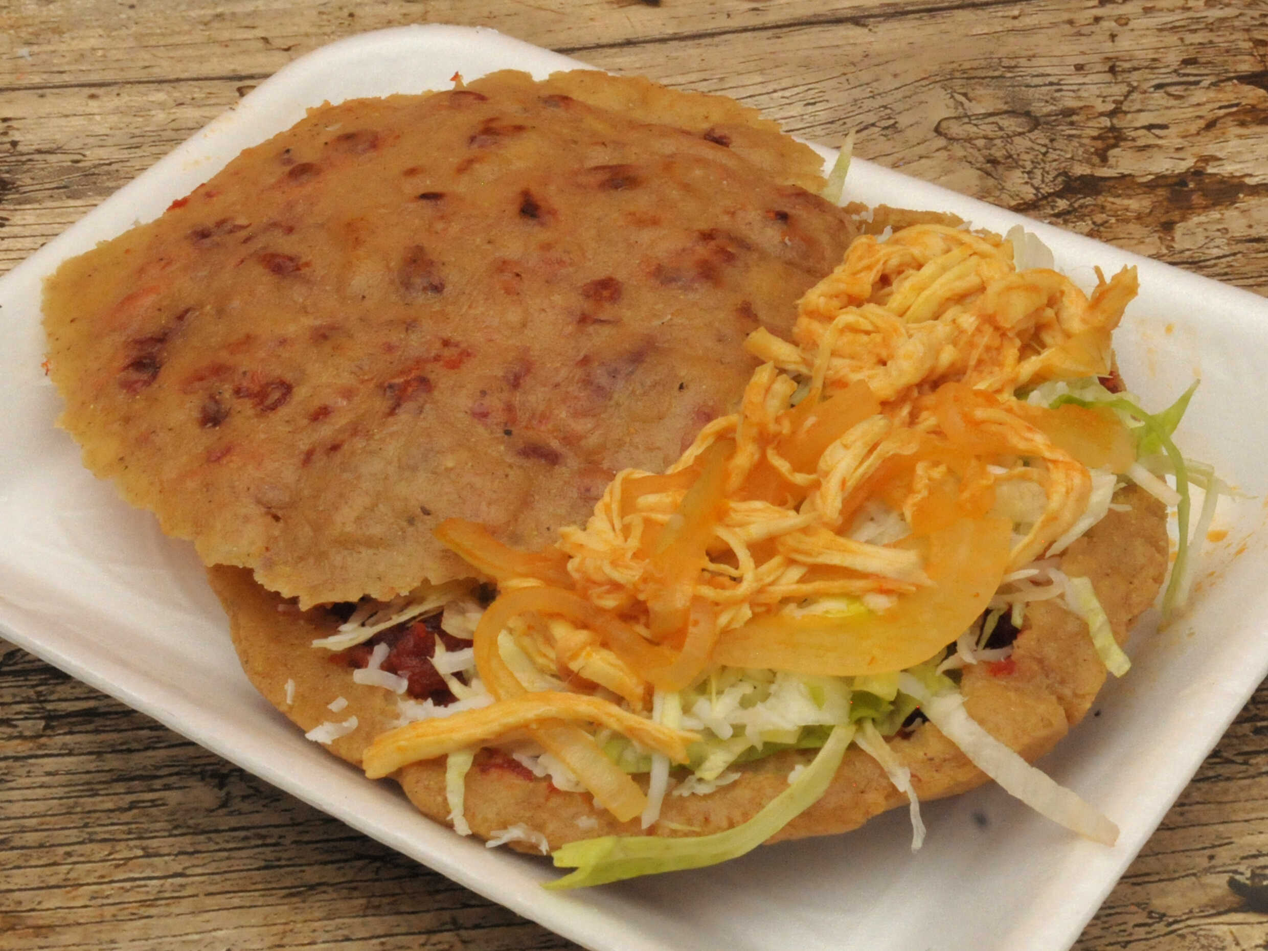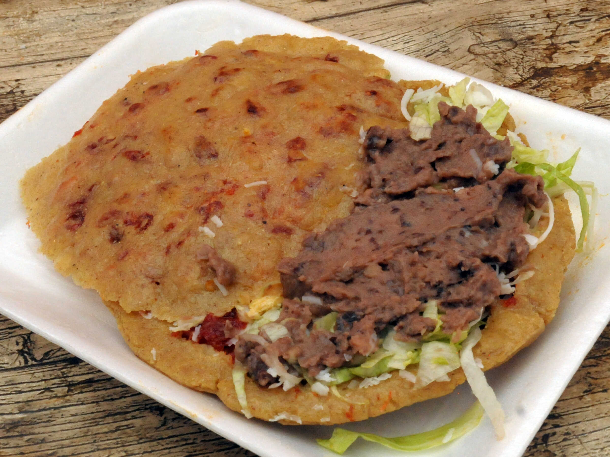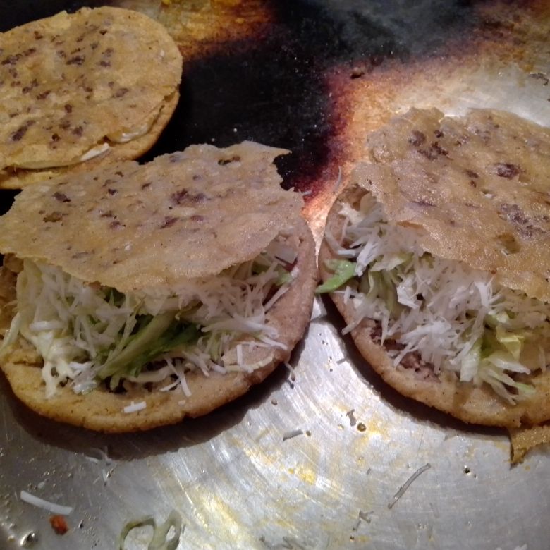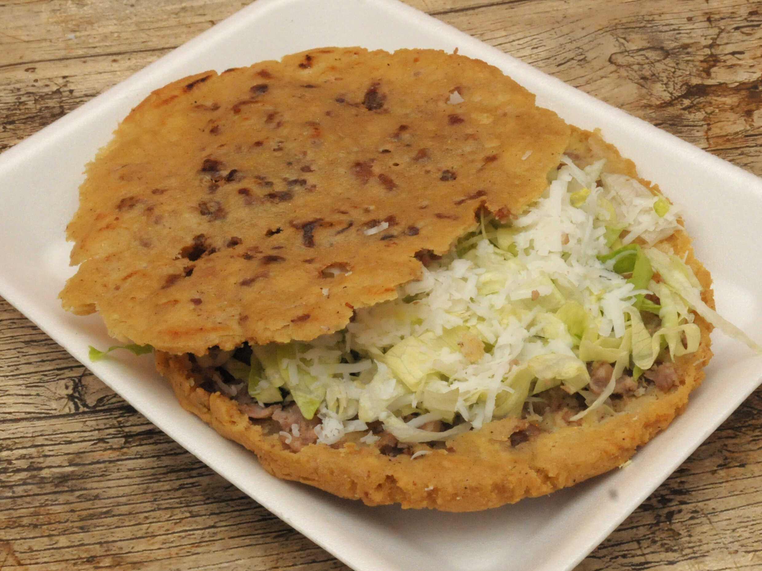 Lleva chicharrón, lechuga, queso cebolla y salsa o cilantro, cebolla y queso