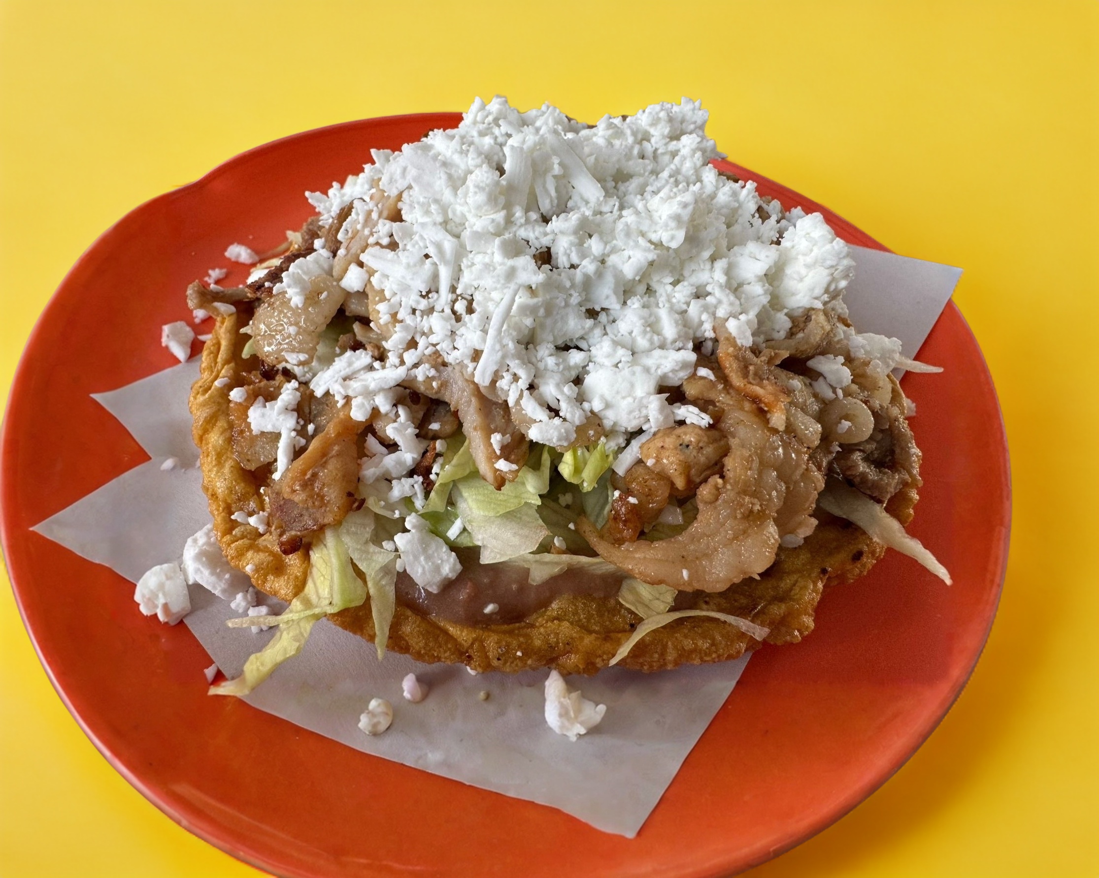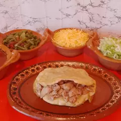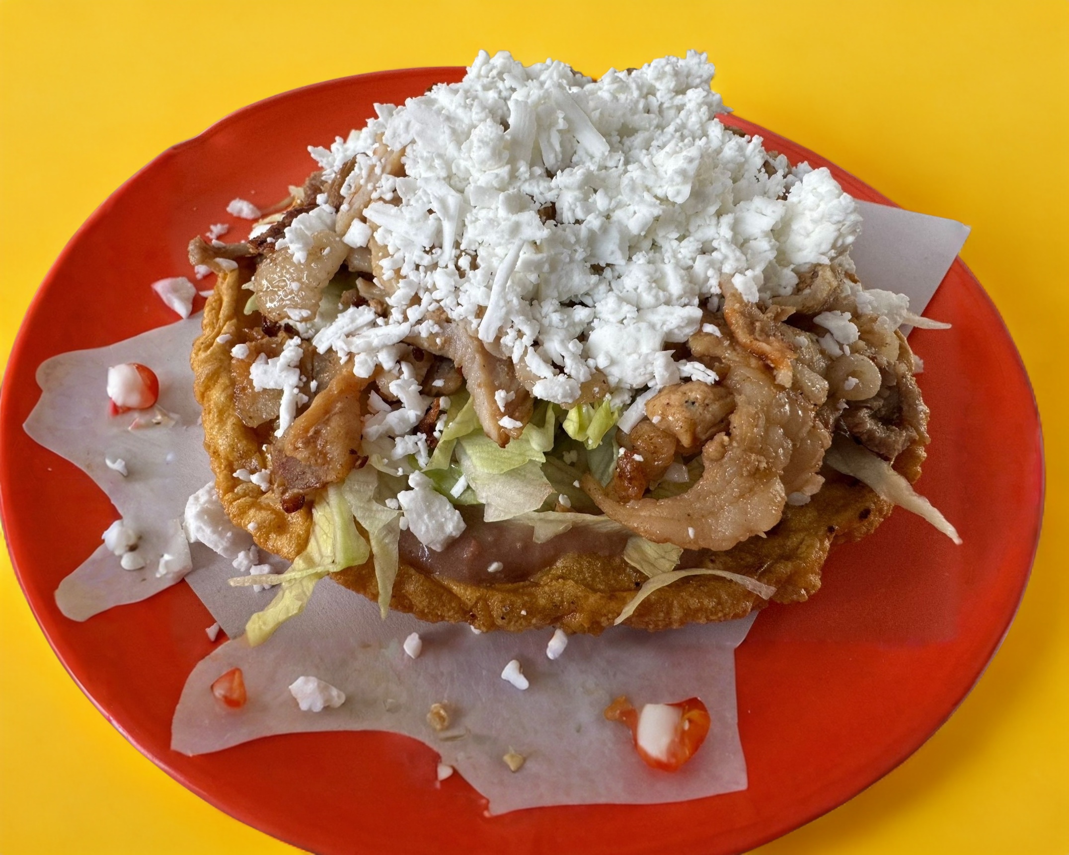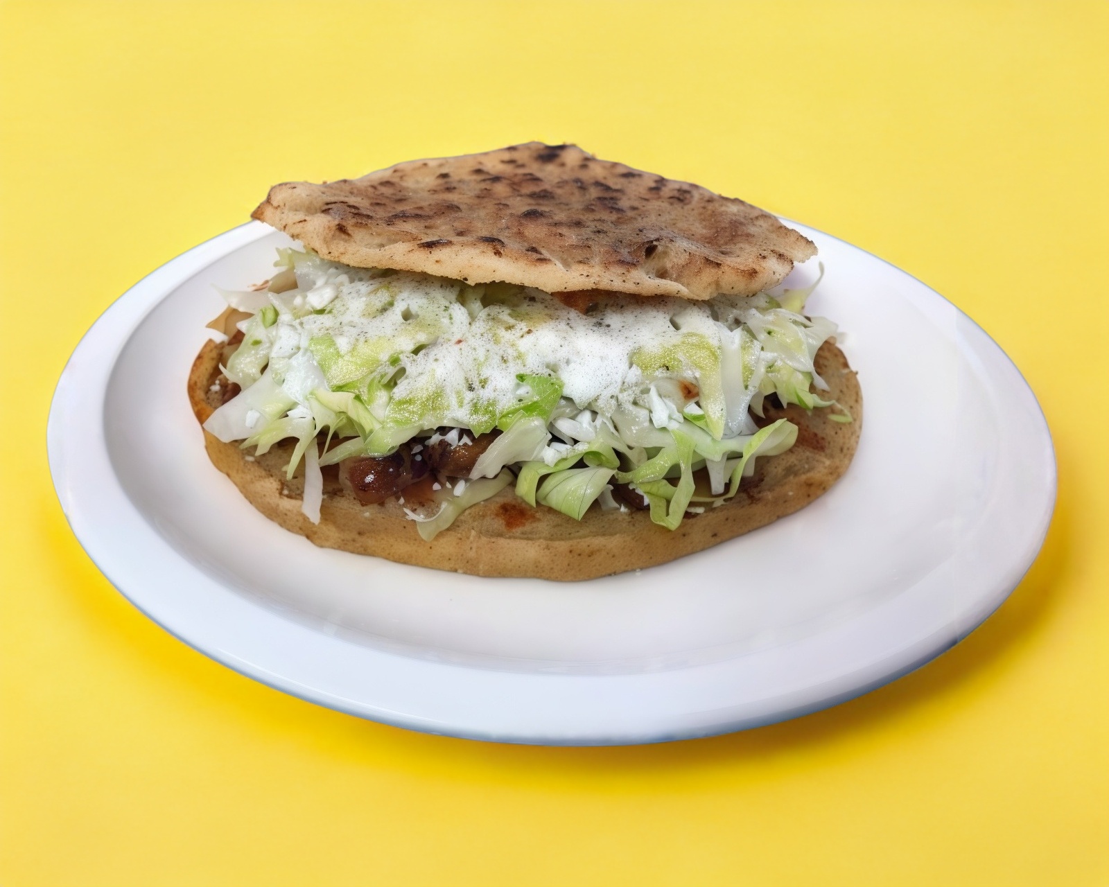 Gordita de chicharrón con bistec, chorizo, quesillo, cebolla, cilantro, lechuga y queso rallado.