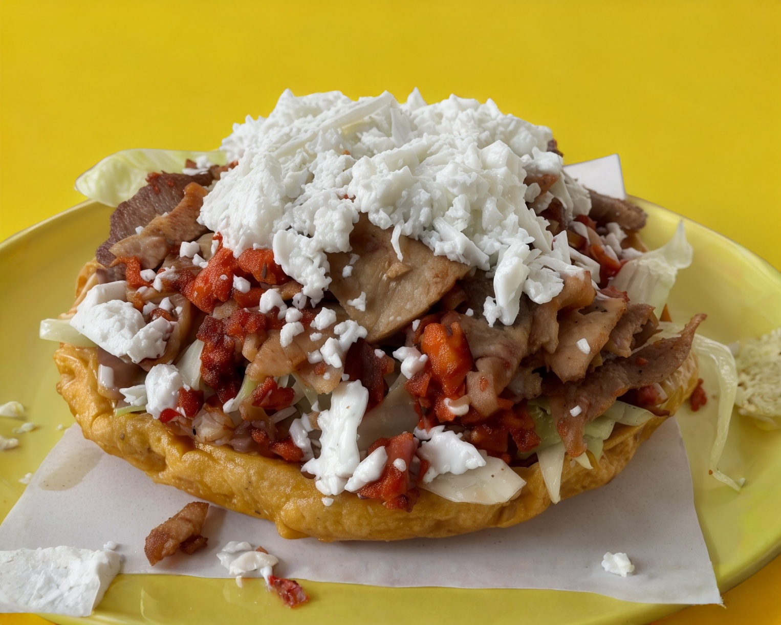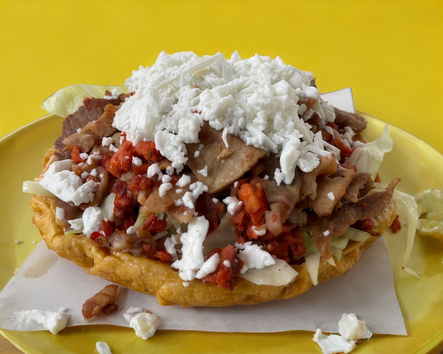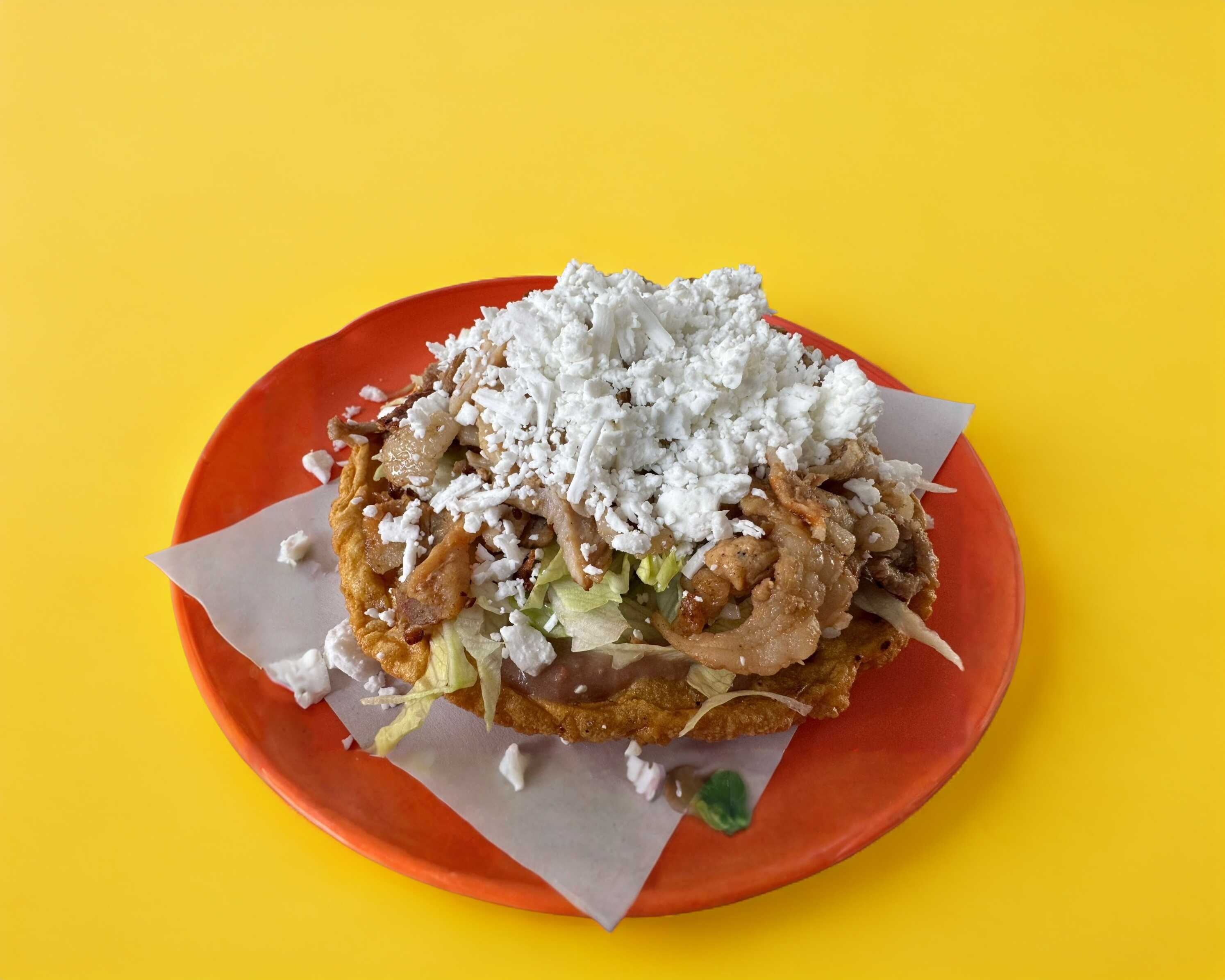 Gordita de chicharrón con bistec, chorizo, quesillo, cebolla, cilantro, lechuga y queso rallado.