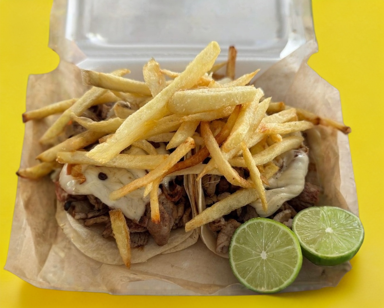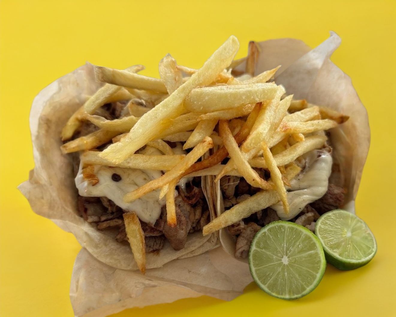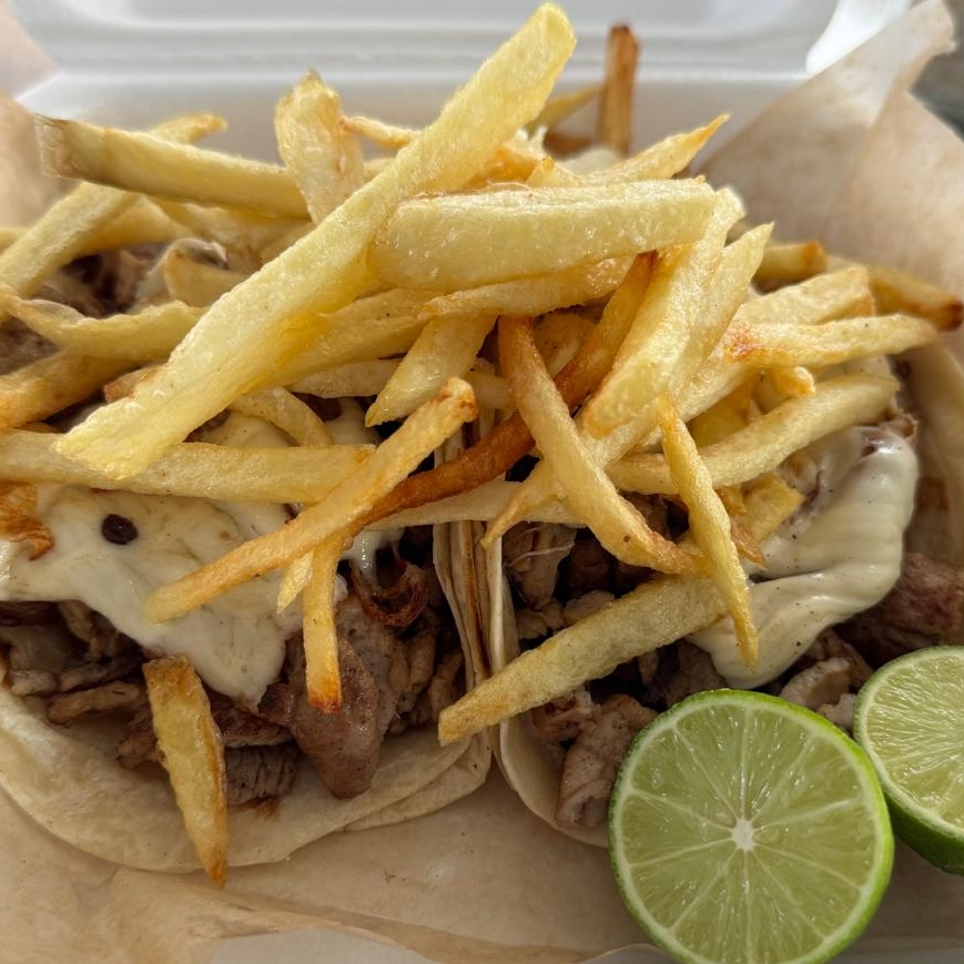 2 Tacos de bistec en tortilla de harina con quesillo y una guarnición de papas a la francesa.